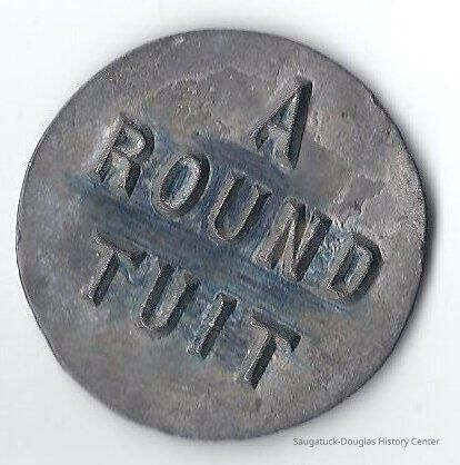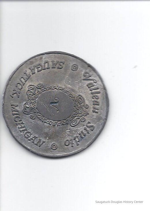 Round 1 3/4" pewter-appearing medallion advertising the Valleau Studio of Saugatuck with Rococo eschutcheon with letter V at center. "A Round Tuit" on reverse.Collection