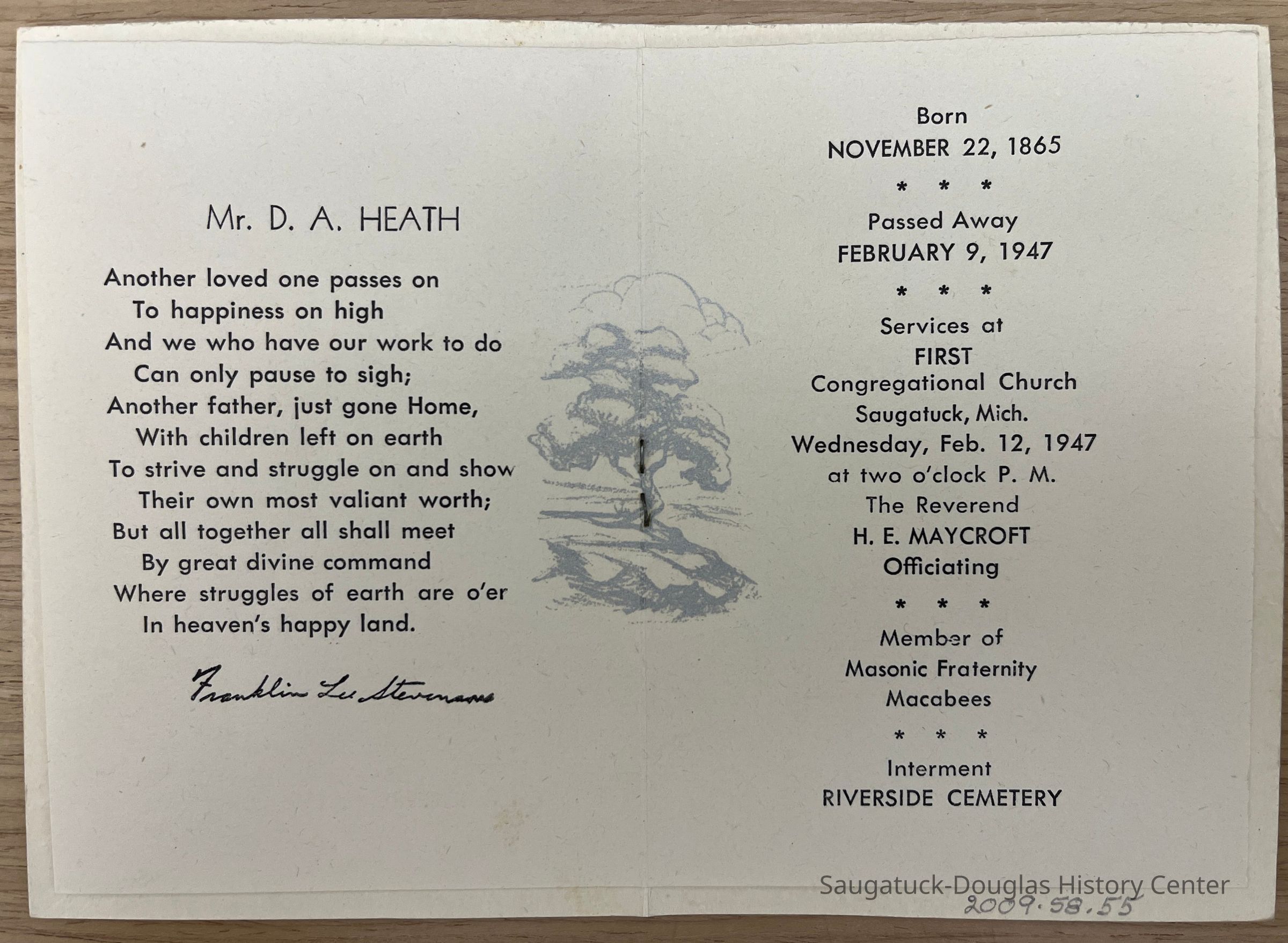 Funeral Remembrance of D.A. "Doc" Heath - husband of May Heath. Feb. 12, 1947Collection