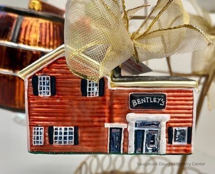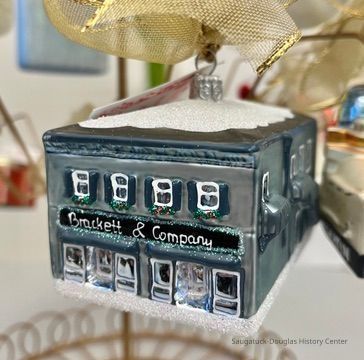 Gold-colored, wire "tree" displaying the City of Douglas' collection of eighteen Christmas tree ornaments that depict landmarks in the Saugatuck and Douglas area.