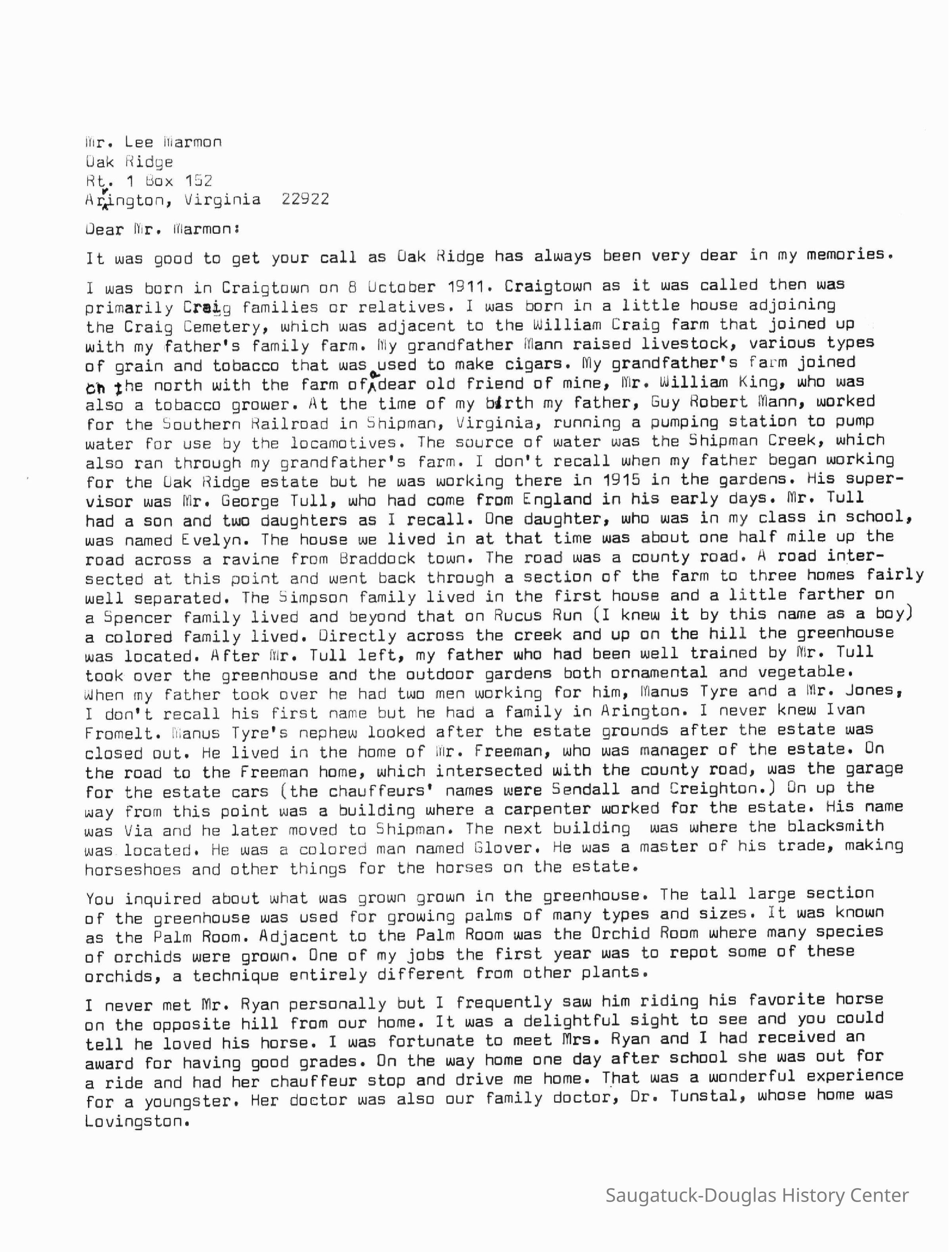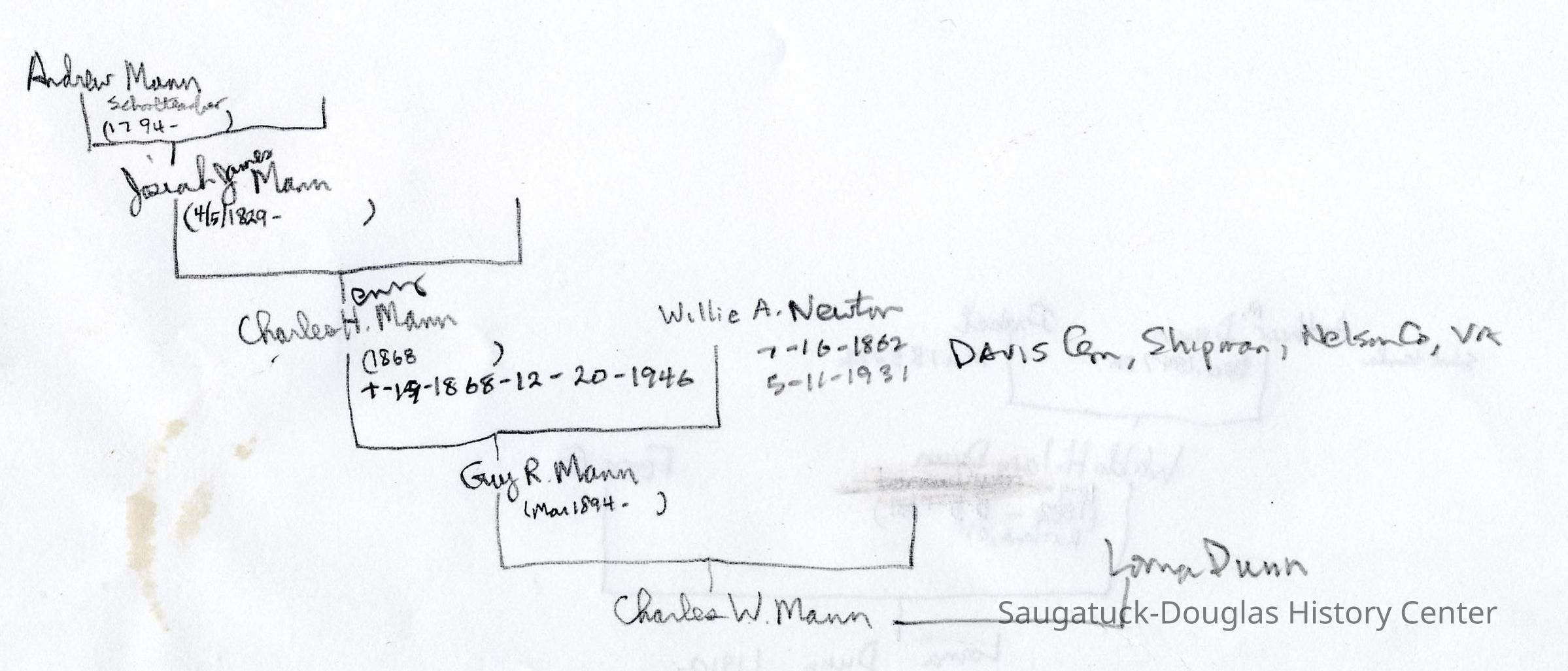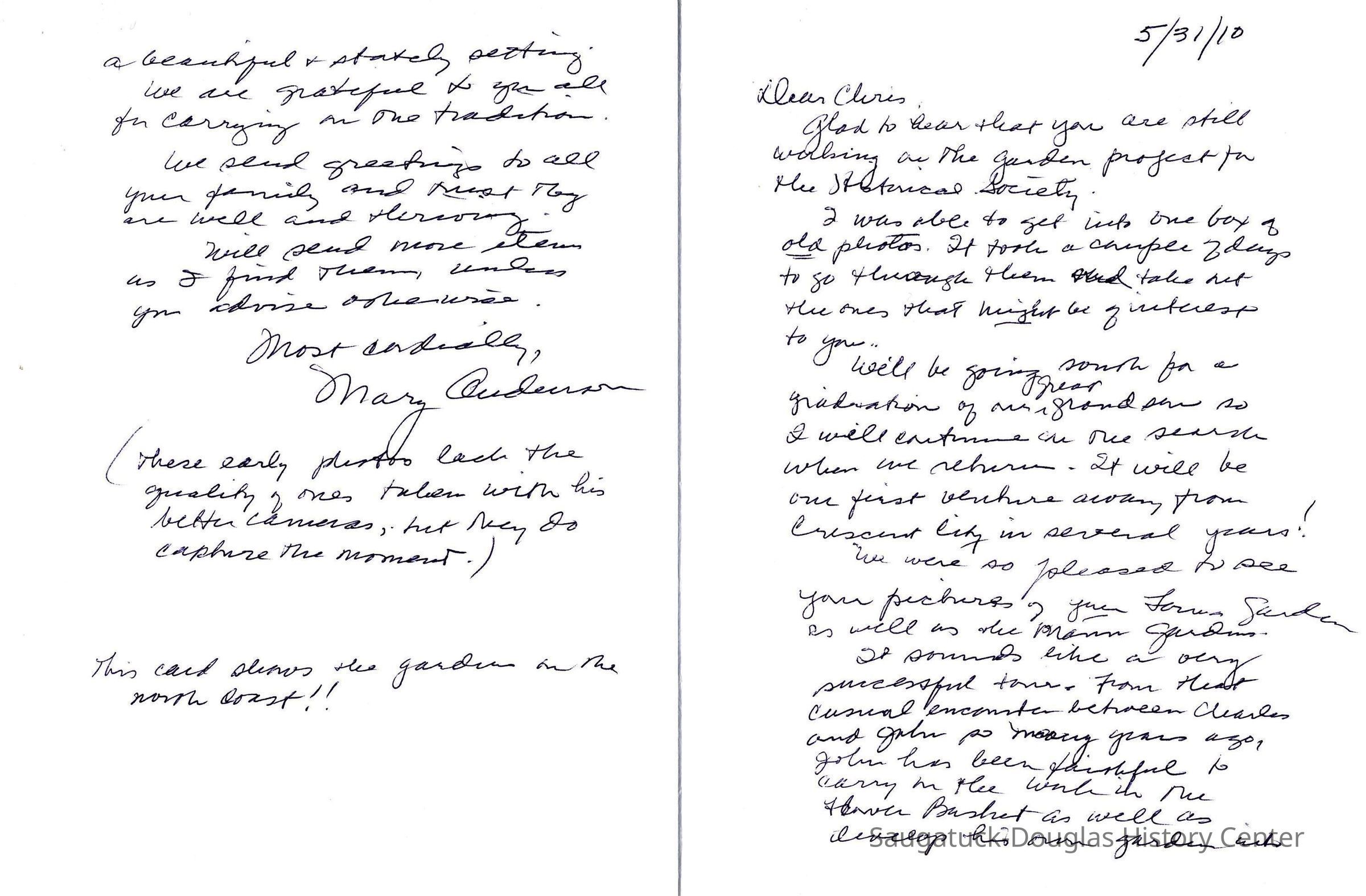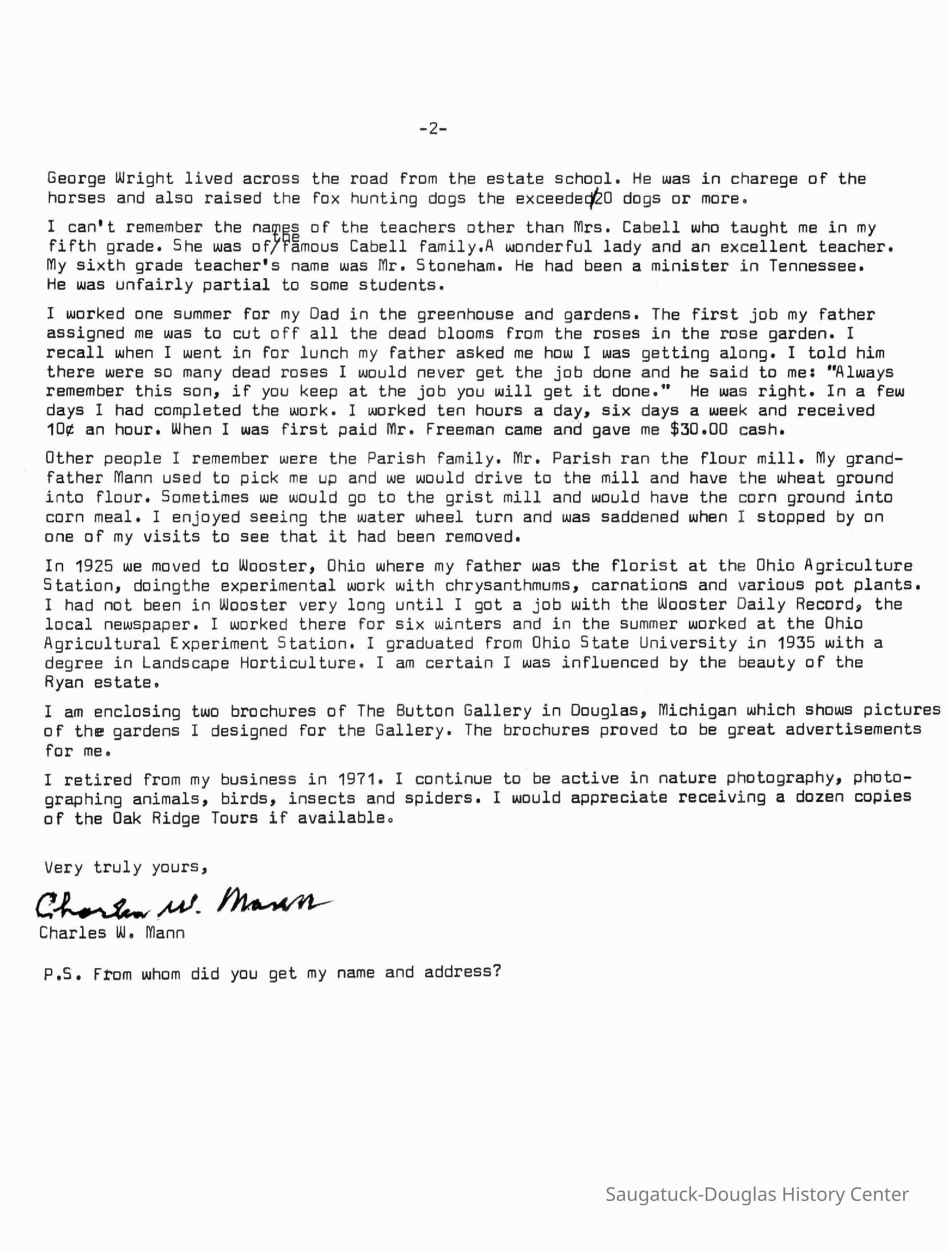 Digital scans of photos of horticulturalist Charles "Charlie" Mann, his spouse Lorna (Dunn) Mann, Dunn and Mann family trees, the gardeners who worked on the "Flower Basket" Mann property, newspaper clipping and photos of Lorna's parents Waldo and Fern Dunn and letters written by or about Charles Mann.Photograph Details