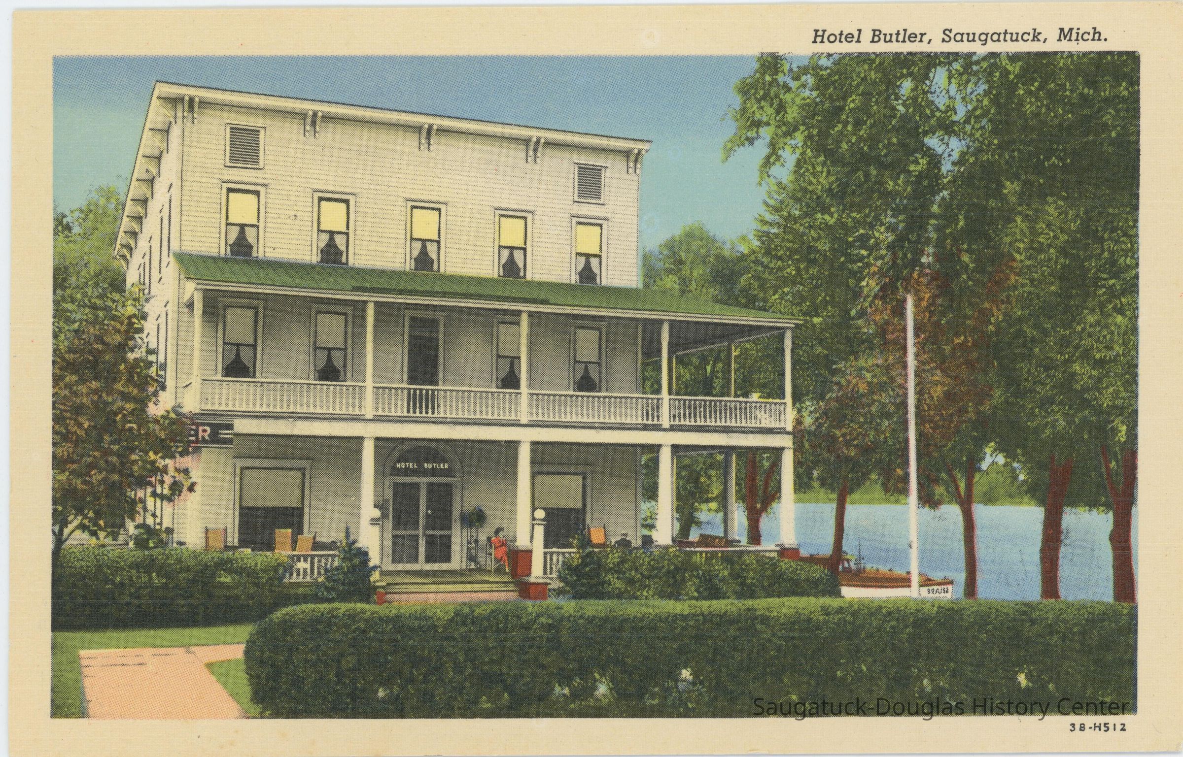 A color postcard showing the Hotel Butler from the front. A wrap around porch with an above balcony decorate the first two floors of the building. A woman sit by the front door. A boat can be seen docked behind the hotel.Subject