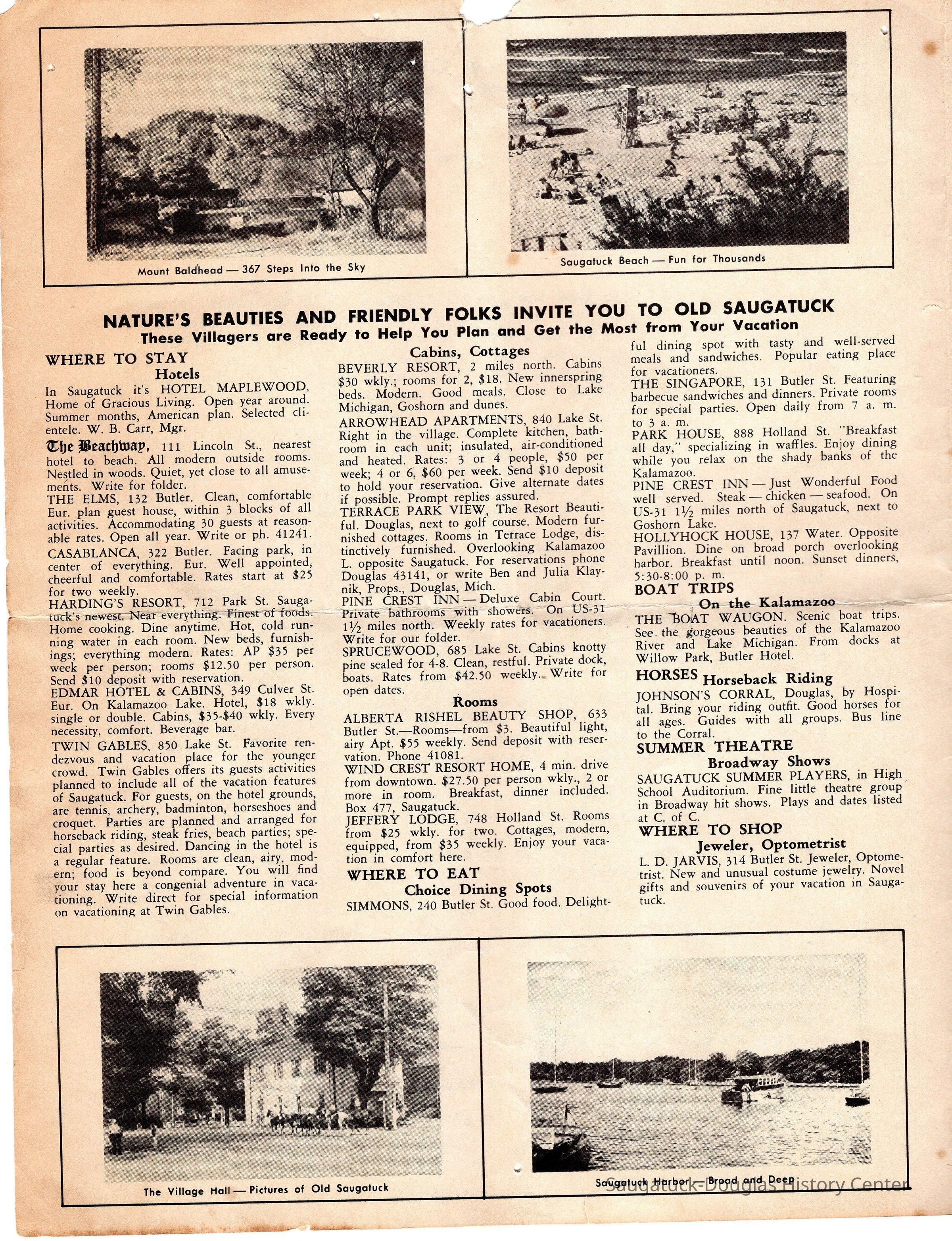3. "Nature's beauties and friendly folks invite you to old Saugatuck" information page listing "where to stay" including street addresses for the Hotel Maplewood, The Beachway, The Elms, Casablanca, Harding's Resort, Edmar, Twin Gables, Beverly Resort, Arrowhead, Terrace Park View, Pine Crest Inn, Sprucewood, Alberta Rishel Beauty Shop, Wind Crest Resort Home, Jeffery Lodge and "where to eat" listing Simmons, The Singapore, Park House, Pine Crest Inn, Hollyhock House. Also listed Waugon boat trips, Johnson's Corral for horseback riding, Saugatuck Summer Players at high school auditorium and L.D. Jarvis jeweler and optometrist.