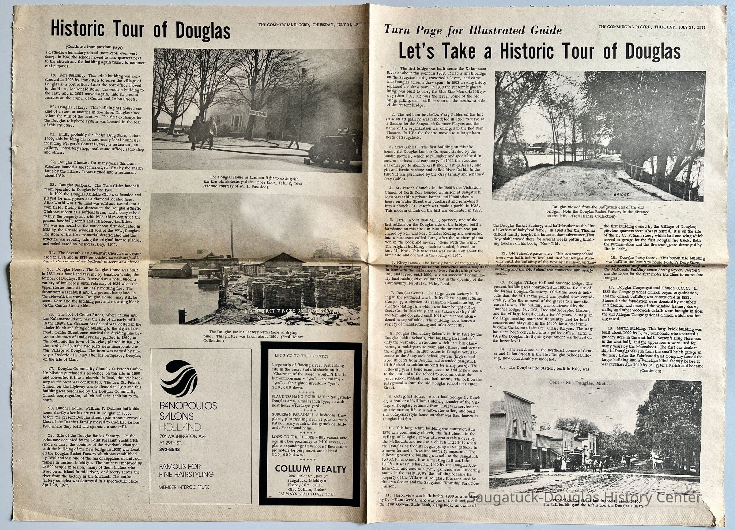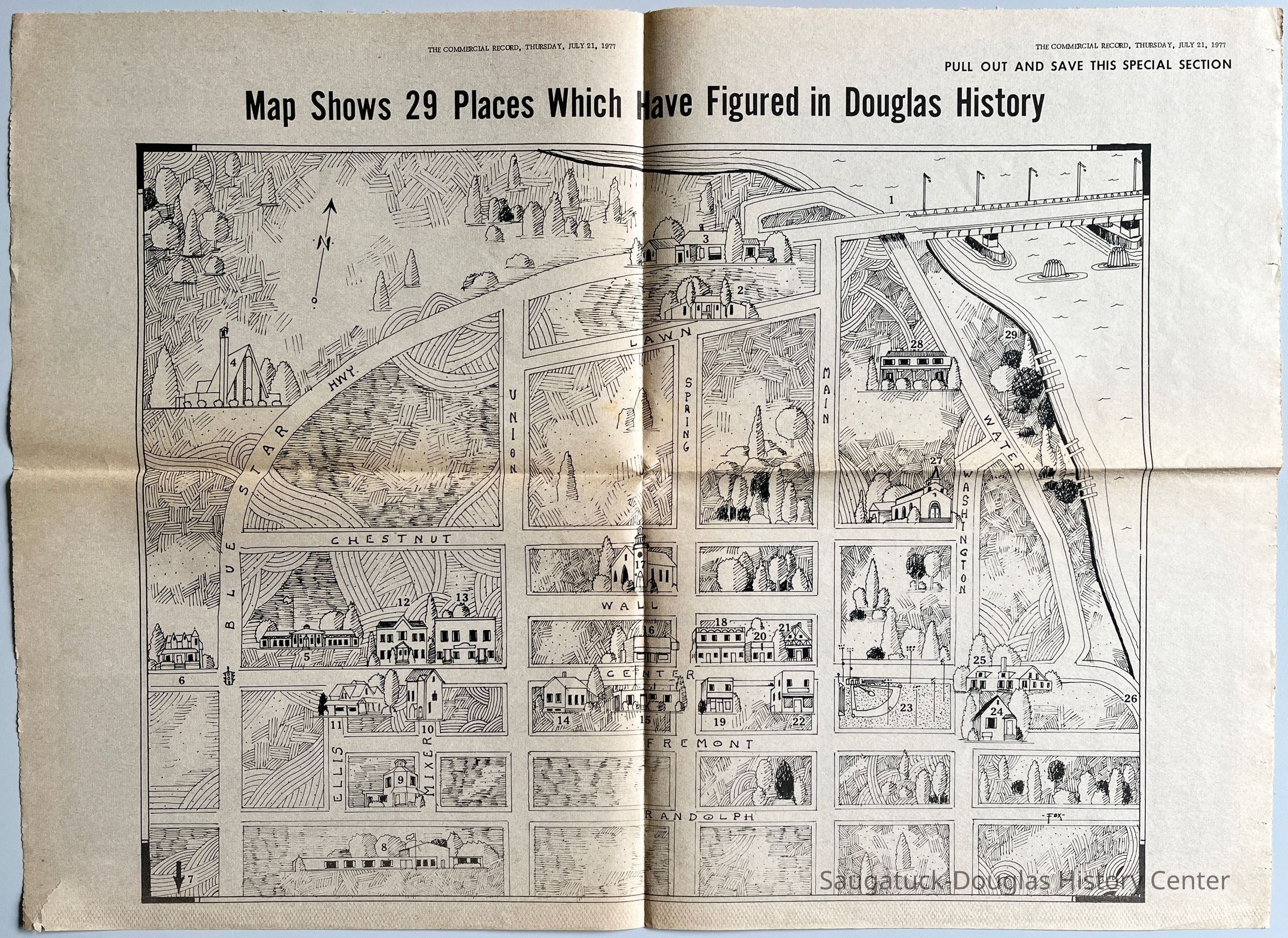 Fox, John Martin "Johnny", Bridge, Swing and Causeway 1902/Drawbridge 1870 or 1868, J.Petter/Joyce Petter Gallery/161 BSHwy/Gray Gables/River Guild, Upscale Merchantile/161 N. Blue Star/Saugatuck Summer Players theater, St. Peter Catholic Church, Tara Restaurant/Spencer House/200 Center, Haworth site/Haworth Plant/Chase Manufacturing, Douglas Elementary School 1957-, 90 Mixer/Octagon House, Ox-Bow House/Old Library/Douglas Athletic Clubhouse/Methodist Episcopal Church, Harborview/D. MIlton Gerber House, Dutcher Lodge building 1867-, 13 S Union St./Douglas School, 2nd, Douglas Police station/Standard Oil/Dyer Putnam store, 48 W Center/Respite Cappuccino Court/Mr. Miller's Art Emporium/Norton Drug Store, 56 Wall/Douglas United Church of Christ/Congregational Church 1883-, L.W. Mc Donald's People's Store/Gerber Building, Kerr Building 33 W. Center St., Happystance/8W Center/Chaps/Auction House/Douglas Cafe/Wiegert's Model Grocery, Everyday People Cafe/11W Center/Douglas Dinette/Walz or Waltz Meat Market, Beery Field/Douglas Athletic Field, Unity Lakeshore Church/Douglas Adventist Church, Greason School of Painting/Art school, 19 S. Washington/Douglas House and Tavern/Eagle Hotel/Wades Hotel, Wade's Bayou/Douglas Municipal Docks/Gerber Mill, Oak Manor/Dutcher House
