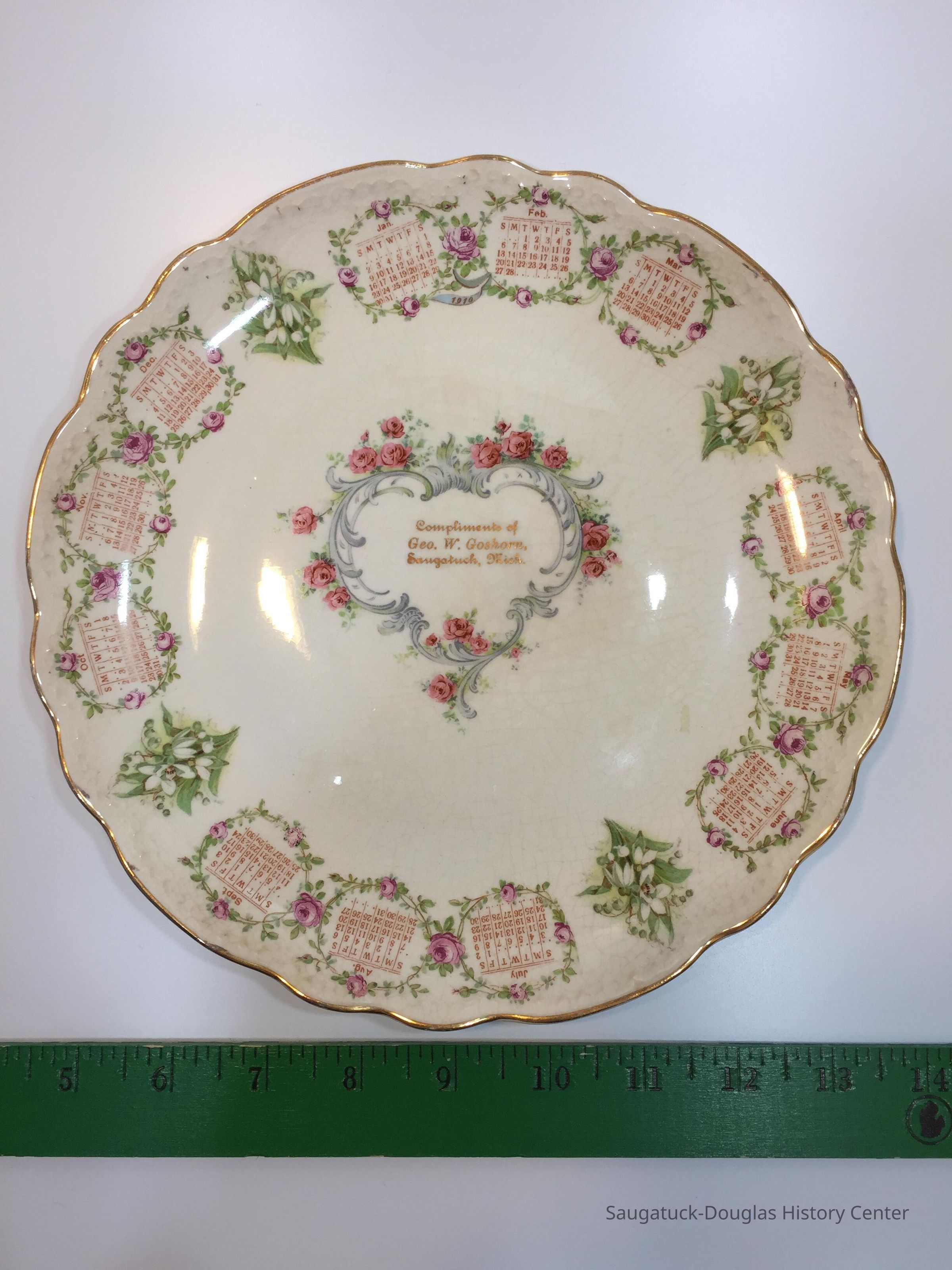 Soft paste ceramic plate with gold edge and embossed pattern. The edge of the plate is printed with for transfer images of snowdrops, and twelve rose wreaths. Each wreath encircles a monthly calendar from 1910. In the center of the plate a rose-strewn, rococo frame surrounds gold text that reads "Compliments of Geo. W. Goshorn, Saugatuck, Mich.