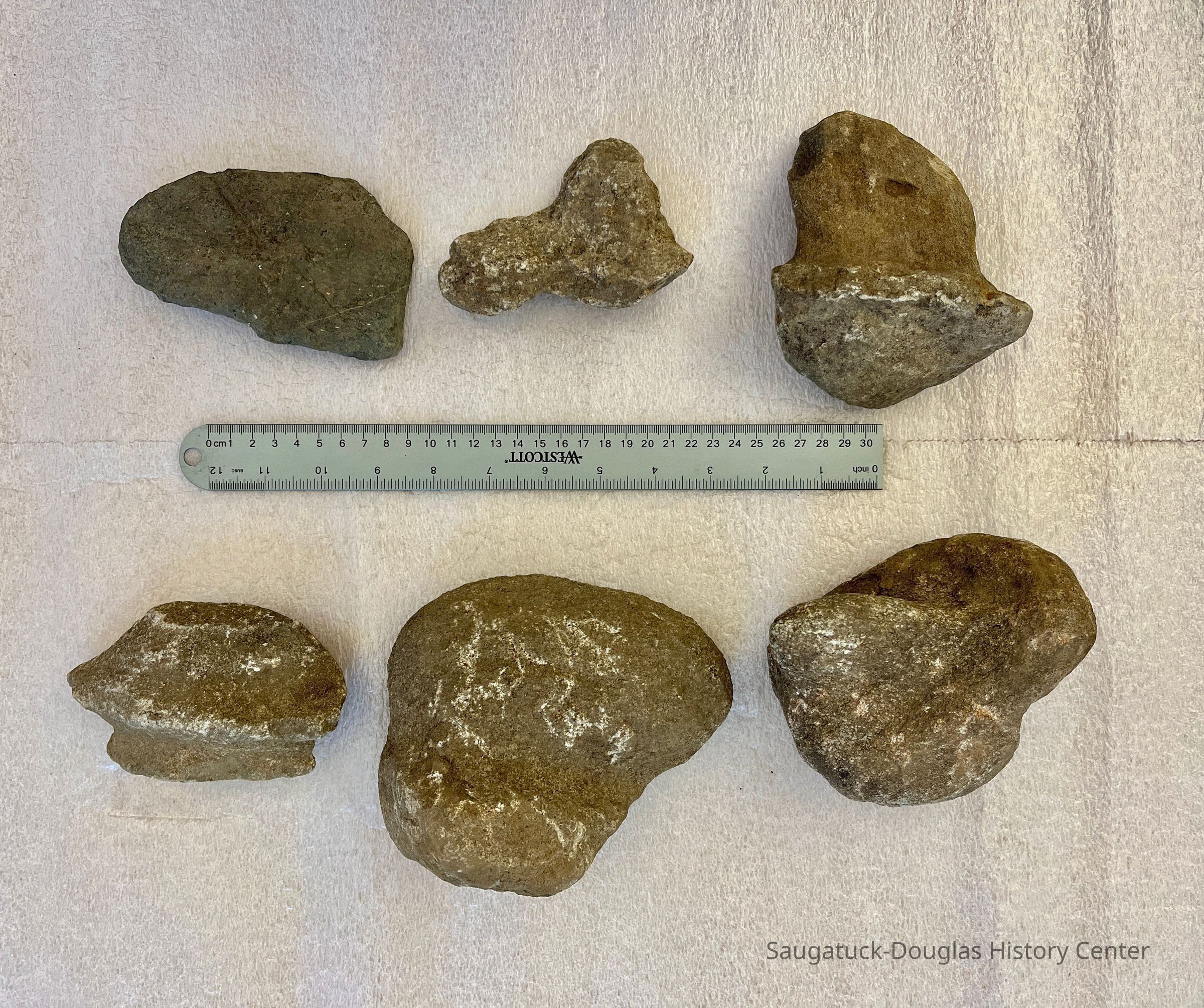 Collection of six unusual shaped rocks that the finder, who found them in the Peach Orchard Point area, suspects they may have been shaped by indigenous people.Context