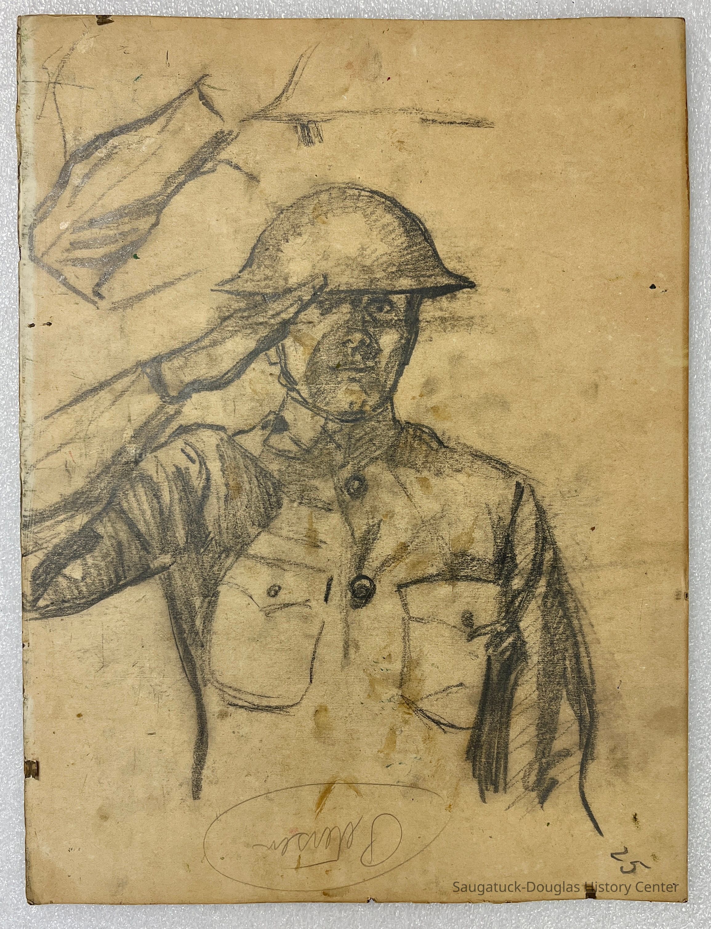 Side two has a pencil sketch of a saluting, uniformed World War I soldier, with a second study of the uniform sleeve section of the drawing. At the bottom of this panel is the word "Petersen" written with a different pencil.Type of Painting