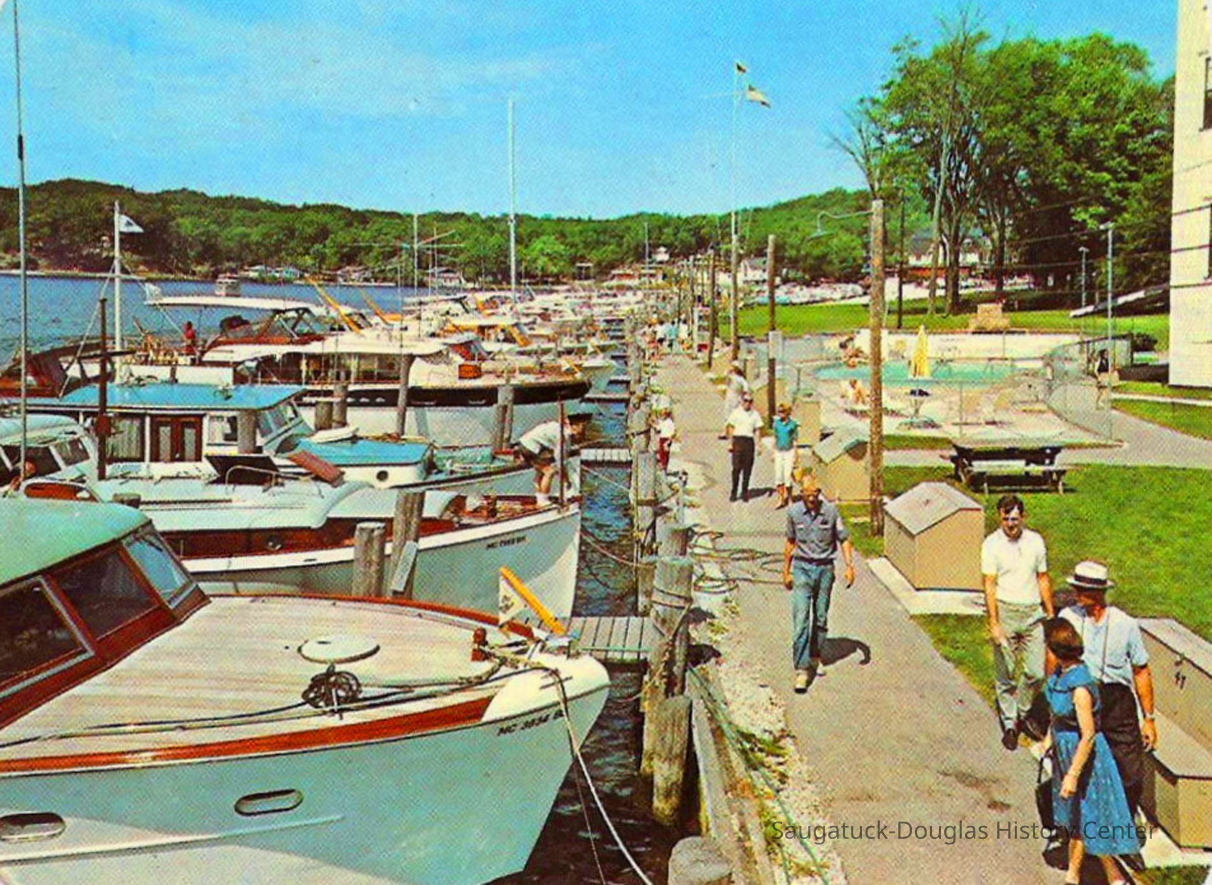 42-postcard collection of Saugatuck and Douglas tourism scenes including Butler Street, Pavilion, steamships, Wickwood Inn, lake, Willow Bend Farm Market, Lover's Lane, between the bridges, Saugatuck country club, oval beach, the boardwalk, ox-bow, forward movement park, Peterson Mill, Hotel Butler, Maplewood Hotel, Pier Cove mill, yachts, Leiendecker's Inn, Allahee Lodge, winter scene