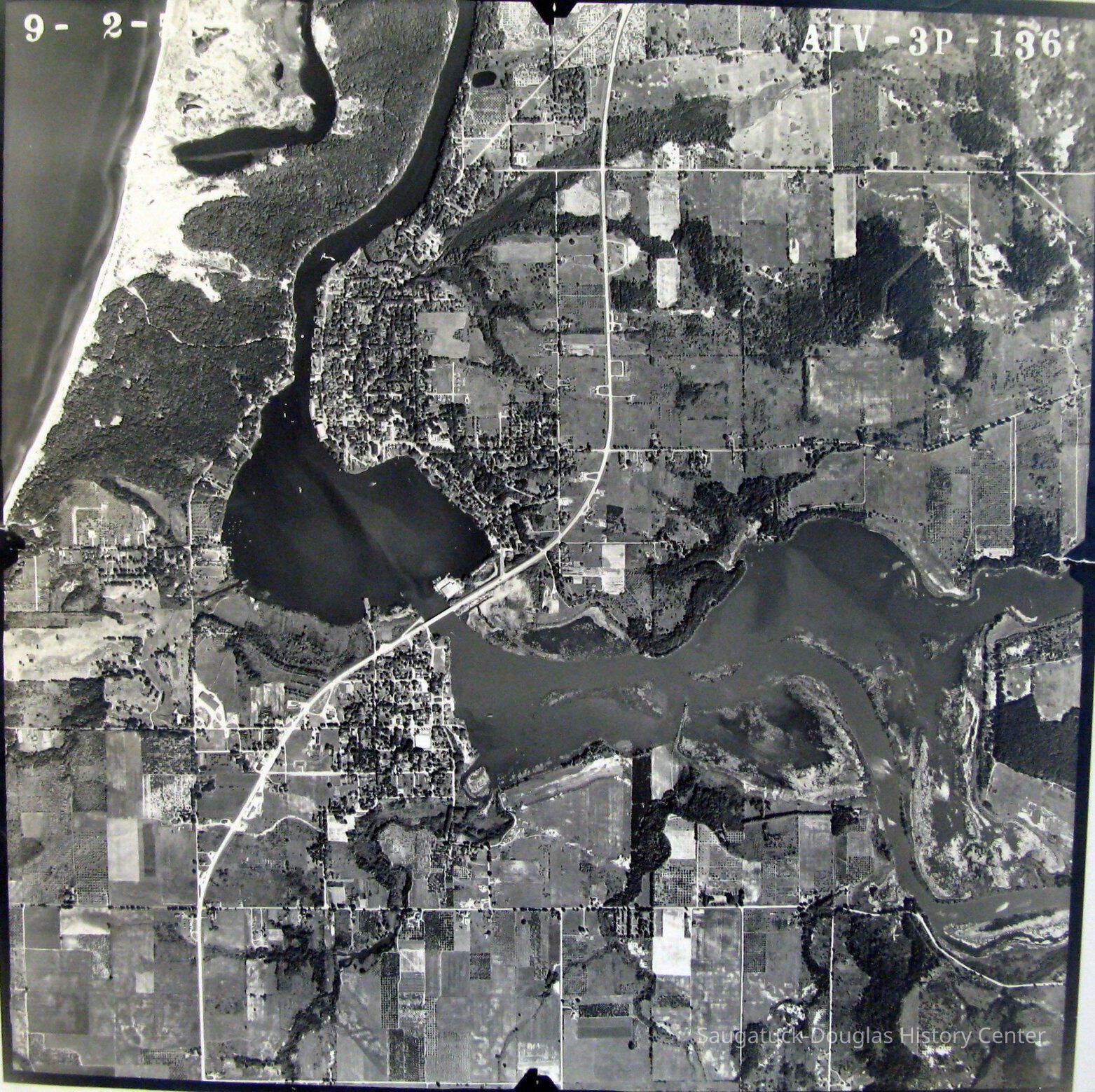 24"x24" black and white aerial photograph of the Saugatuck Harbor taken on September 2, 1955. According to James T. Fassen this was taken as a stereoscopic image to capture additional elevation information. A code in the upper right corner is AIV-3P-136.