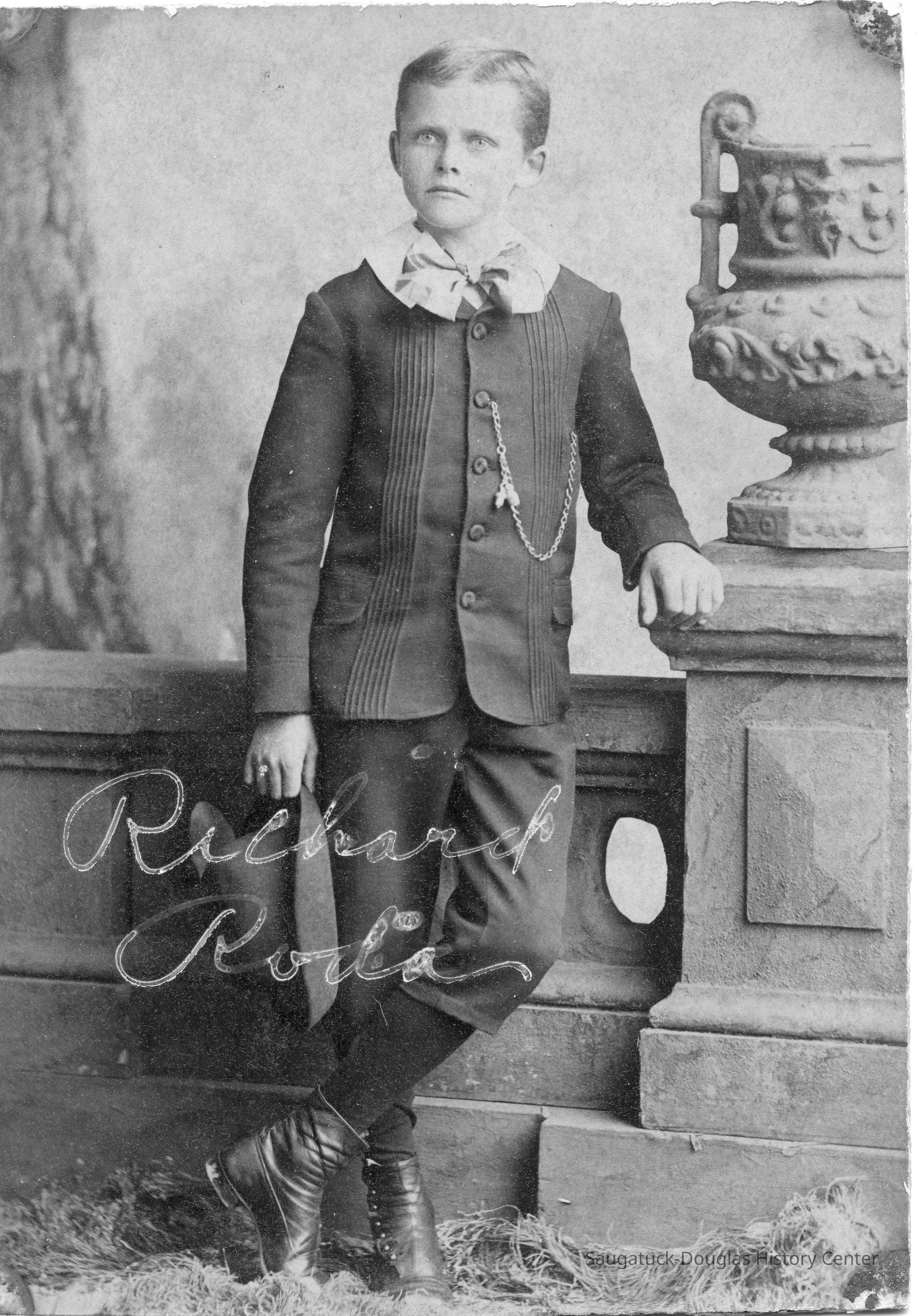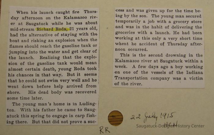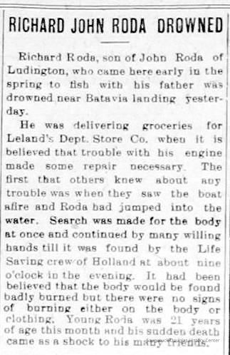 Richard John Roda, son of John Roda of Luddington, who came here early in the spring to fish [for carp] with his father was drowned near Batavia landing yesterday. He was delivering groceries for Leland's Dept. Store Col. when it is believed that trouble with his engine made some repair necessary. The first that other knew about any trouble was when they saw the boat afire and Roda had jumped into the water.Collection