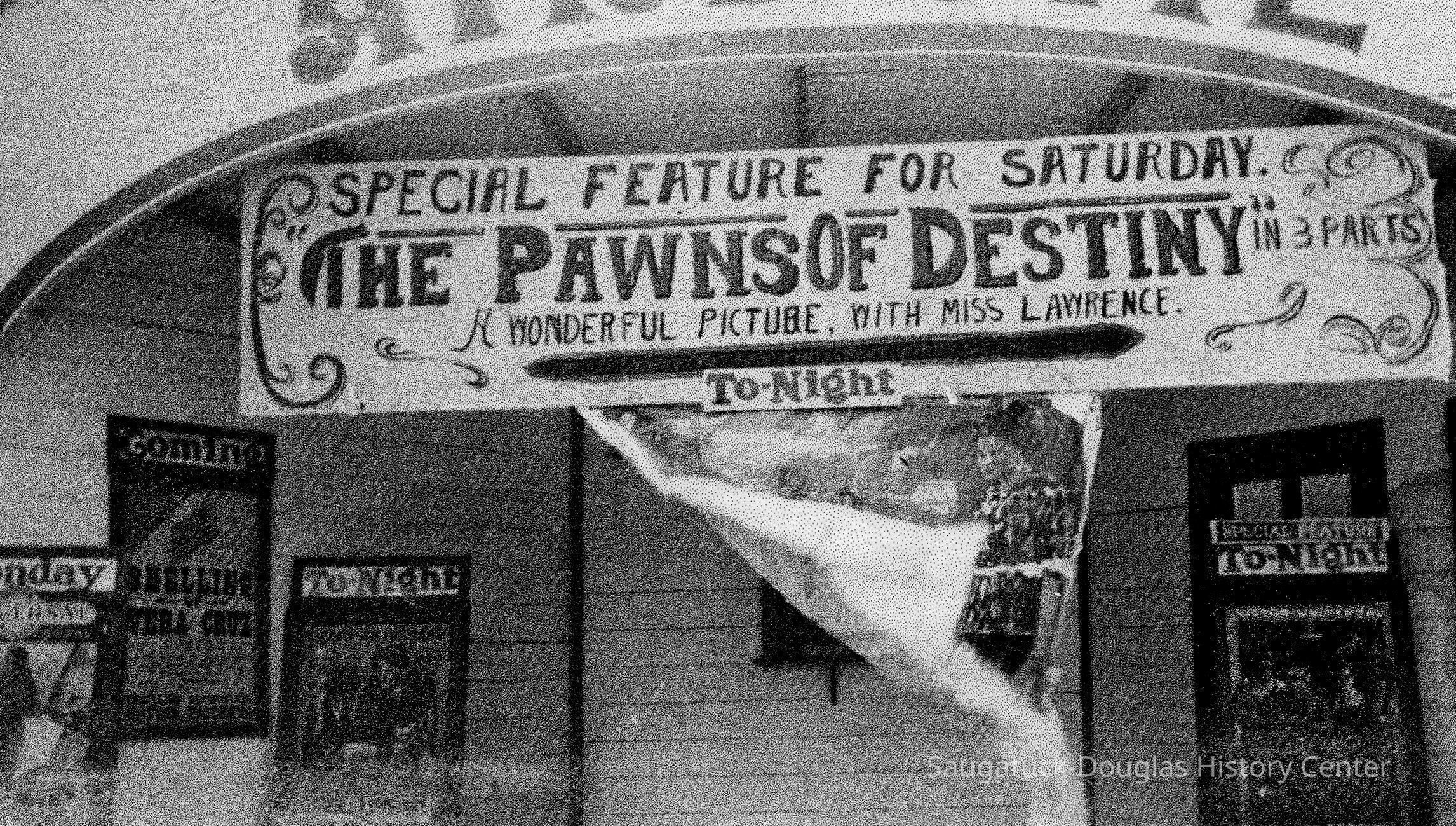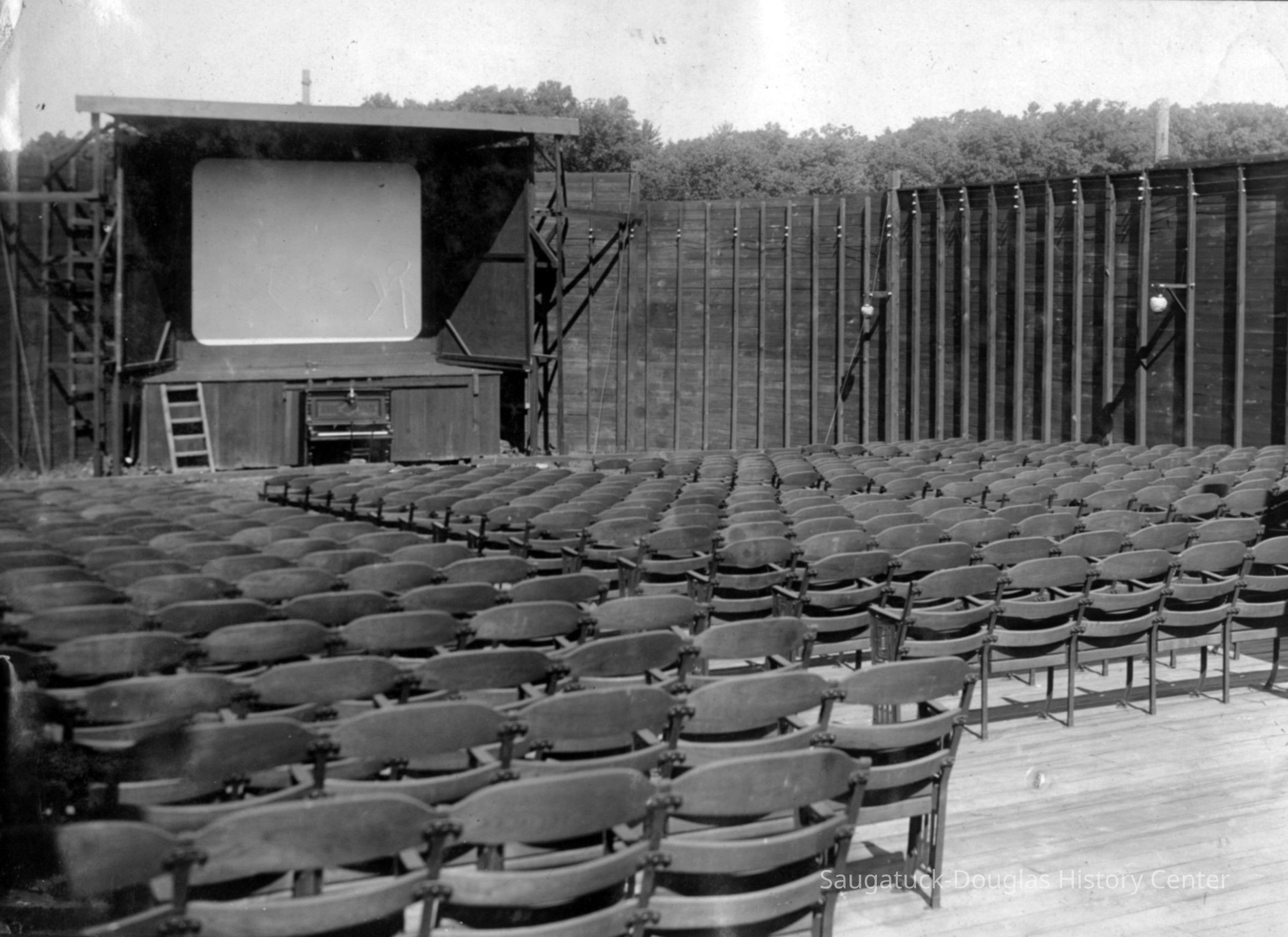 "Circa 1920 - Located at the foot of Hoffman Street at riverfront, this was Saugatuck's second movie theater—in the open air. Seats were salvaged from the nearby Big Pavilion movie theater during its renovation. Two silent movies, "Simon the Jester," and "Bludgeon," appear to have been showing at the time this photograph was taken.