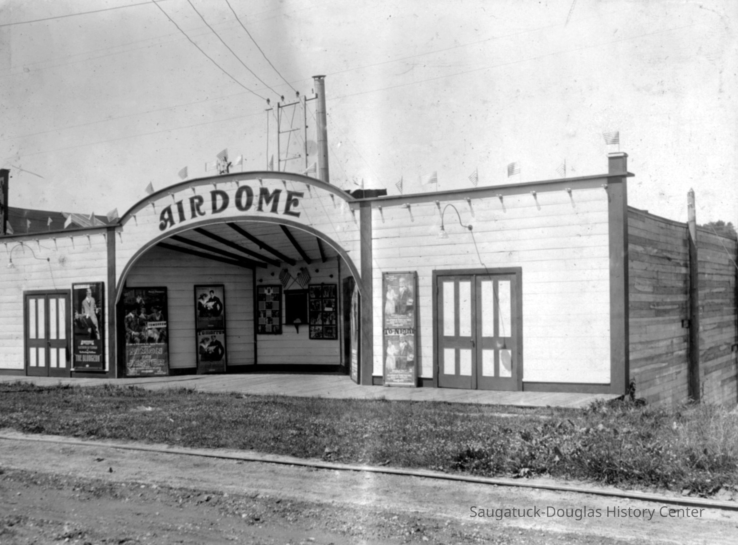 Digital scan of b/w photo of Airdome theater that once stood on the NW corner of Hoffman and Water Streets. The theater has an archway over the ticket booth and entry. Two pairs of exit doors and movie posters flank the entry that faced Water Street. The theater was open to the air but had tall wooden walls around the outside.Photograph Details