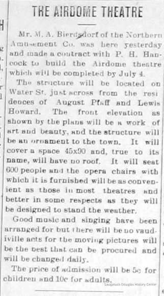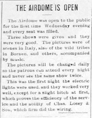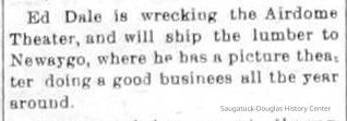 "An early theater was built by John Bannister about 1911 on what had been the Rogers & Bird boat yard property at the foot of Hoffman Street. It was an outdoor theater consisting of a roofless sloping platform with fixed seats and an elevated projection booth at the rear. Bannister sold it to Dale after its first year of use. Dale named it the Airdome. In the summer, he closed up the stuffy Edgewater and ran the open air show place. An obvious shortcoming of such a theater was the possibility of rain. In case of showers umbrellas were in order and if the elements persisted, the showing was temporarily halted until things cleared up. Rain checks were unheard of and no doubt many a customer went home dissatisfied with the short showing. Dale closed the Edgewater in 1916 but continued with the Airdome until 1920. By that time the Pavilion was producing all the entertainment. (Dale's old theater was immediately purchased by Charles Heistand and being on the river bank, became the nucleus of the boat livery which he was starting to develop.) The coming of the movie theater added another dimension to people's lives in those days. It was cheap, fascinating, always ready entertainment when one chose to take advantage of it."