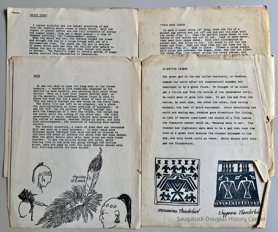 Nine photocopies from an unknown publication about Algonquin culture. Topics include Maniboxho/Manabus/Thunderbird legend, birch bark canoe, harvesting wild rice, Sauk-Fox designs, Chippewa designs, hair, maple syrup and Menominee maple sugar legend, Menominee designs, and the legend of Long Nose.