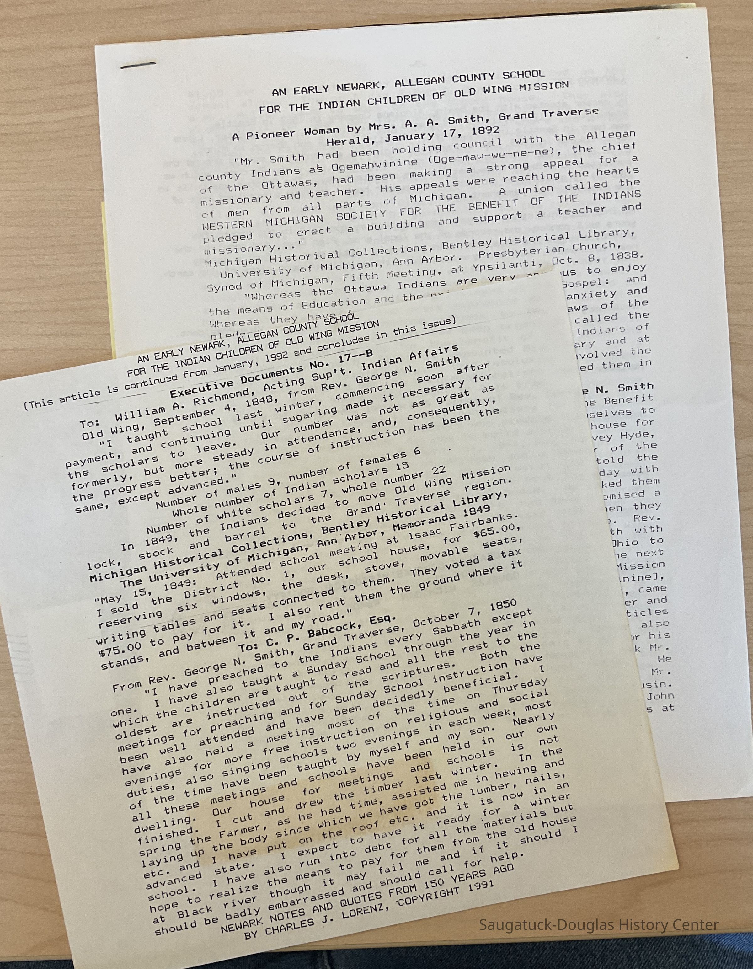 Archives relating to Native Americans in Allegan County and an early Newark, Allegan County School for Indian children of Old Wing Mission. this article was included in a 1992 newsletter from the Saugatuck Douglas Historical Society compiled by Charles Lorenz.Collection