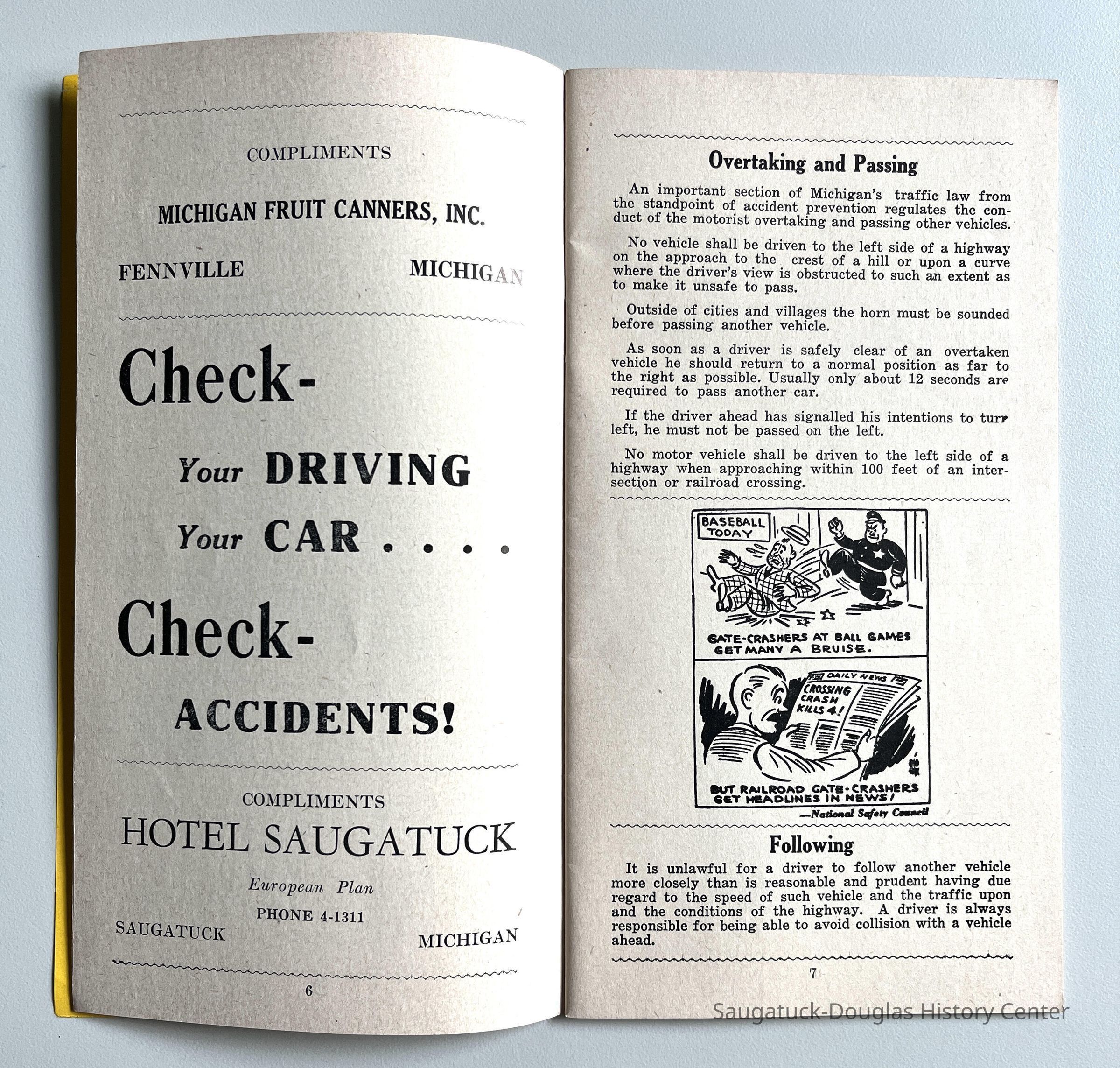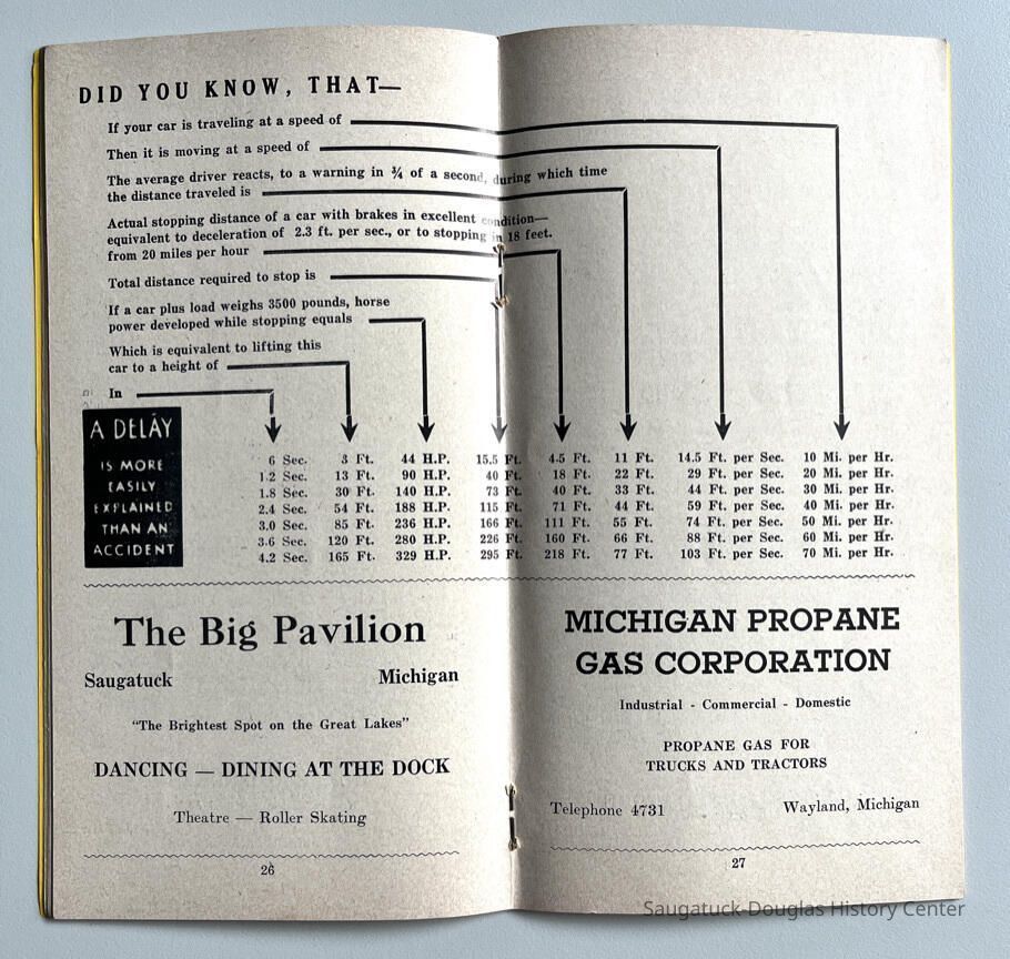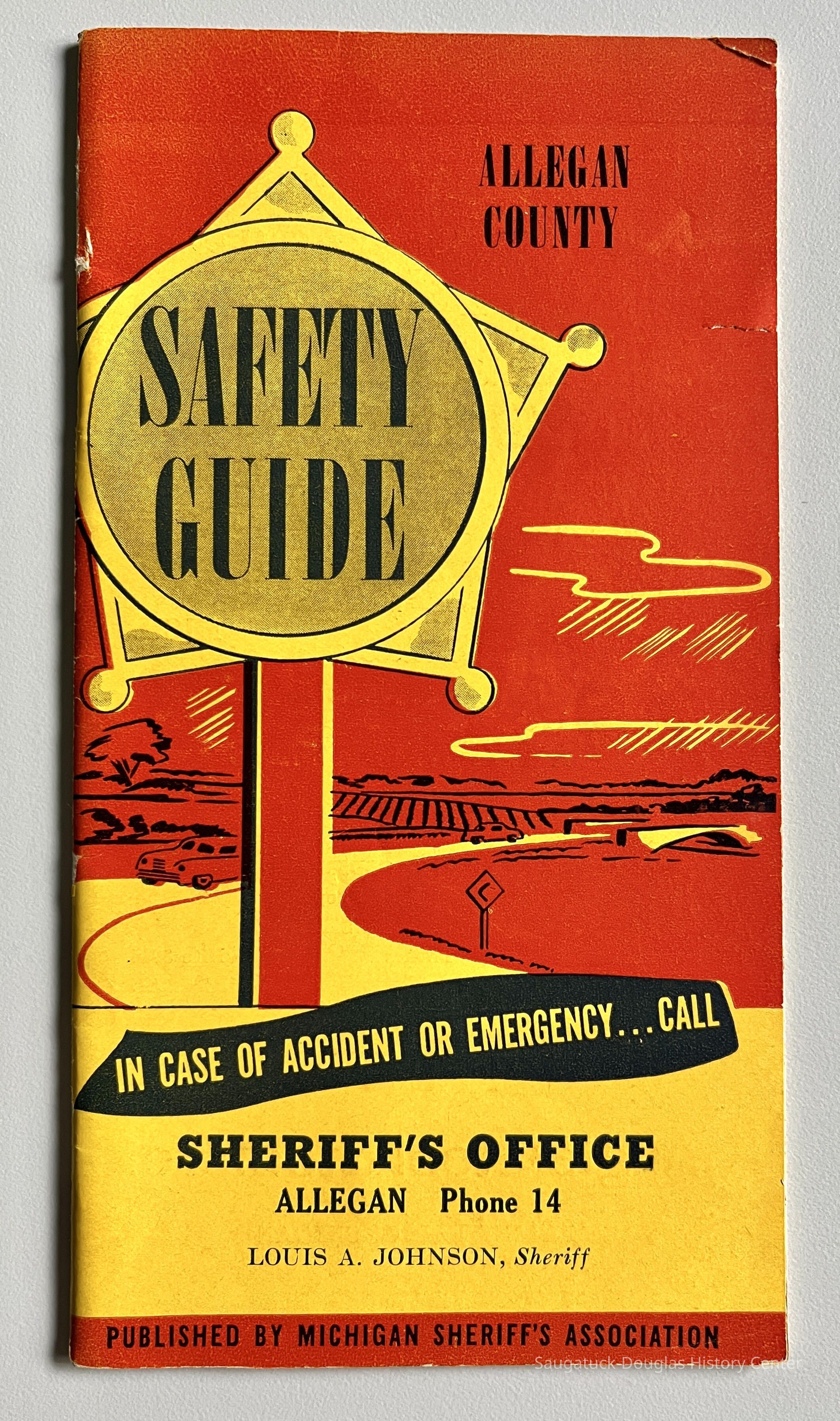 1952 booklet with advice for motorists and pedestrians produced by Louis A. Johnson, Sheriff of Allegan County. Interspersed with ads are illustrated safety tips and slogans from the National Safety Council are articles about the responsibilities of the sheriff, overtaking and passing, following, turning, stop signs, rules and regulations for driver license examiners giving a road test, speed limits, traffic control signals, pedestrians on rural highways, the drivers' license bureau, a summary of the more important rules of the road, "If Everyone" list of safety wishes, rules for safe walking, suggestions on fractures of the limbs, 6 sure ways to lose your license, list of automobile license plate codes 1952, parking, pedestrians, reporting accidents, reaction times table, lane usage, brakes, wound dressing suggestions, trucks and buses, bicycles and motorcycles, good driver quiz, come back alive poem, signals, swerving, drivers prayer by James J. Metcalf, car checklist, what to do on approach of police or fire department vehicles, Michigan financial responsibility laws, overtaking school buses unlawful, lowered speeds for fuel conservation, school child safety hits for motorists and children, sample hunting permission slip, list of all Michigan sheriffs 1952 and reckless operation of motor boats.