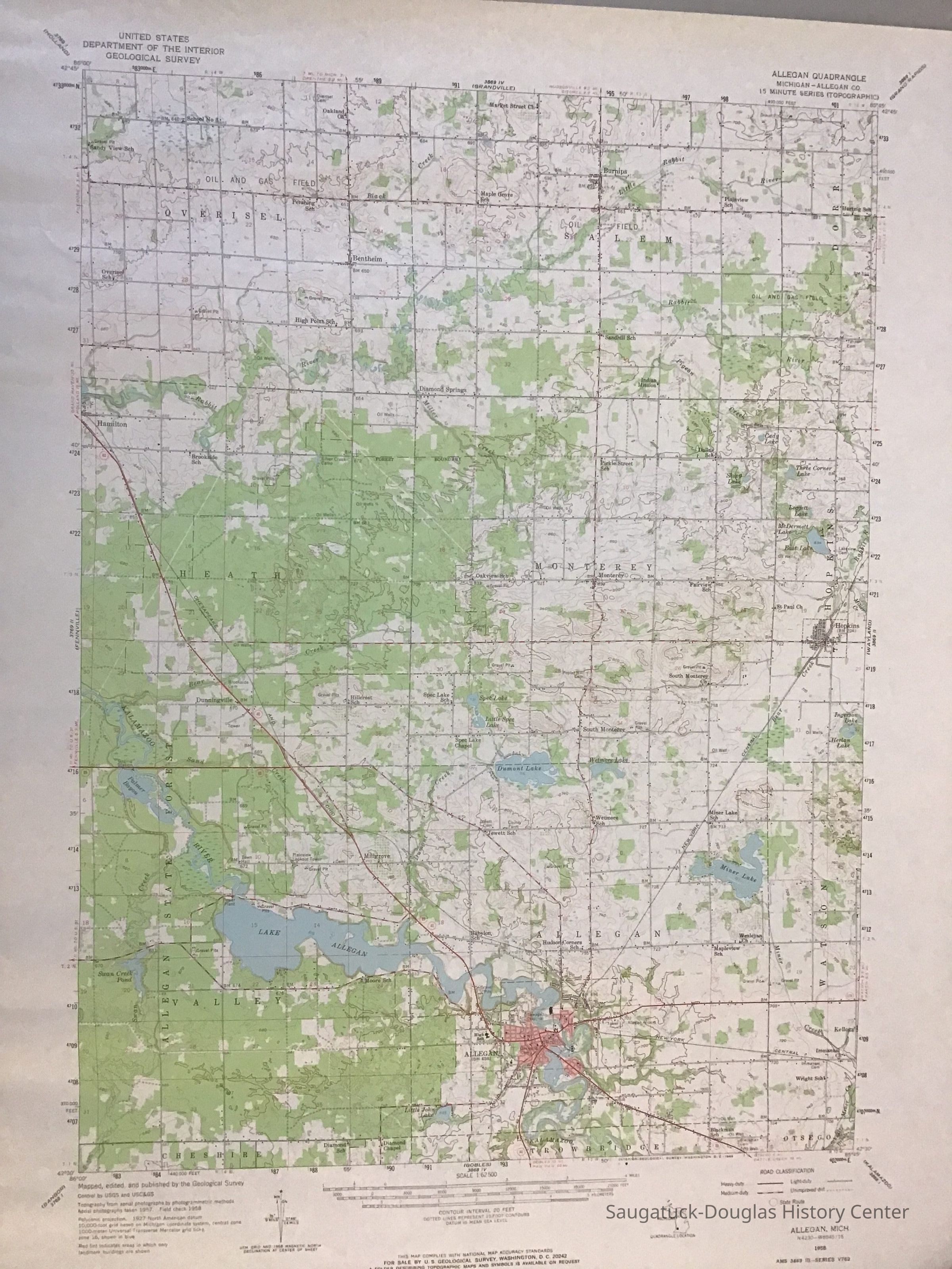 USGS quadrangle map of Allegan covering Overisel, Salem, Heath, Monterey, Valley, and Allegan townships.Collection