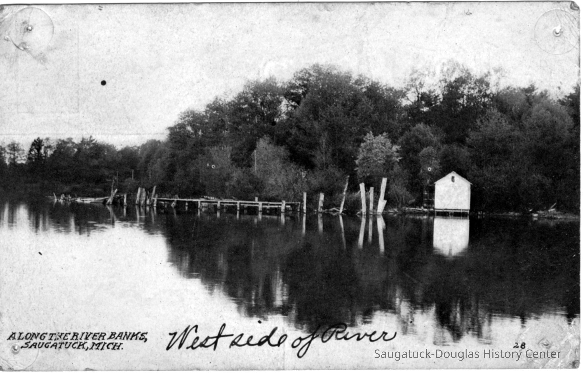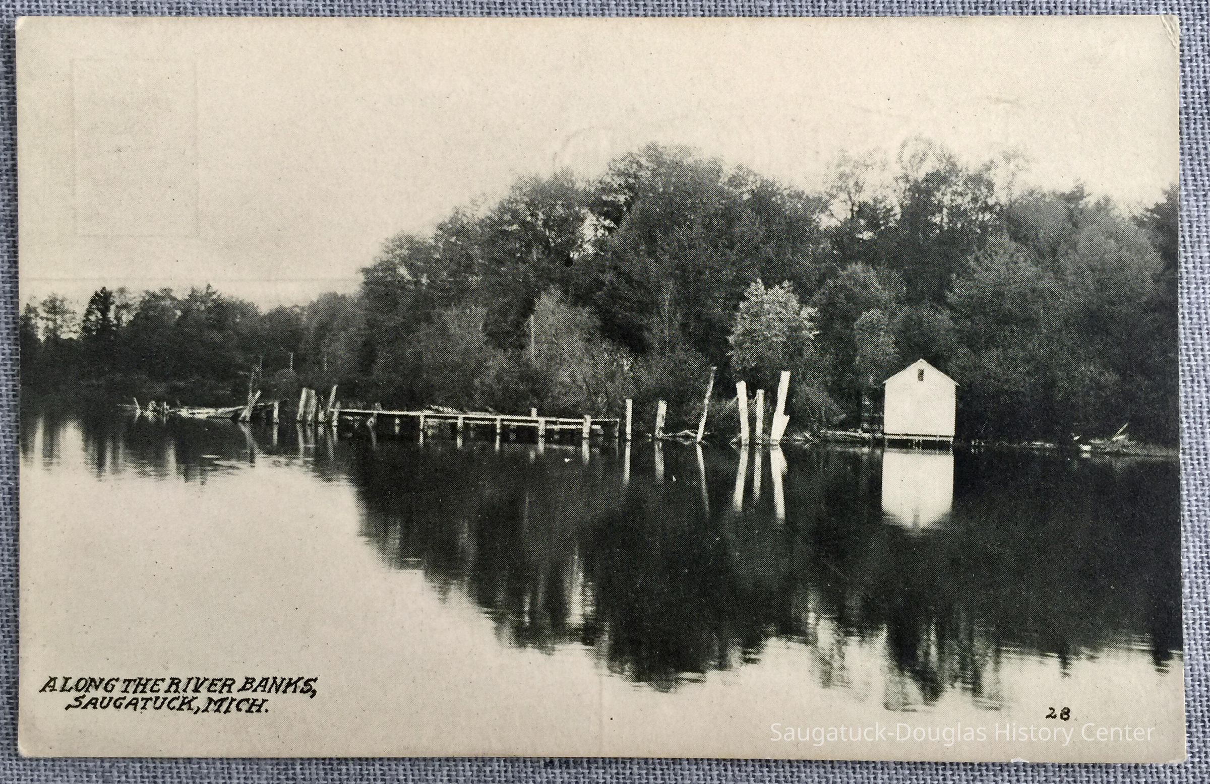 One lone white building, logs and piling, a dock as seen from a boat or the opposite shore. Reflections of the scene fill the bottom half of the front image.
