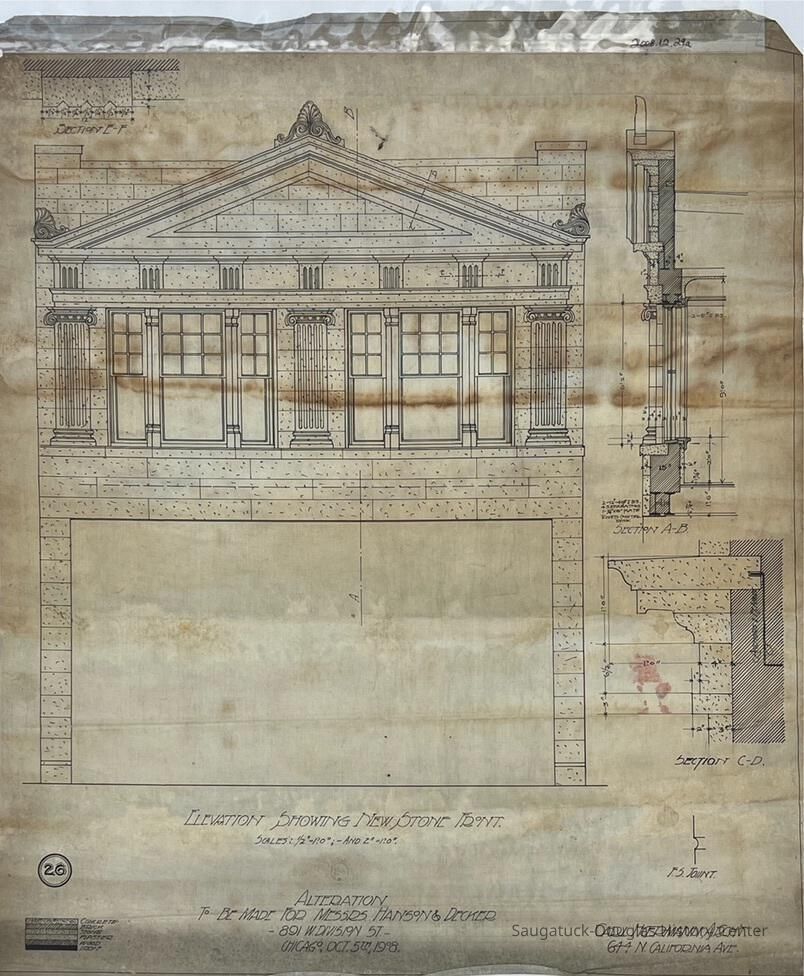 This architectural drawing features a detailed picture of a new stone front to be put in for Hanson and Decker in Chicago. The left consists of drawings for sections A-D and an F.S. Joint. There are few measurements included in the piece.Collection