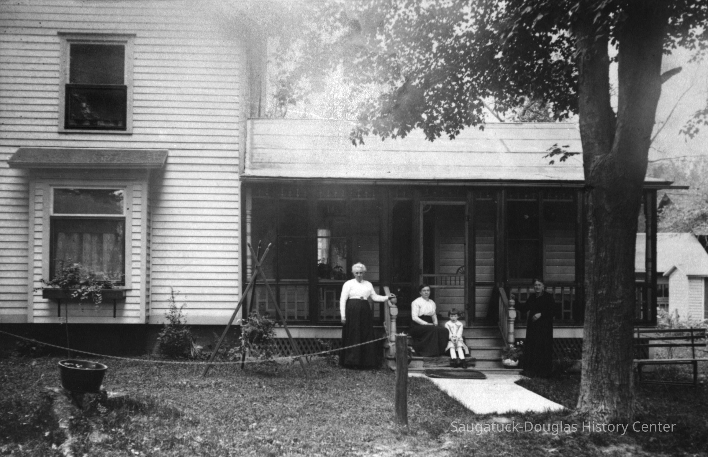 Now we come to my grandmother Mary Ellen Davis Ames (Mrs. Richard Ames). Grandfather named me after her. When I was 16 we found out my father's mother's name was Mary Ellen. I always thought they were still on the farm when he died in 1910. I was a year old. I'm not sure as to the date they left the farm and bought back the Saugatuck house. I distinctly remember when I was quite small (4 or 5, 1912 or 1913) of standing on the east side of the house with a group of people. I stood close to Mother. There was Grandma, Aunt Rena and Mrs. Grenaugh (probably, Mrs. Greenhalgh) who lived on the east side of Grandma, next door.
