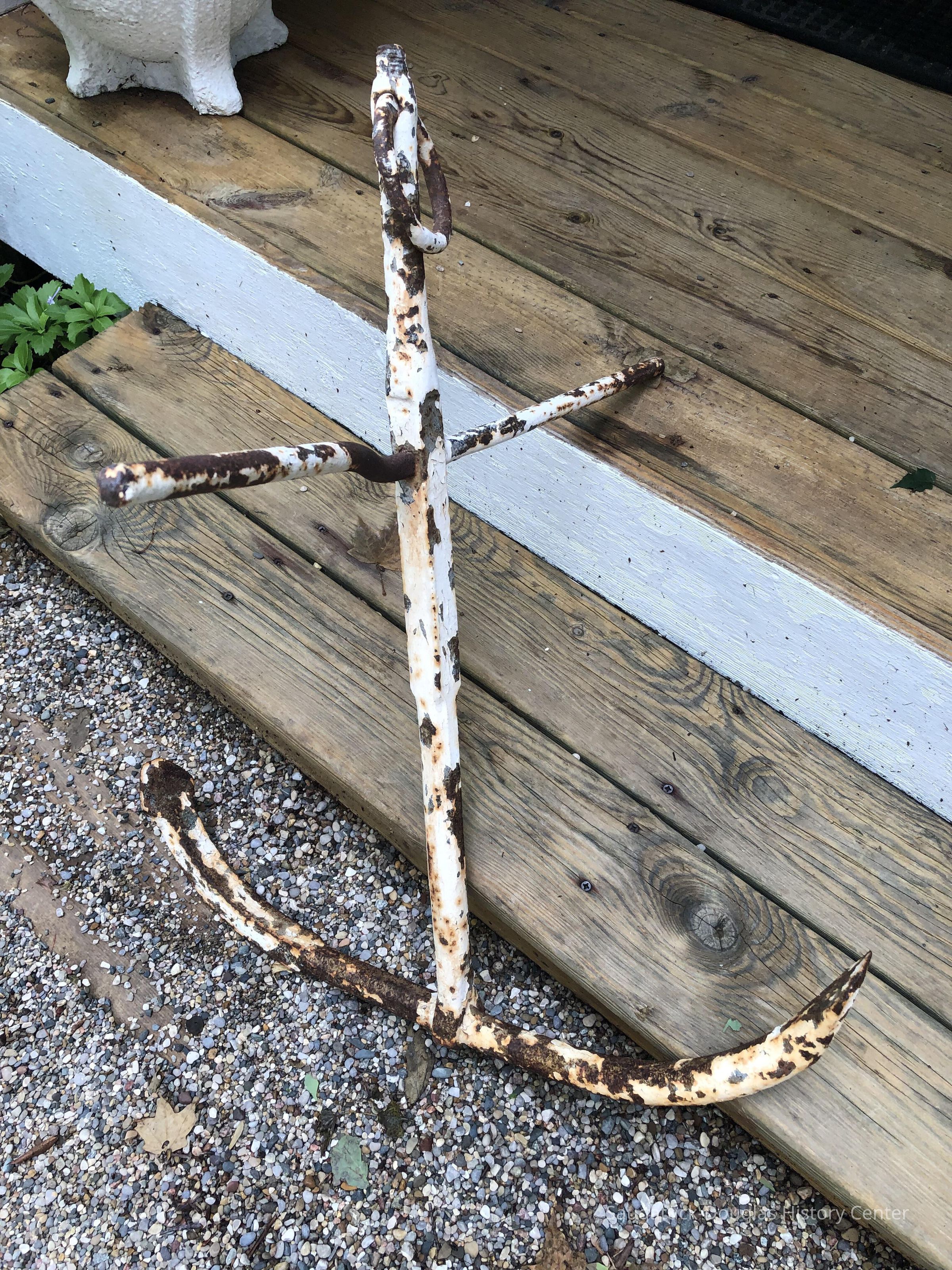 Weathered metal anchor with flaking white paint.Collection