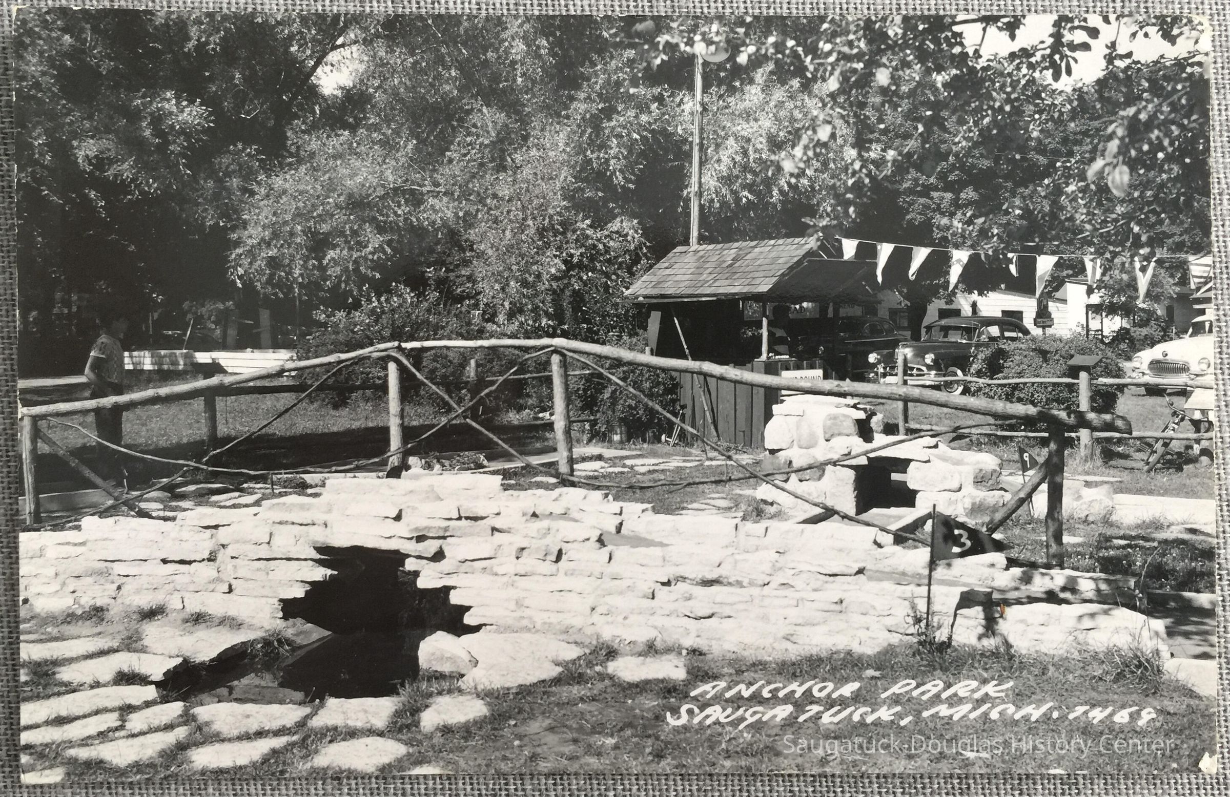 Real black and white photo card of a stone bridge or culvert with a rustic, log railing. A small triangular flag with a "3" and another with a "9" suggests the place is a miniature golf course. A small stand with more pennant flags are beyond the bridge along with two parked cars. A boy stands on the bridge in the left of the image.