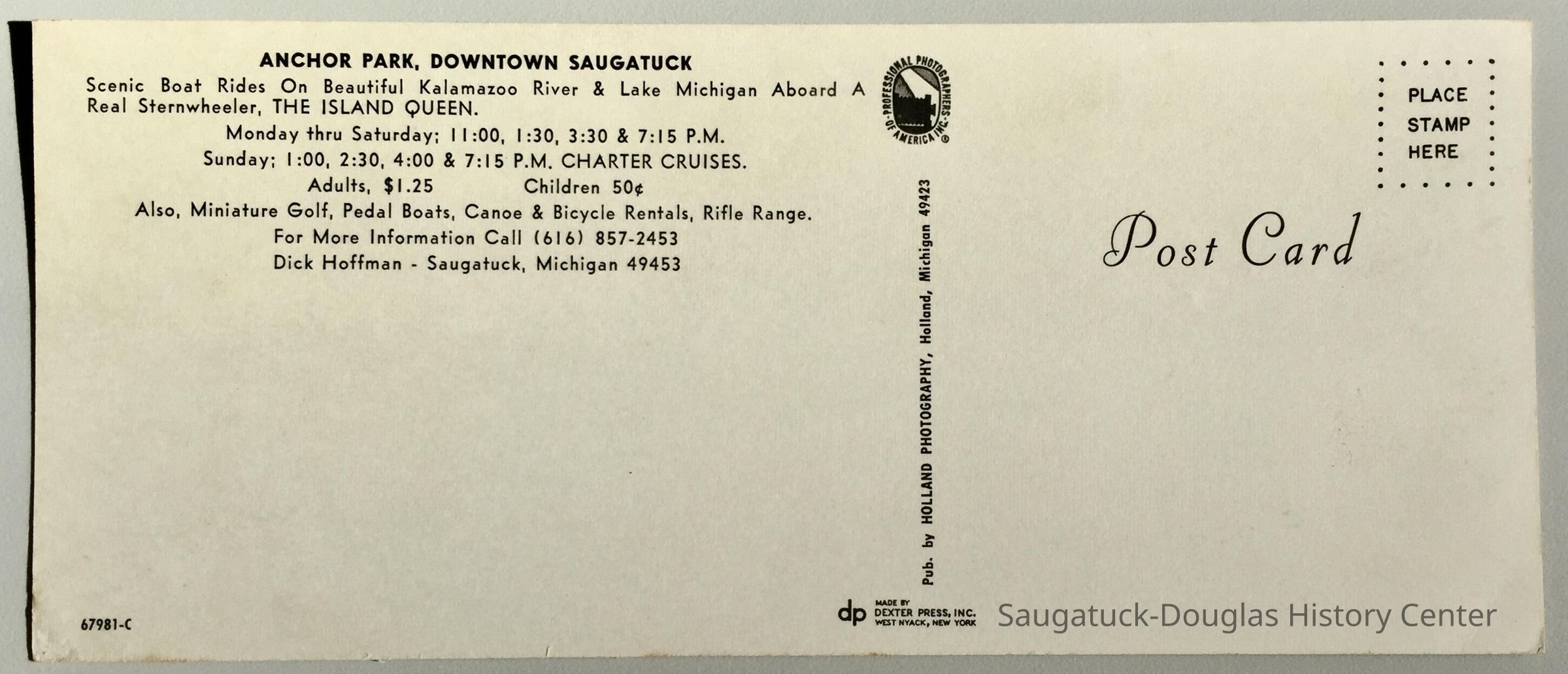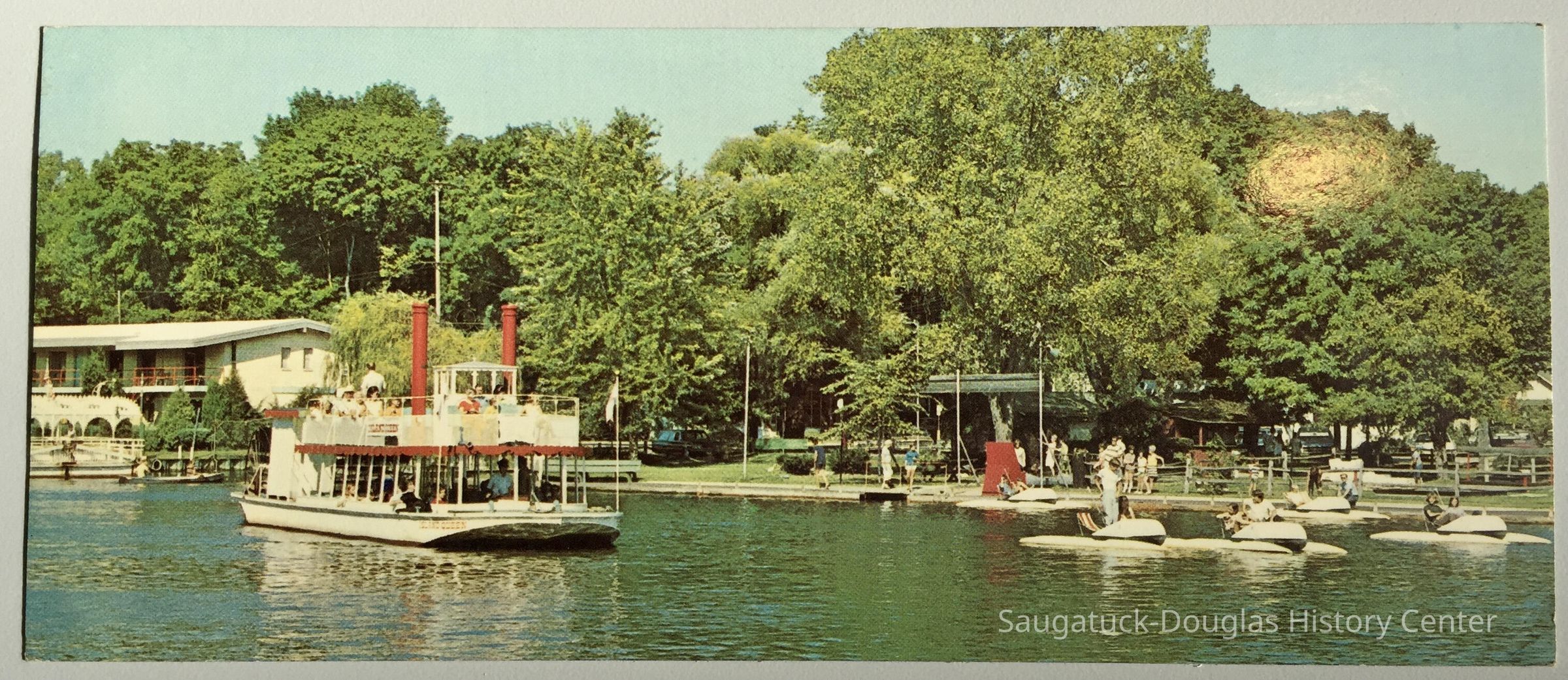 The Island Queen and paddleboaters sail past Anchor Park with the Chain Ferry and the Ship-n-Shore Hotel in the background. Unmailed.