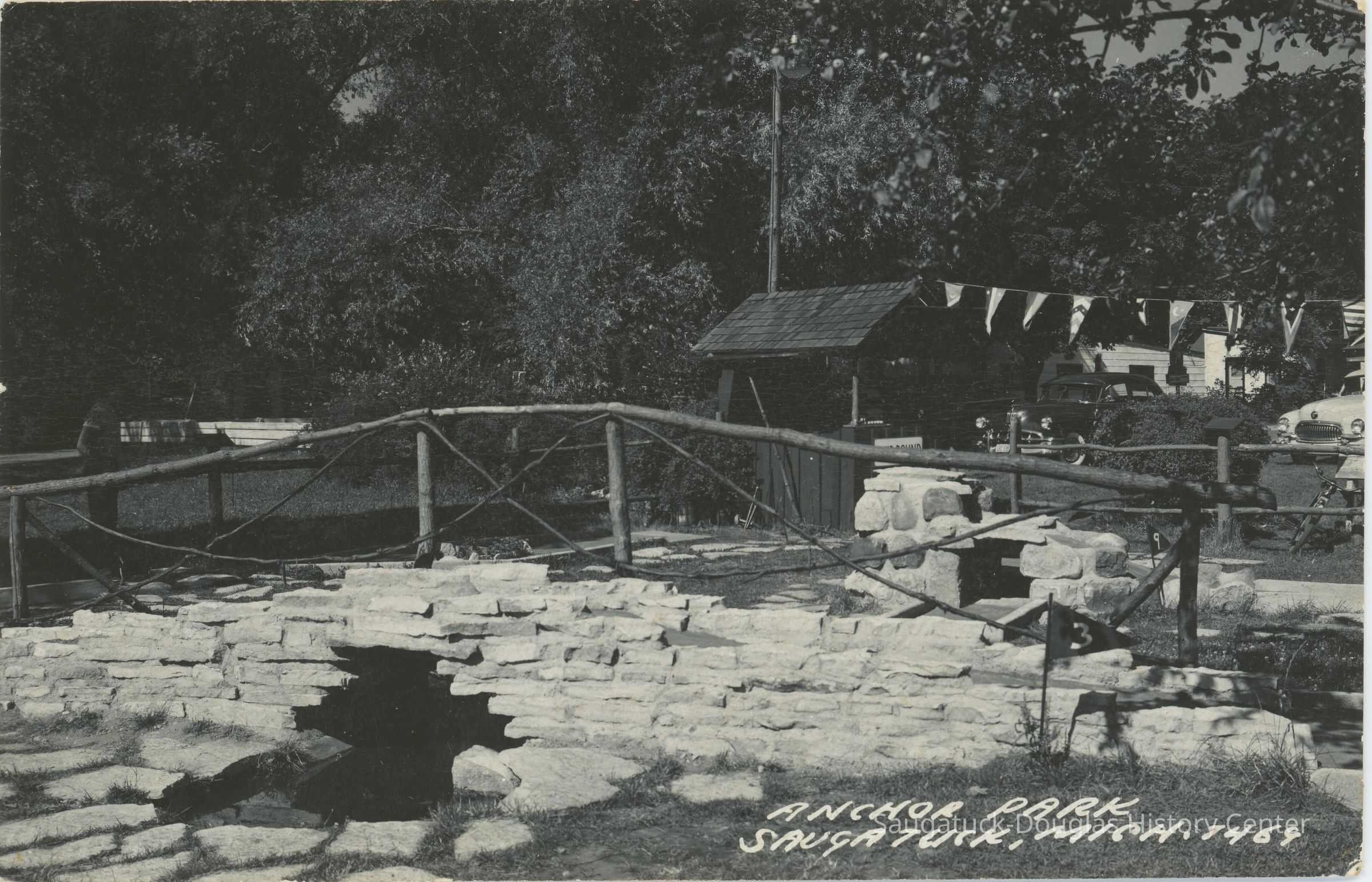 A black and white postcard showing a stone bridge with a wood railing in Anchor Park.Subject