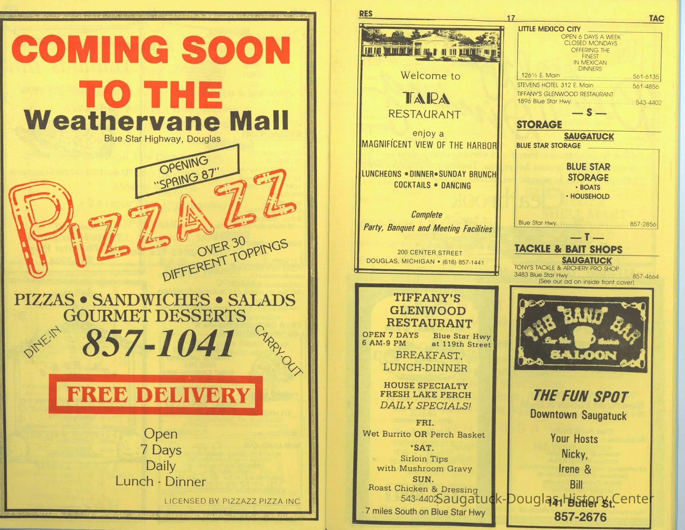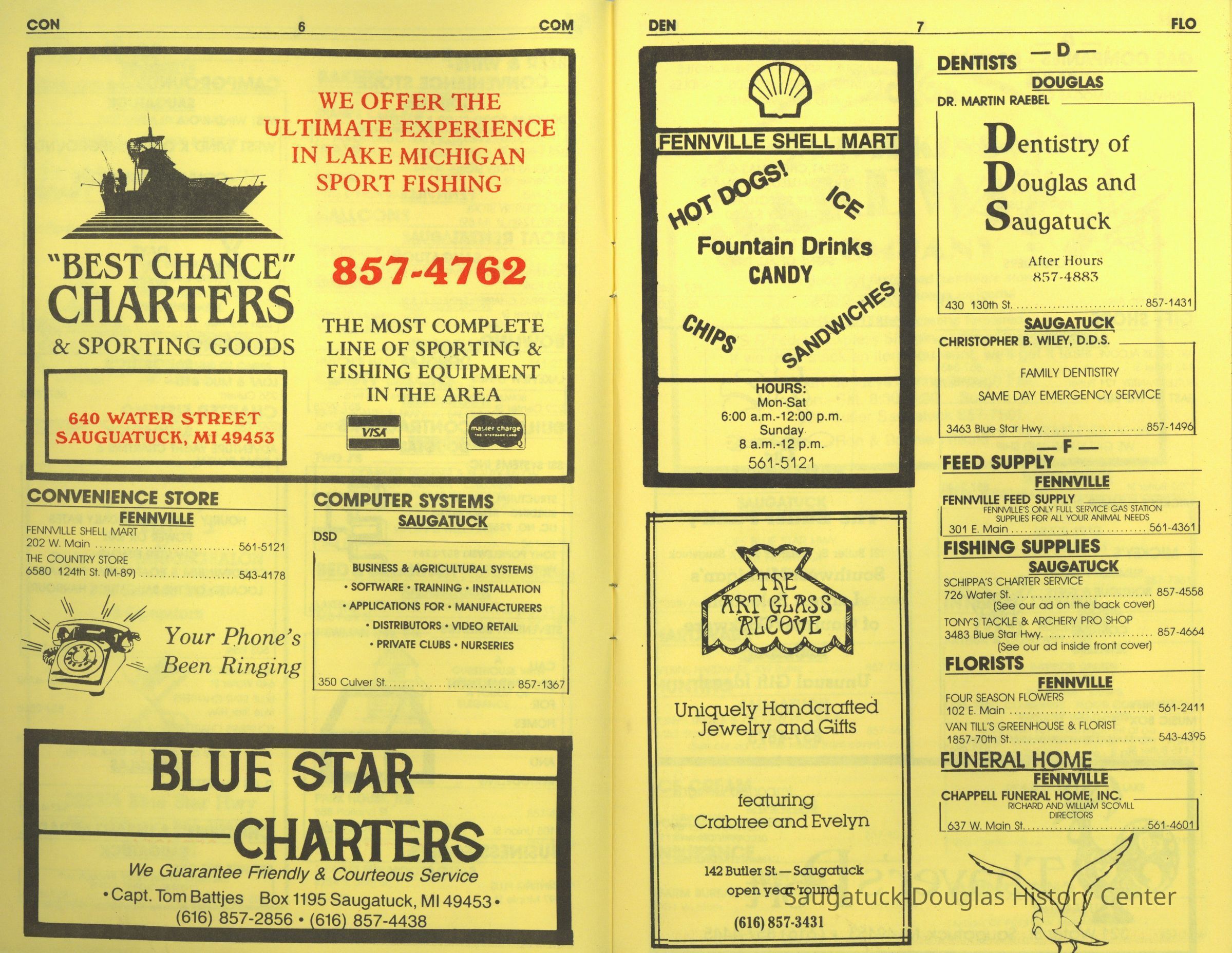 Blue Star Barns/Amsterdam/Tony's Tackle, 110 Butler St./Urban Found/Bay Building/Redebaugh home, Handled with Care, Amaru Leather, 447 Butler/Inn of Saugatuck/Victorian Inn/Highbanks Art Gallery/John Koning home, Button Gallery & Home/Tews' Gardens, Hotel Saugatuck/900 Lake/Twin Gables Hotel/Singapore Country Inn, 48 W Center/Respite Cappuccino Court/Mr. Miller's Art Emporium/Norton Drug Store, Wild Dog/Copper Grille/Douglas Bakery, Alley's Lakeview Lanes/Collins' Community Lanes Bowling, Saugatuck RV Resort/West Wind KOA/West Wind Cottages, 236 Culver/Coast 236/Hercules/Loaf and Mug/Simonson Studio #1, Viola Fox Building/103-107 Butler/Leland Lodge/S.A. Morrison home 1850-1978, 640 Water/Big Lake Outfitters/Best Chance Charters, 142 Butler/Lucia's/Art Glass Alcove/Curious Cove/Green Parrot Cafe/Sorenson Building, Raebel, Martin, Wiley, Christopher B., 439 Butler/Butler Pantry/Wilkins/Koning/Nies Hardware, 252 Butler/Tuck's Pandora Christmas Shop/East of the Sun/Cabin Tavern/Walz's Butcher Shop/Nichols Bldg., 115 Butler/Beach Day/MI Coast/Music Box/John Ball's Restaurant/Niles Jewelery 1910, 321 Water St./Saugatuck Tea Party/Tuscan Pot/Kleeman's Tavern, Clearbrook Golf Club/Hamilton Lake Club/Saugatuck Golf Club, Blue Star Cafe/141 BSHwy/M&M's/Tastee-Treet, Brady/L.R. Brady Insurance Company, 216 St Peter's Dr./Safe Harbor/Tower Marina/Capt. Hamilton House, 650 Water/Saugataco/River Market/Gleason's Party Store, 840 Lake/Arrowhead Resort, 310 Butler/Fenn Valley Tasting Room/Consumers Power/Village News & Tobacco, 428 Butler/Maplewood Hotel b.1860/facade 1923, Ida Red's Cottage/Diepenhorst fish market, Everyday People Cafe/11W Center/Douglas Dinette/Walz or Waltz Meat Market, Cafe Sir Douglas, Tara Restaurant/Spencer House/200 Center, 141 Butler/Sand Bar Saloon/Edson Crow Barbershop & Billiard Parlor, Spectators/Skyline, 241 Butler/Momentum/BrigadoonPerson or Organization