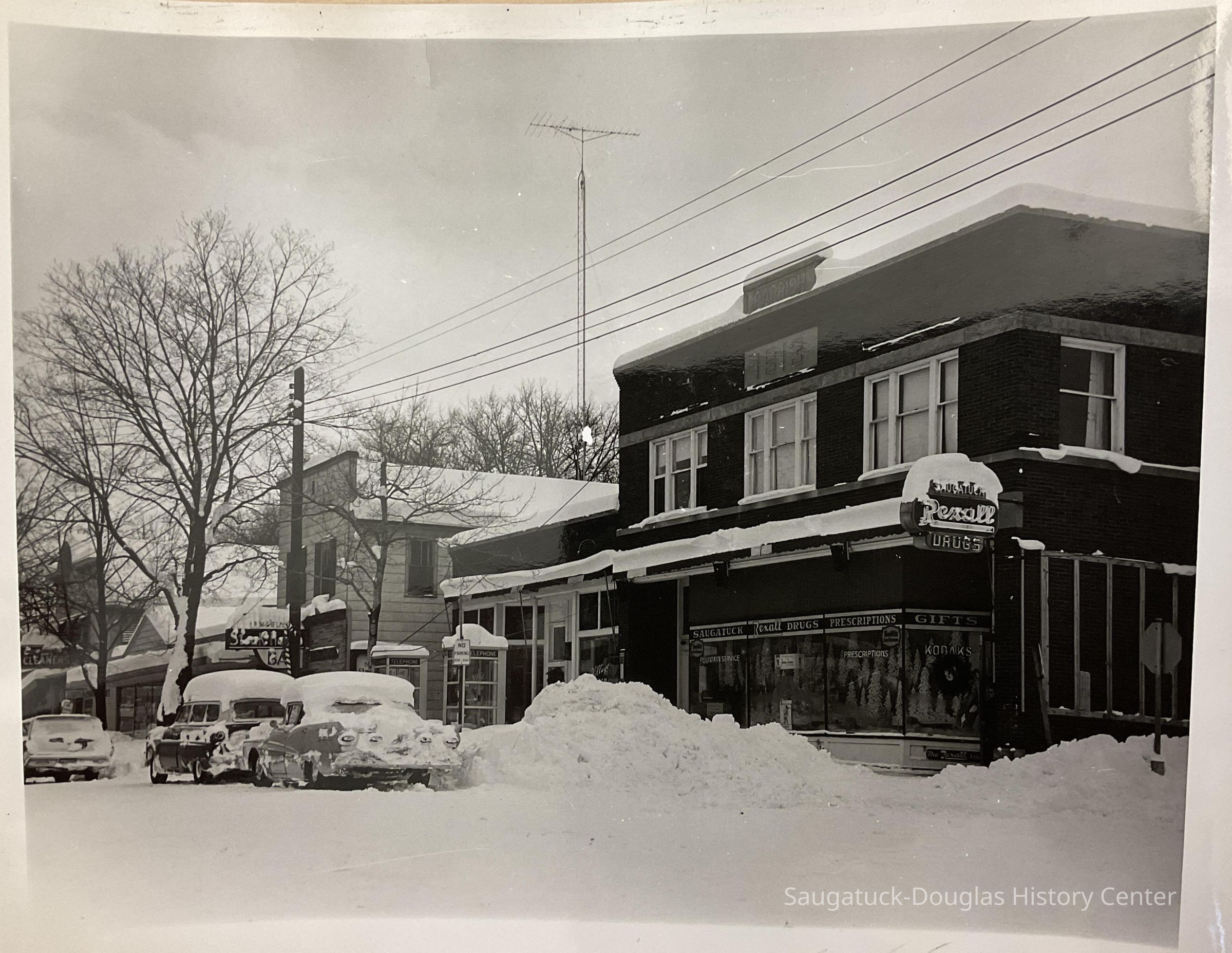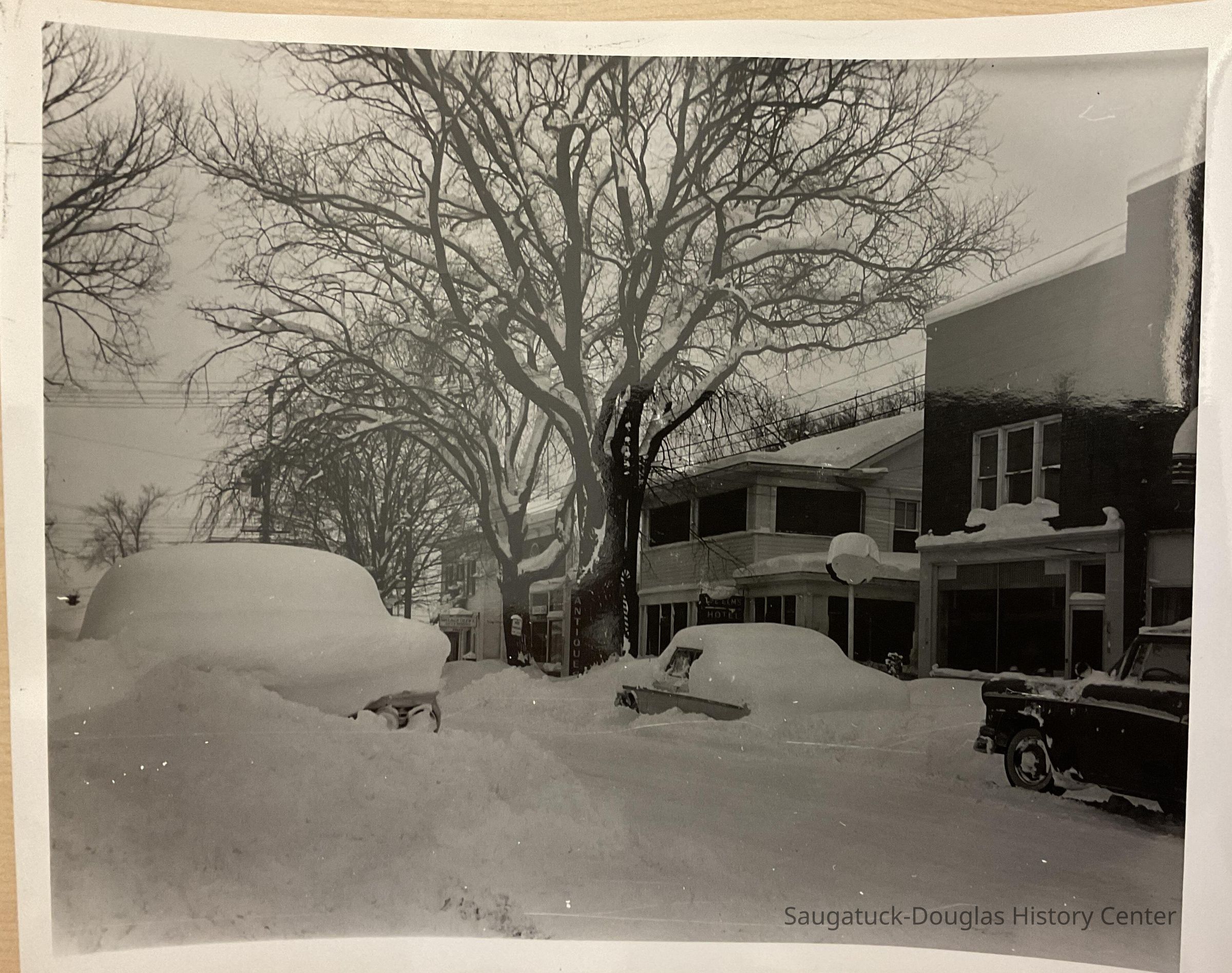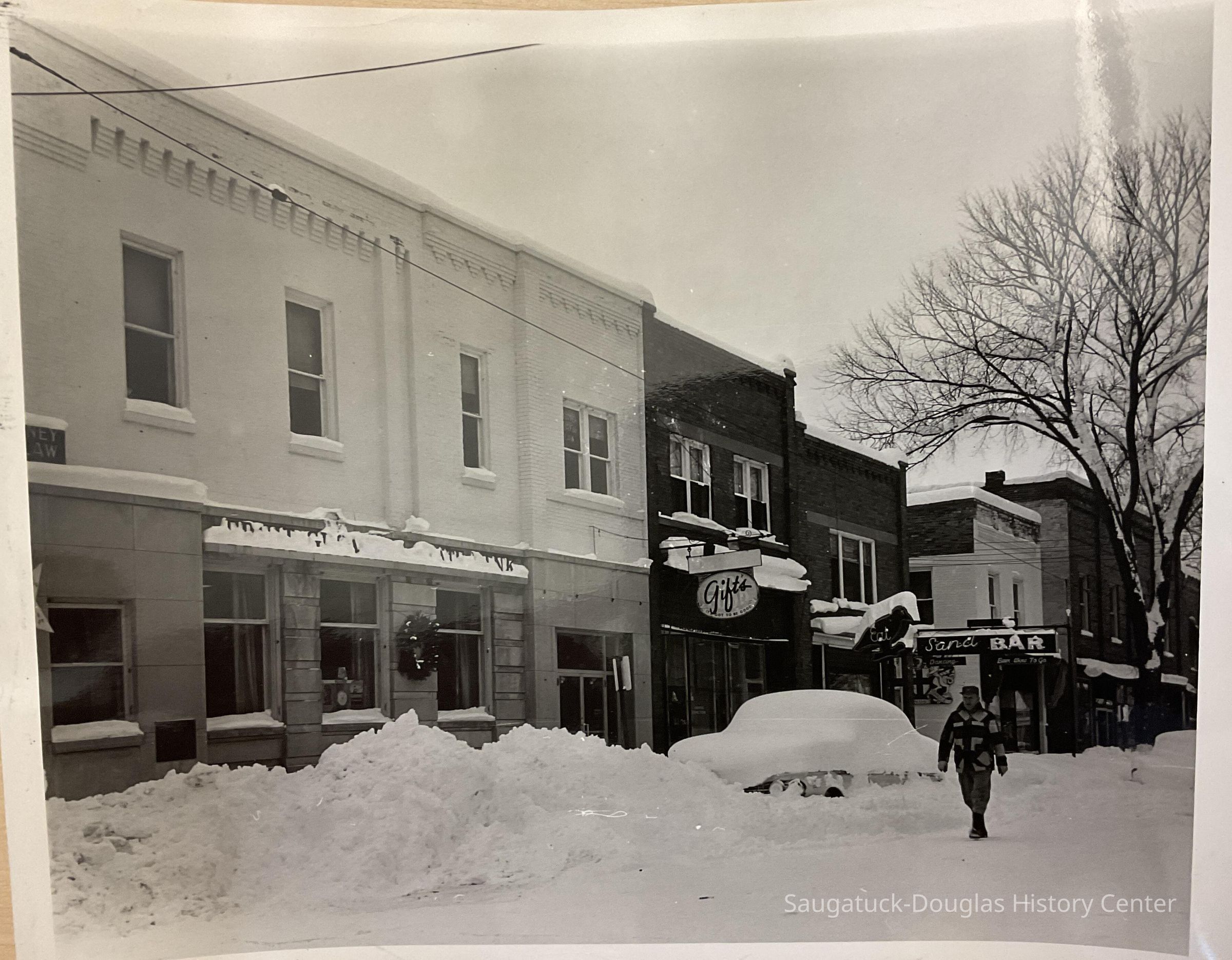 Saugatuck Village Hall, Butler St. in snow, Fruit Growers Bank, The Elms,, The Butler, Flints Dept. Store, Soda Lounge, The Elms Rooms, Country Store Antiques, Post Office, Seymour's Hardware, Bill Schumachers Barbershop, Funk's Newstand, Sand Bar, Allen Antiques, London Shop, Brittain House, Lundgrens Grocery Store, Cook Park photo removing trees, yacht in Kalamazoo River, Beachway Hotel, Old St, Peter's Rectory, Frances House - Campbell Rd., Dr. Miller's House - LakeShore Dr., 4th July Parade Parade - SDHS, Pumpernickels bldg 1971, house on corner of Maple & Allegan, Pavilion fire ruins 1960, Oval Beach - planting flowers