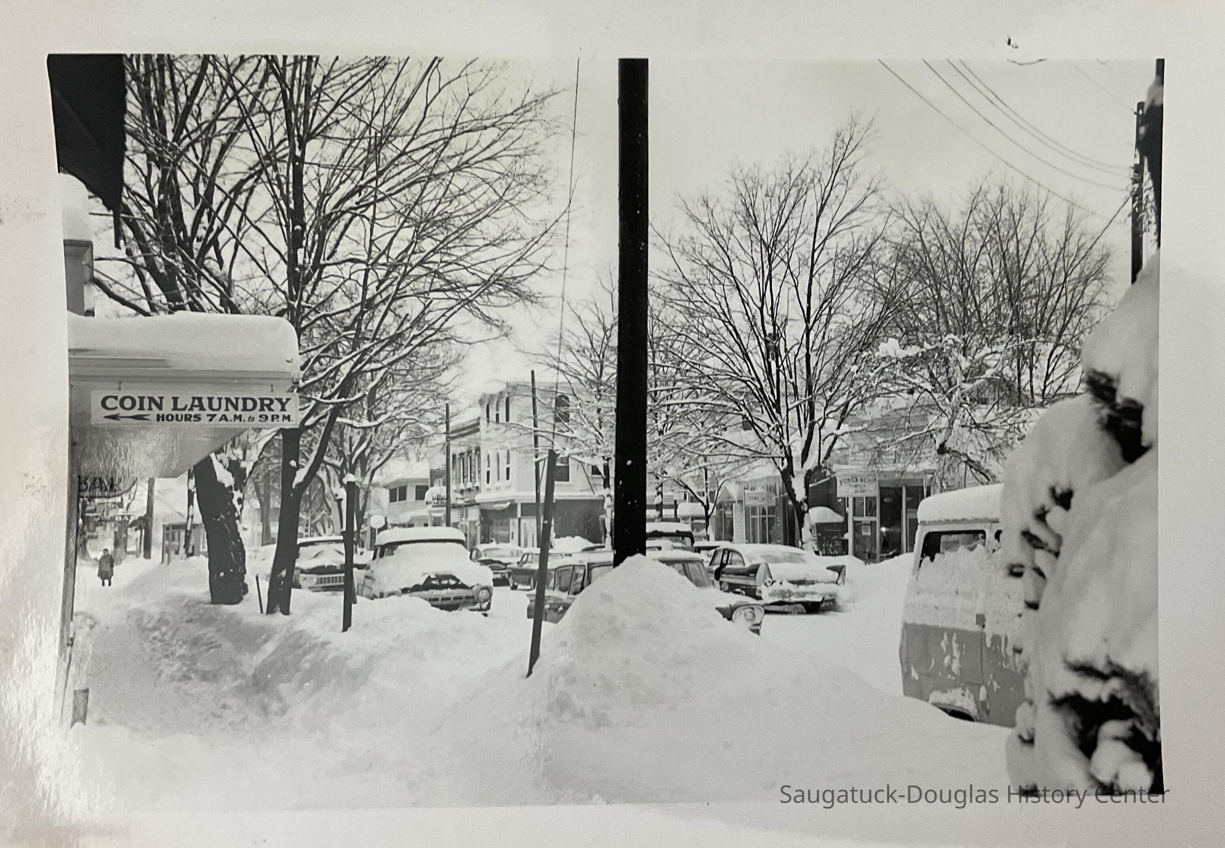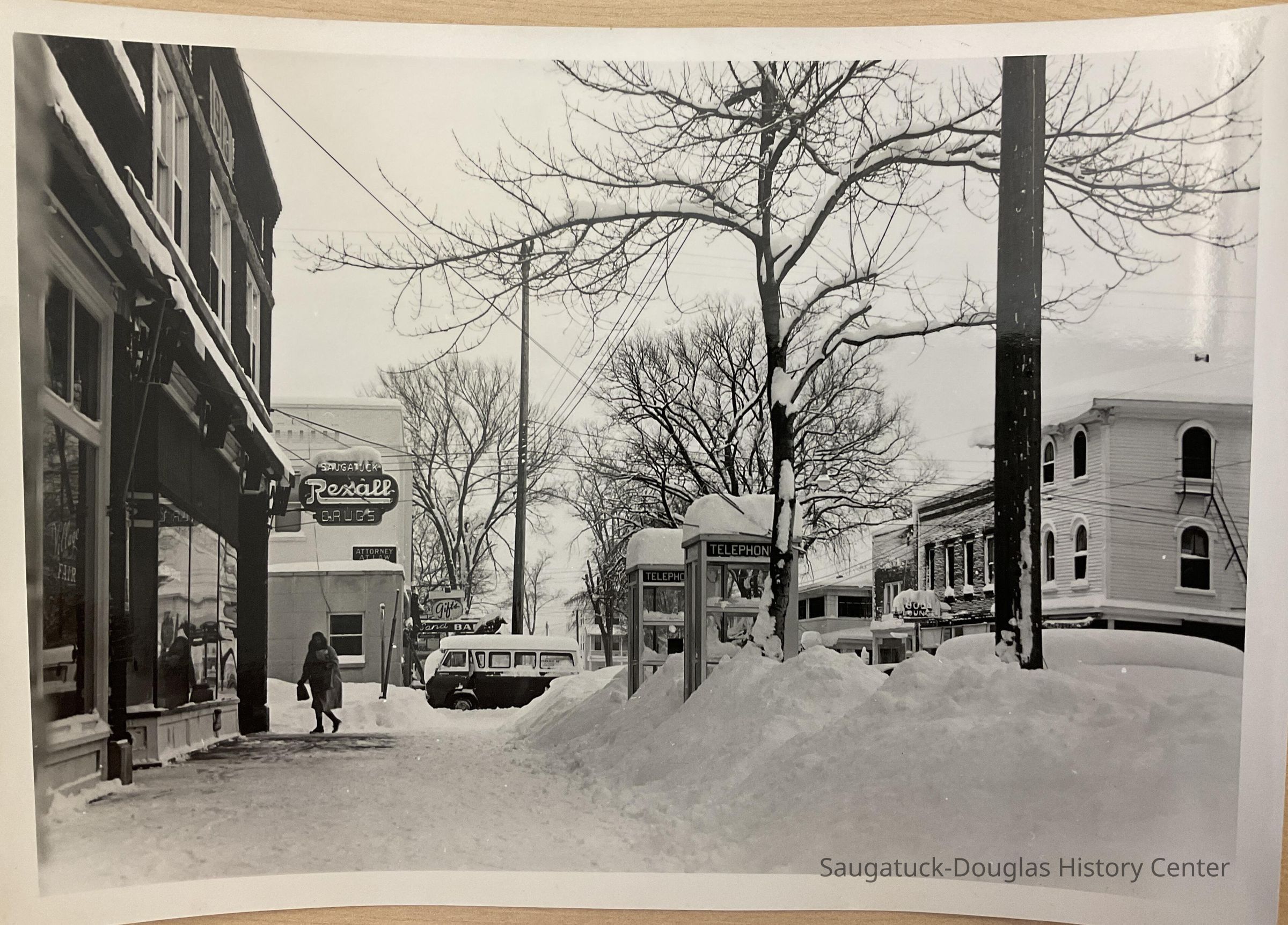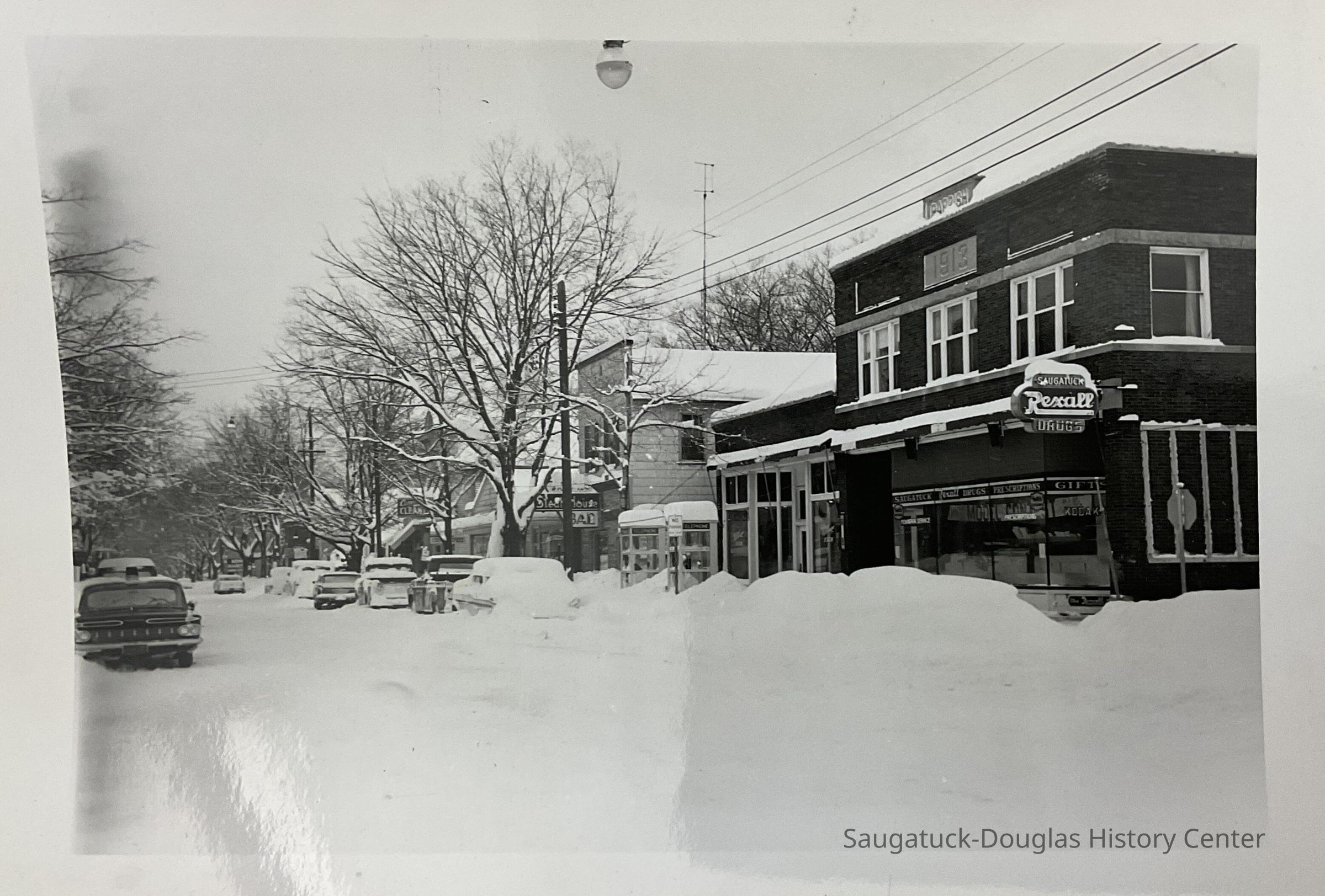 Saugatuck Village Hall, Butler St. in snow, Fruit Growers Bank, The Elms,, The Butler, Flints Dept. Store, Soda Lounge, The Elms Rooms, Country Store Antiques, Post Office, Seymour's Hardware, Bill Schumachers Barbershop, Funk's Newstand, Sand Bar, Allen Antiques, London Shop, Brittain House, Lundgrens Grocery Store, Cook Park photo removing trees, yacht in Kalamazoo River, Beachway Hotel, Old St, Peter's Rectory, Frances House - Campbell Rd., Dr. Miller's House - LakeShore Dr., 4th July Parade Parade - SDHS, Pumpernickels bldg 1971, house on corner of Maple & Allegan, Pavilion fire ruins 1960, Oval Beach - planting flowers