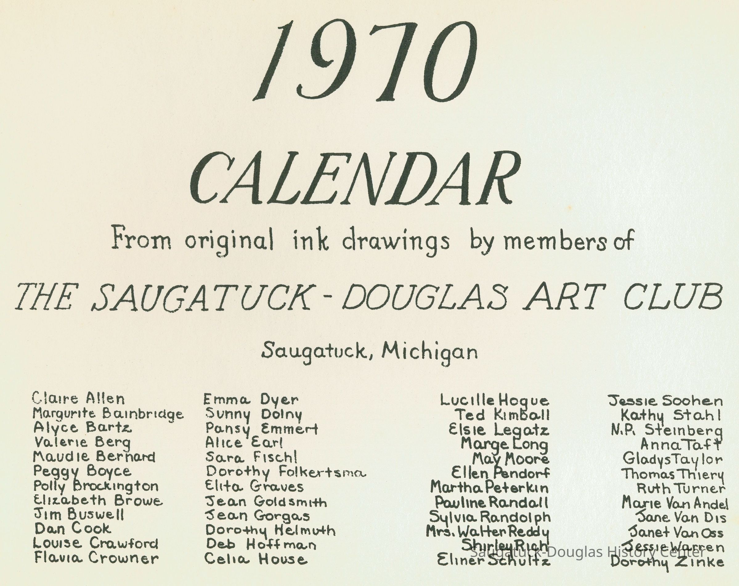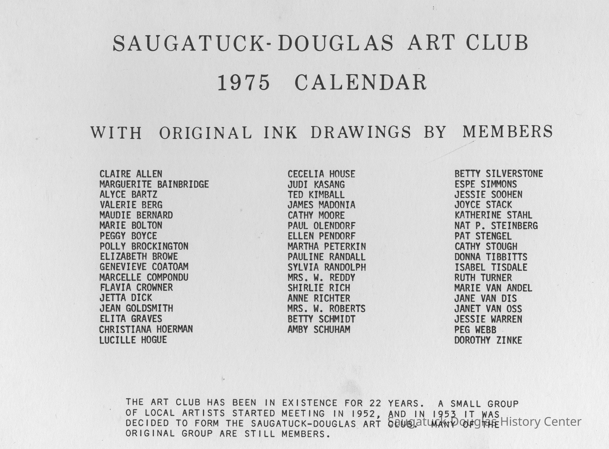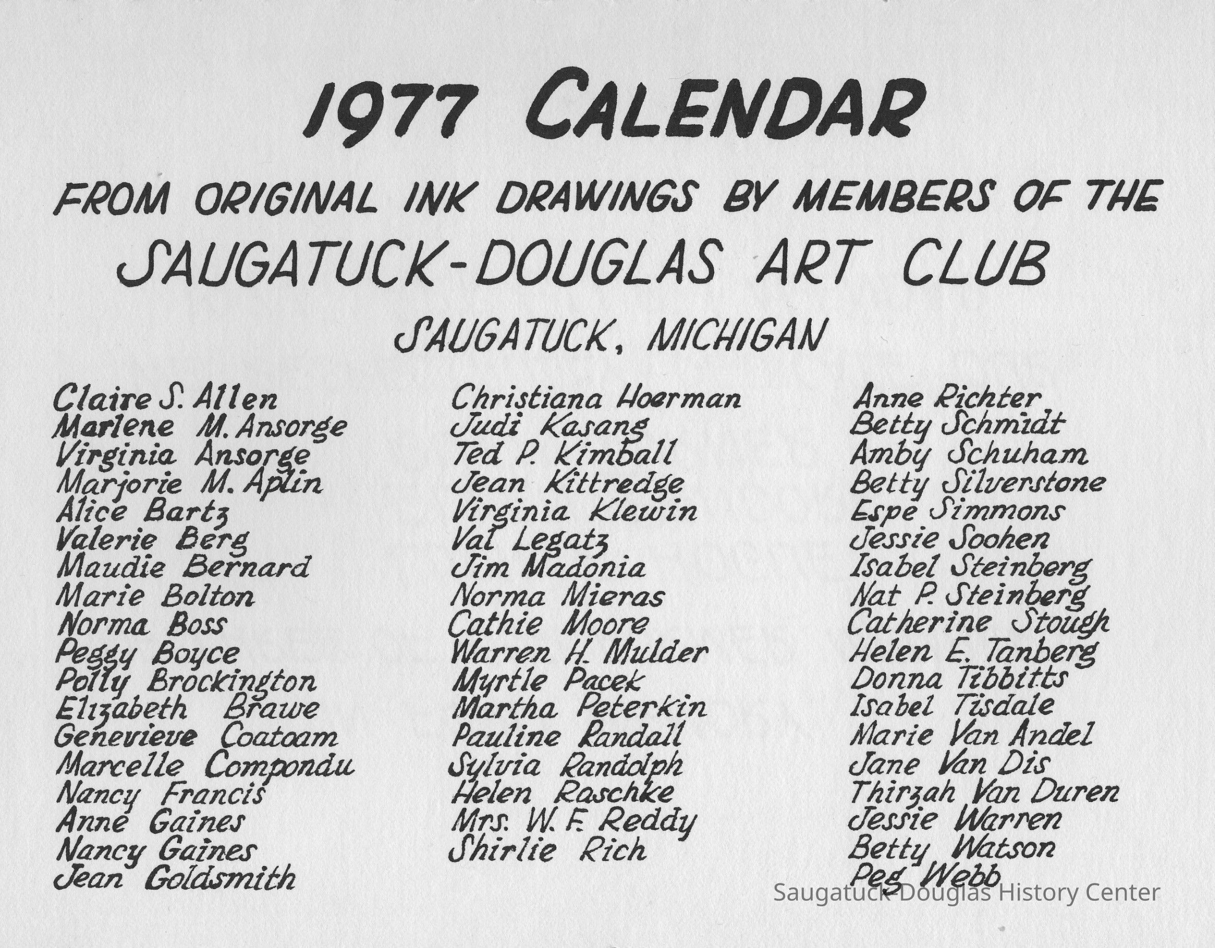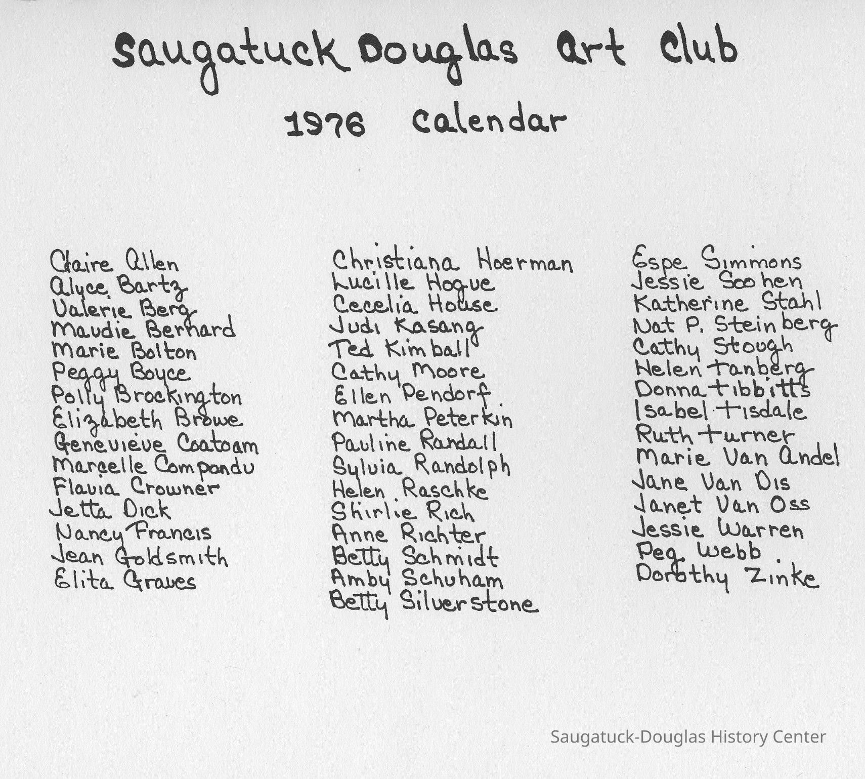 Art Club, Saugatuck Douglas, Aldrich, Jeffrey Lynn 1950-2016, Aplin, Marjorie (MacDonald) 1909-1999, Bekken, Sylvia Anna Edna (Miller) Randolph 1905-2008, Bolton, Marie, Brockington, Pauly, Coatoam, Genevieve (Wright) 1911-2006, Erlandson, Sallie (Klug) 1936-2018, Francis, Nancy Marie (Compondu) 1917-2003, Gotham, Ruth E. 1915-1983, Graves, Elita (Bird) 1897-1991, Hoerman, Christiana A., Hohl, Verne, Kimball, Ted, McCray, Bobbi, Mieras, Norma Arlene (Sjaarda) 1927-2015, Moore, Cathie, Mulder, Ann Elizabeth Betty (Watson) 1930-2011, Mulder, Warren Hudson 1925-2008, Peasley, Nina, Peterkin, Marti, Steinberg, Isabel (Schuham), Steinberg, Nat 1893-1976, Tanberg, Helen E., Van Dis, Jane Ellen (Bird) 1921-2017, Boyce, Peggy (Webster) 1932-2021, Allen, Claire c1921-1977, Goldsmith, Jean D., Madonia, James, Bartz, Alyce, Pendorf, Ellen Fern (Ball) 1907-1975, Bainbridge, Marguerite (Holladay) 1888-1974, Berg, Valerie, Crowner, Marcelle, House, Cecelia, Hogue, Lucille, Olendorf, Paul, Randall, Pauline, Schuham, Amby, Silverstone, Betty J., Simmons, Espe, Tibbitts, Donna, Turner, Ruth 1892-1975, Van Oss, Janet, Crowner, Flavia, Richter, Anne Aurelia (Partridge) 1913-2012, Taft, Anna, Tisdale, Isabel, Wise, Christa (Masters), Zinke, Dorothy, Gorgas, Jean H. (Hemingway) 1901-1972, Helmuth, Dorothy, Hoffman, Debbie, Van Andel, Georgia (Marie)