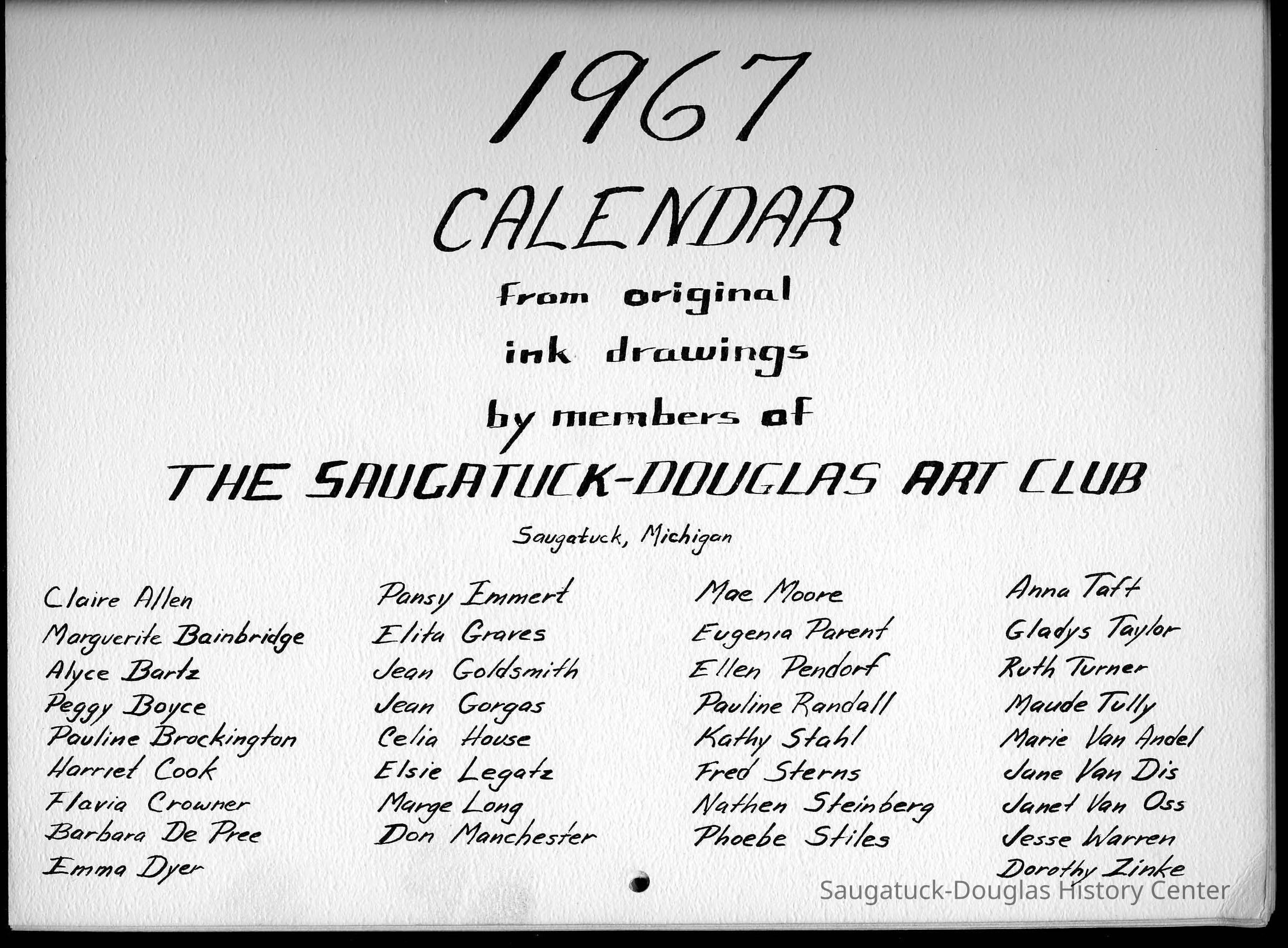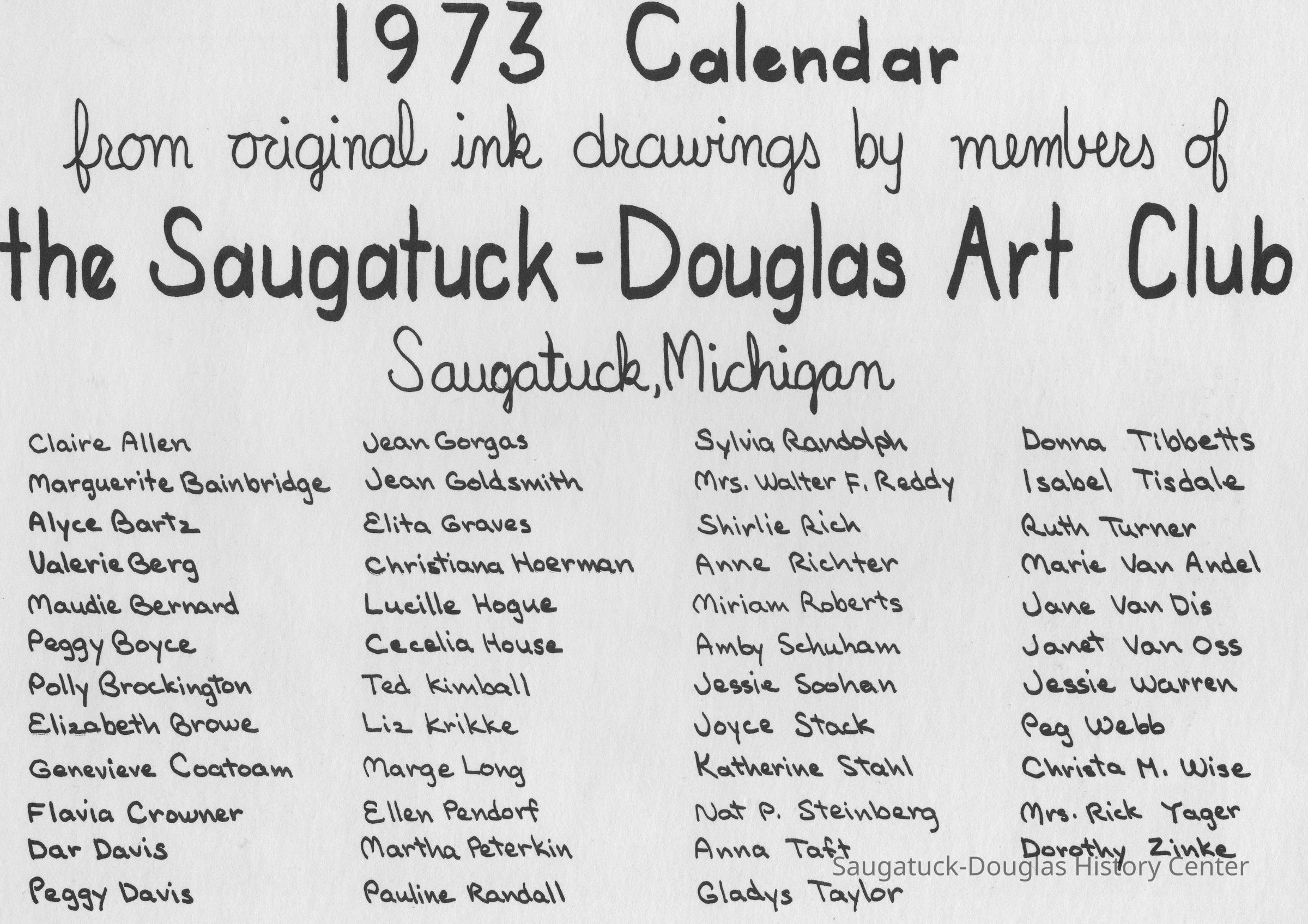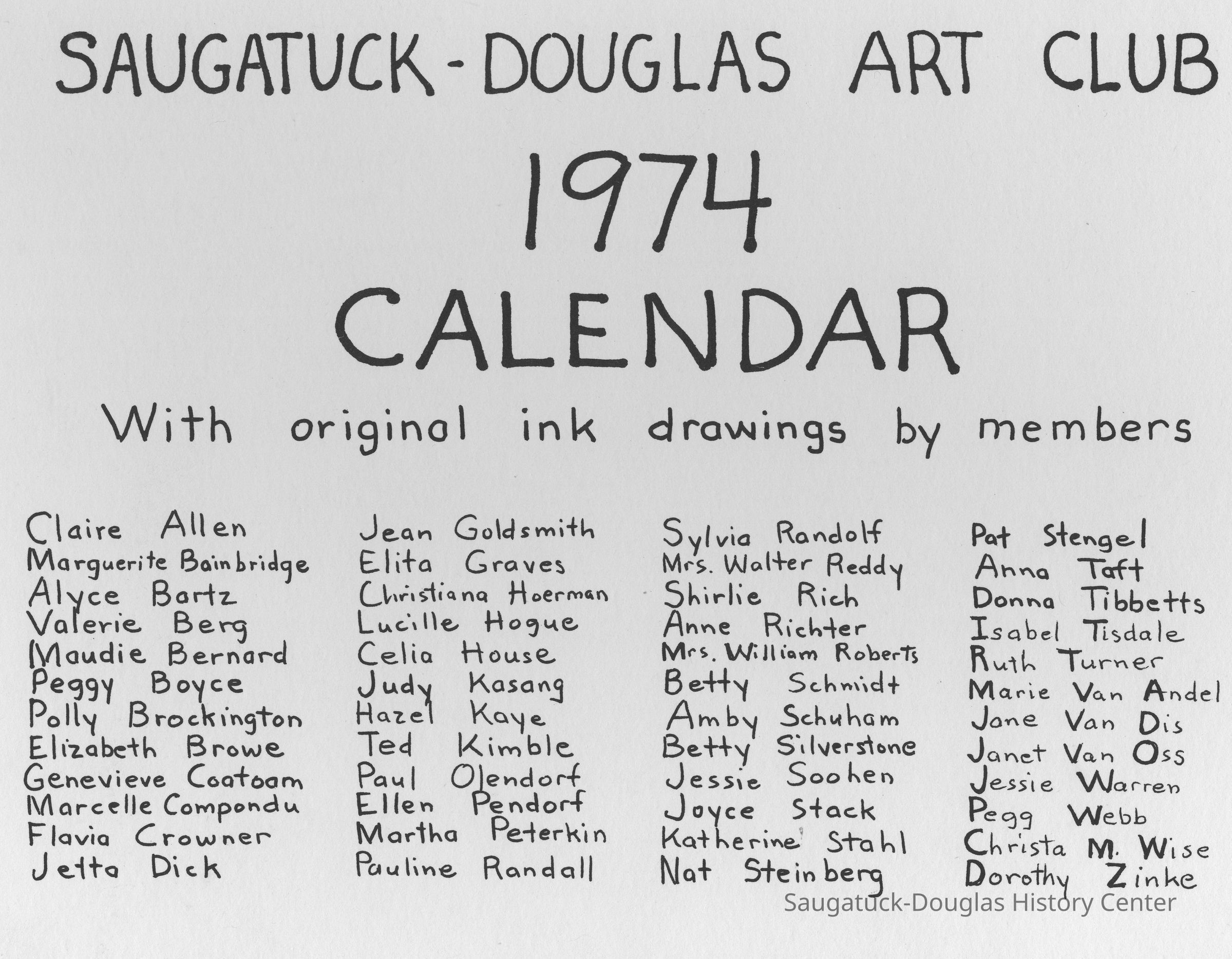 Art Club, Saugatuck Douglas, Aldrich, Jeffrey Lynn 1950-2016, Aplin, Marjorie (MacDonald) 1909-1999, Bekken, Sylvia Anna Edna (Miller) Randolph 1905-2008, Bolton, Marie, Brockington, Pauly, Coatoam, Genevieve (Wright) 1911-2006, Erlandson, Sallie (Klug) 1936-2018, Francis, Nancy Marie (Compondu) 1917-2003, Gotham, Ruth E. 1915-1983, Graves, Elita (Bird) 1897-1991, Hoerman, Christiana A., Hohl, Verne, Kimball, Ted, McCray, Bobbi, Mieras, Norma Arlene (Sjaarda) 1927-2015, Moore, Cathie, Mulder, Ann Elizabeth Betty (Watson) 1930-2011, Mulder, Warren Hudson 1925-2008, Peasley, Nina, Peterkin, Marti, Steinberg, Isabel (Schuham), Steinberg, Nat 1893-1976, Tanberg, Helen E., Van Dis, Jane Ellen (Bird) 1921-2017, Boyce, Peggy (Webster) 1932-2021, Allen, Claire c1921-1977, Goldsmith, Jean D., Madonia, James, Bartz, Alyce, Pendorf, Ellen Fern (Ball) 1907-1975, Bainbridge, Marguerite (Holladay) 1888-1974, Berg, Valerie, Crowner, Marcelle, House, Cecelia, Hogue, Lucille, Olendorf, Paul, Randall, Pauline, Schuham, Amby, Silverstone, Betty J., Simmons, Espe, Tibbitts, Donna, Turner, Ruth 1892-1975, Van Oss, Janet, Crowner, Flavia, Richter, Anne Aurelia (Partridge) 1913-2012, Taft, Anna, Tisdale, Isabel, Wise, Christa (Masters), Zinke, Dorothy, Gorgas, Jean H. (Hemingway) 1901-1972, Helmuth, Dorothy, Hoffman, Debbie, Van Andel, Georgia (Marie)