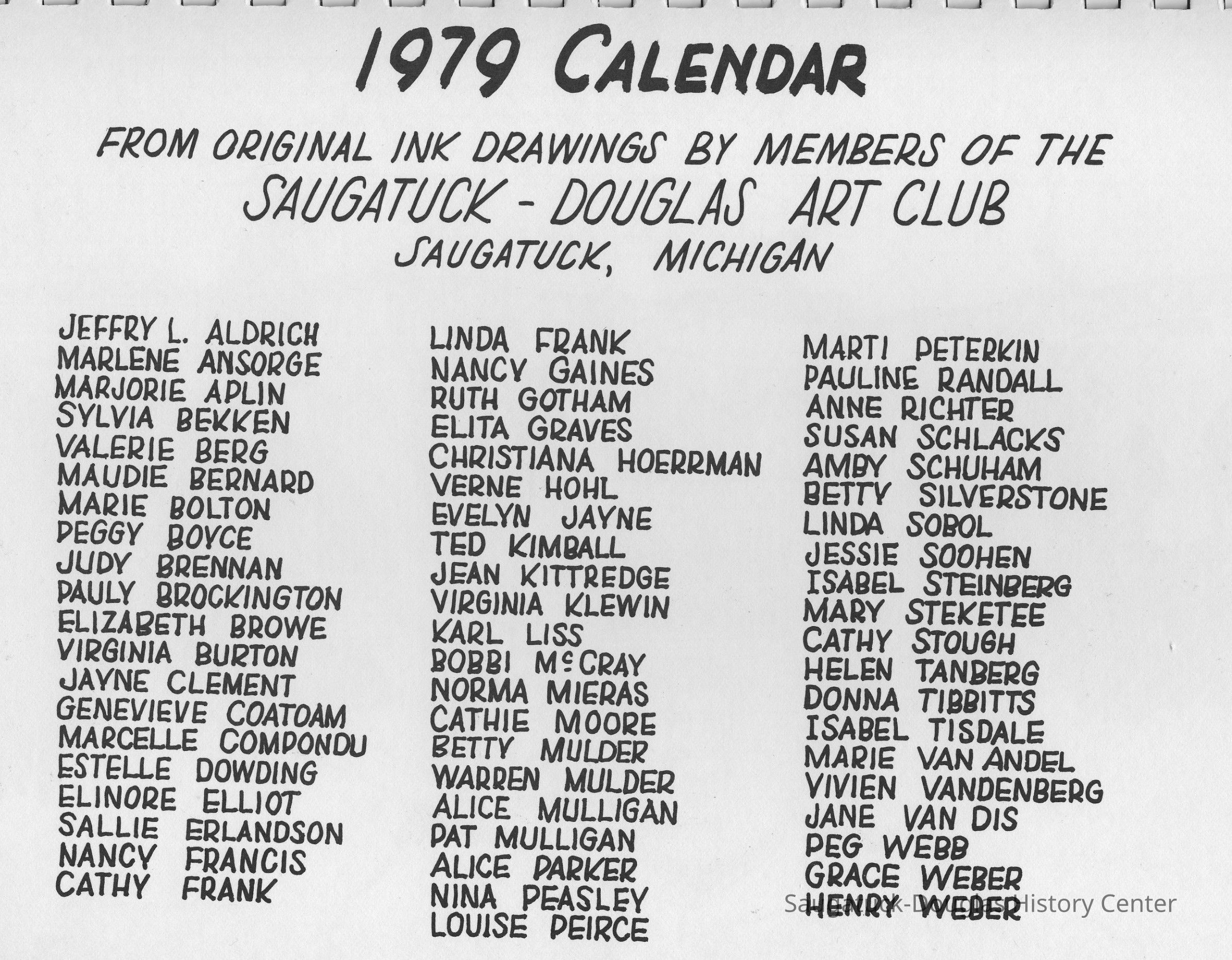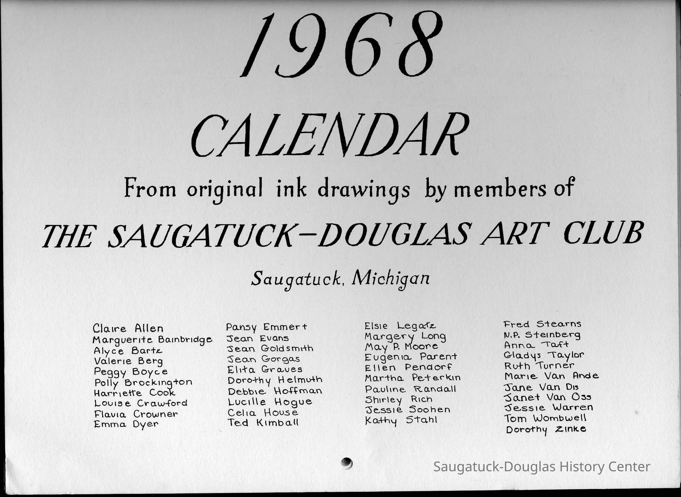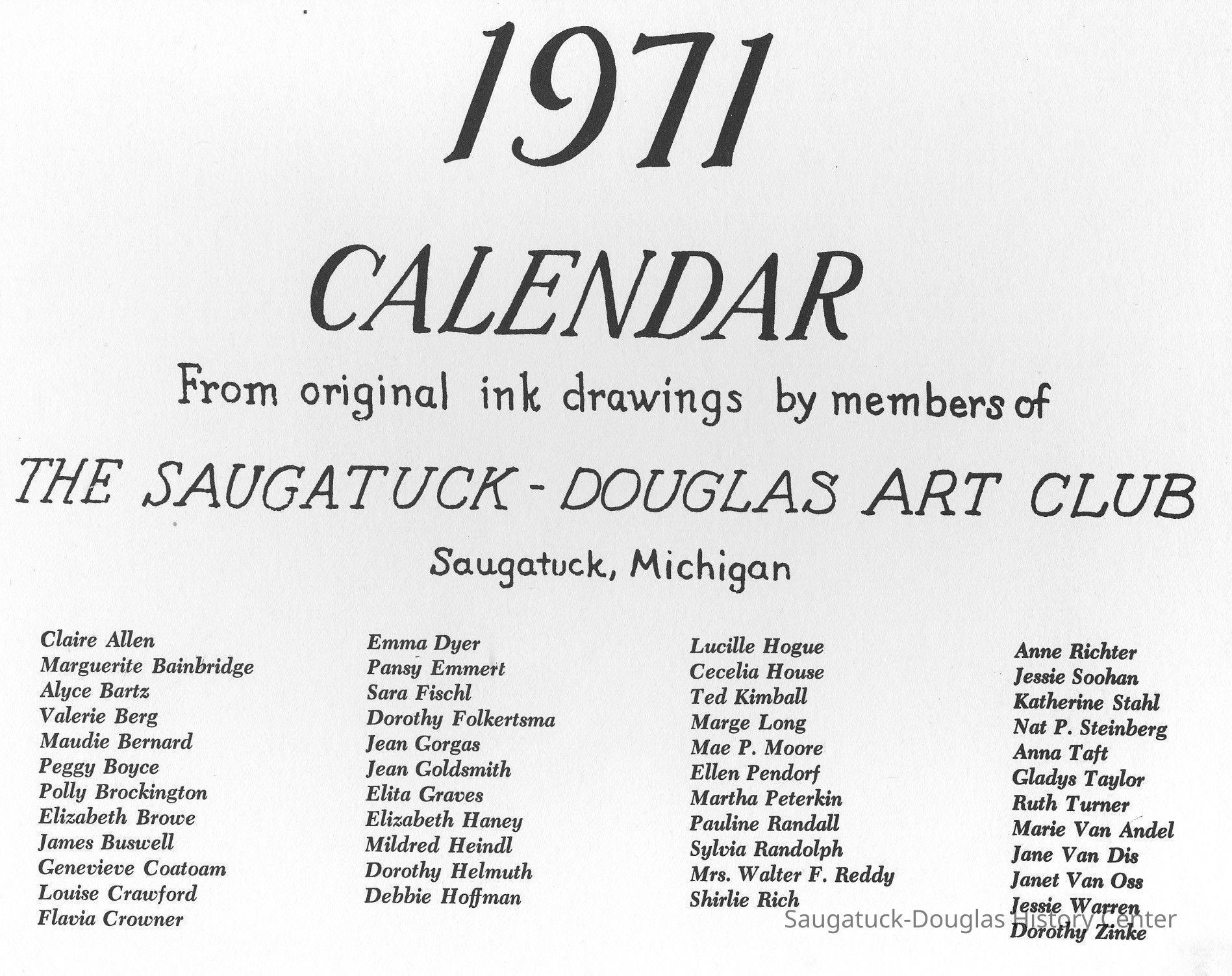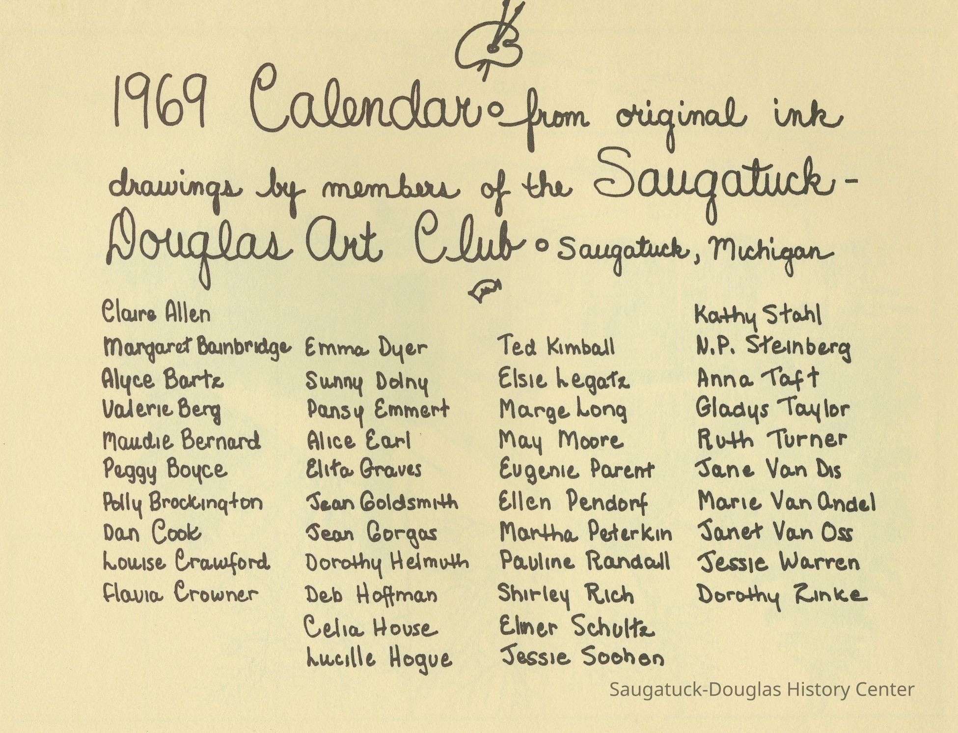 Art Club, Saugatuck Douglas, Aldrich, Jeffrey Lynn 1950-2016, Aplin, Marjorie (MacDonald) 1909-1999, Bekken, Sylvia Anna Edna (Miller) Randolph 1905-2008, Bolton, Marie, Brockington, Pauly, Coatoam, Genevieve (Wright) 1911-2006, Erlandson, Sallie (Klug) 1936-2018, Francis, Nancy Marie (Compondu) 1917-2003, Gotham, Ruth E. 1915-1983, Graves, Elita (Bird) 1897-1991, Hoerman, Christiana A., Hohl, Verne, Kimball, Ted, McCray, Bobbi, Mieras, Norma Arlene (Sjaarda) 1927-2015, Moore, Cathie, Mulder, Ann Elizabeth Betty (Watson) 1930-2011, Mulder, Warren Hudson 1925-2008, Peasley, Nina, Peterkin, Marti, Steinberg, Isabel (Schuham), Steinberg, Nat 1893-1976, Tanberg, Helen E., Van Dis, Jane Ellen (Bird) 1921-2017, Boyce, Peggy (Webster) 1932-2021, Allen, Claire c1921-1977, Goldsmith, Jean D., Madonia, James, Bartz, Alyce, Pendorf, Ellen Fern (Ball) 1907-1975, Bainbridge, Marguerite (Holladay) 1888-1974, Berg, Valerie, Crowner, Marcelle, House, Cecelia, Hogue, Lucille, Olendorf, Paul, Randall, Pauline, Schuham, Amby, Silverstone, Betty J., Simmons, Espe, Tibbitts, Donna, Turner, Ruth 1892-1975, Van Oss, Janet, Crowner, Flavia, Richter, Anne Aurelia (Partridge) 1913-2012, Taft, Anna, Tisdale, Isabel, Wise, Christa (Masters), Zinke, Dorothy, Gorgas, Jean H. (Hemingway) 1901-1972, Helmuth, Dorothy, Hoffman, Debbie, Van Andel, Georgia (Marie)