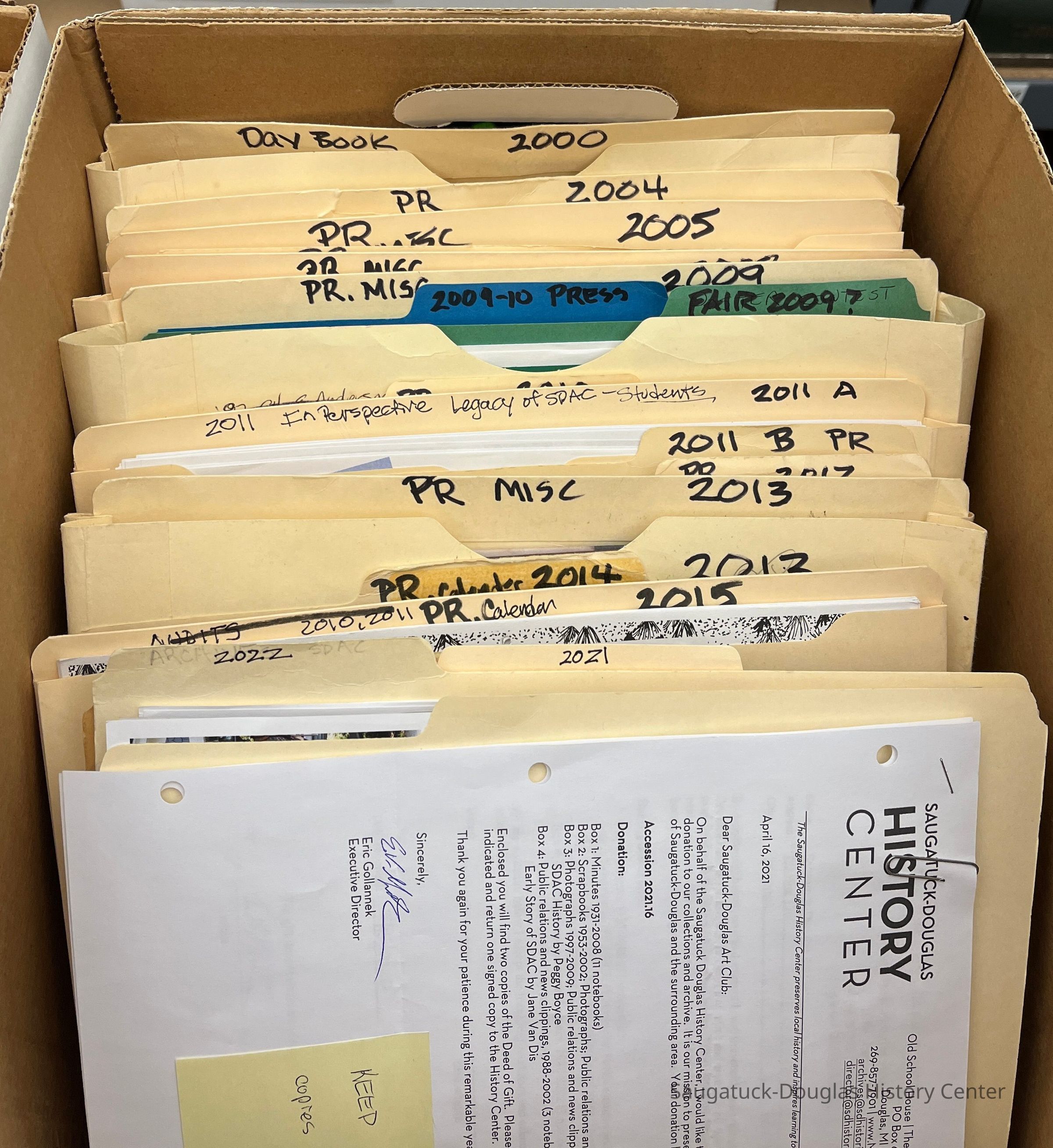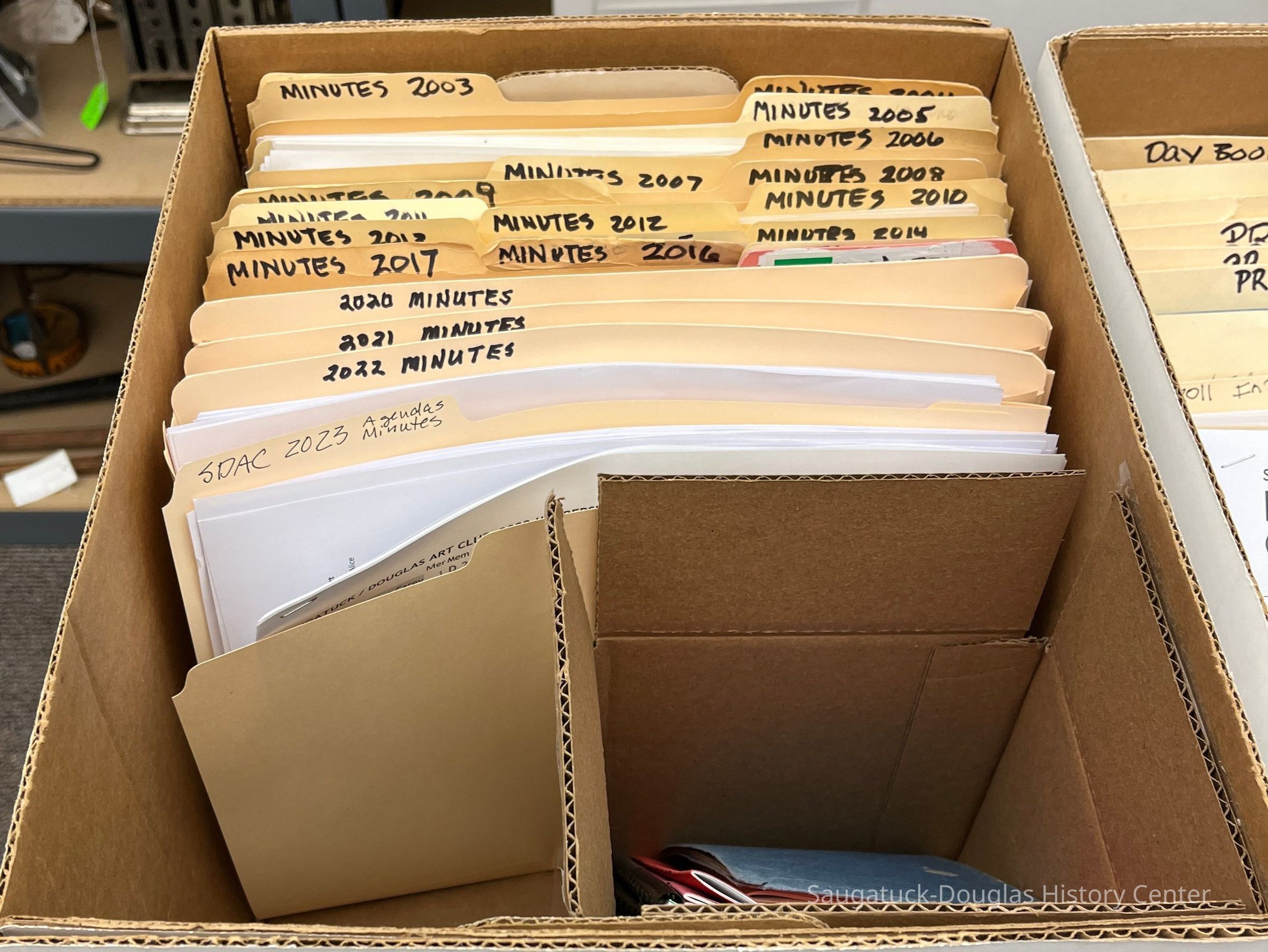 Two bankers boxes of documents generated by the Saugatuck-Douglas Art Club. These boxes were added to four boxes donated to the archives in 2021 [2021.16].