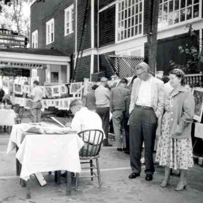Digital images of adults looking at landscape paintings at an art sale outside the Big Pavilion. The unframed artworks are on paper and hung on ropes in a clothesline art show. The peoples clothing suggest the sale happened in the 1950s.