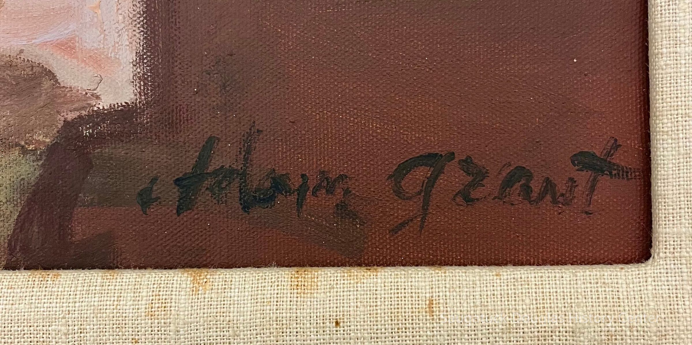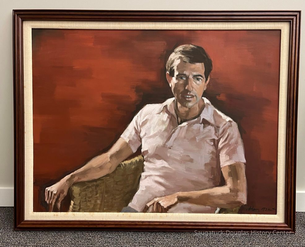 A young Arthur Fredrick seated in an armchair. The sitter and red background is executed in bold brush strokes. Arthur is wearing a pink polo shirt and is lit from the viewers left side. The canvas is behind a 1.25" beige linen mat with 2" cherrywood-tone frame. A label on the back of the frame is from the "Frame Shop Toledo."Type of Painting