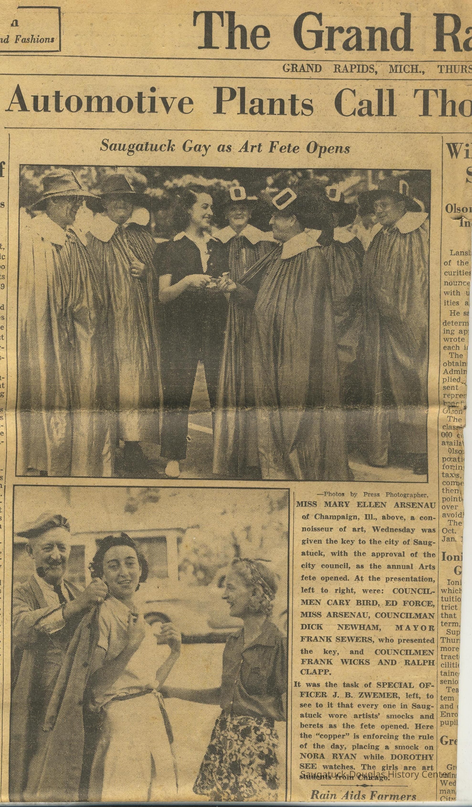 Two photographic prints of Saugatuck village leaders dressed in pilgrim or musketeer costumes that include broad-brimmed hats with plumes and oversize buckles, long cloaks with wide collars. Saugatuck president Frank Sewers is giving a village key to Mary Ellen Arsenau of Champaign, Illinois because the initially-intended recipient Lyman Atwood Marshall of Detroit was not present. Photo taken to promote the annual Arts Fete organized by the Saugatuck Art association.