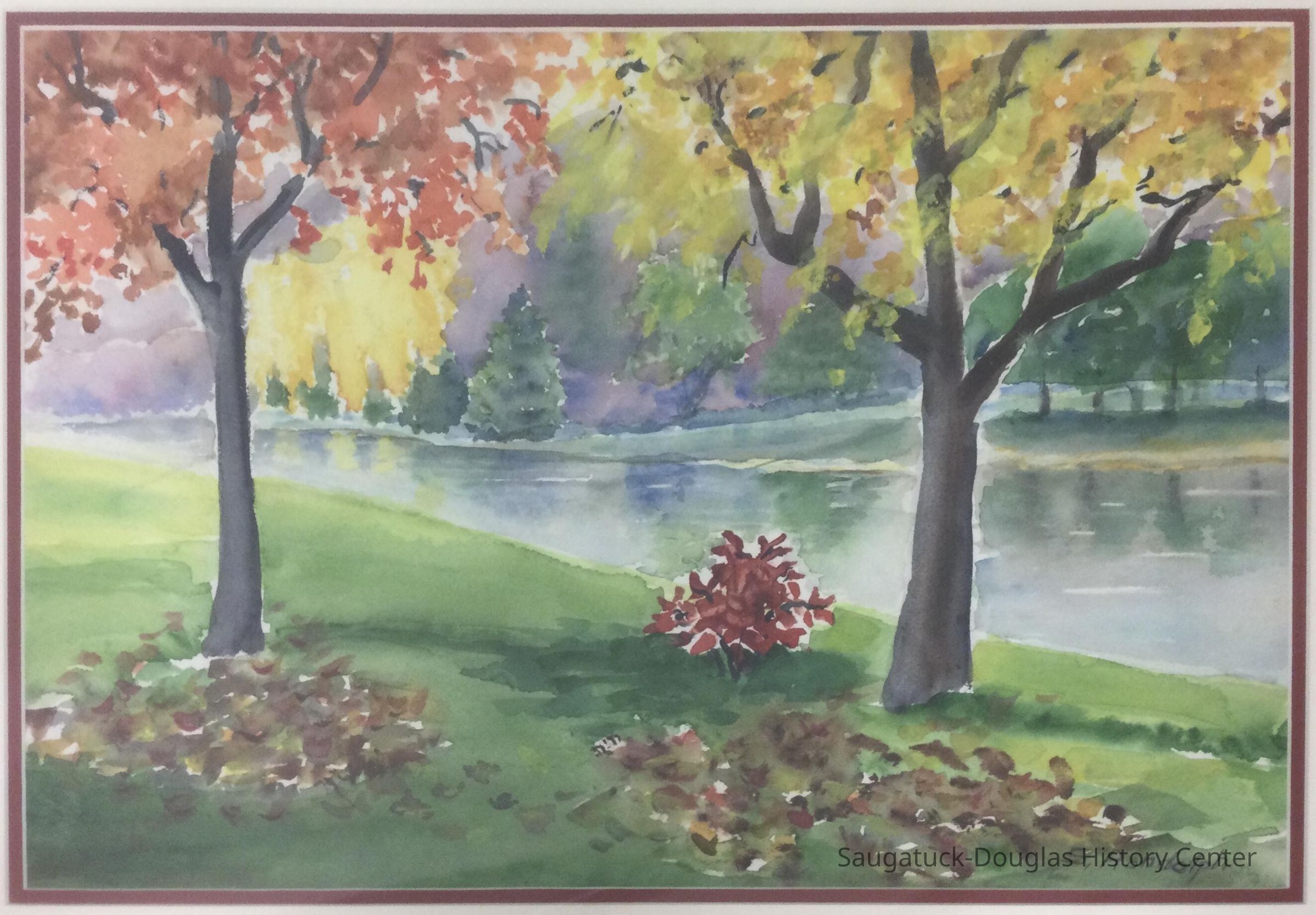 This late watercolor captures the exuherance typical of Randolph's work. Here, she records and interprets a bright auntumn day along the river.Type of Painting