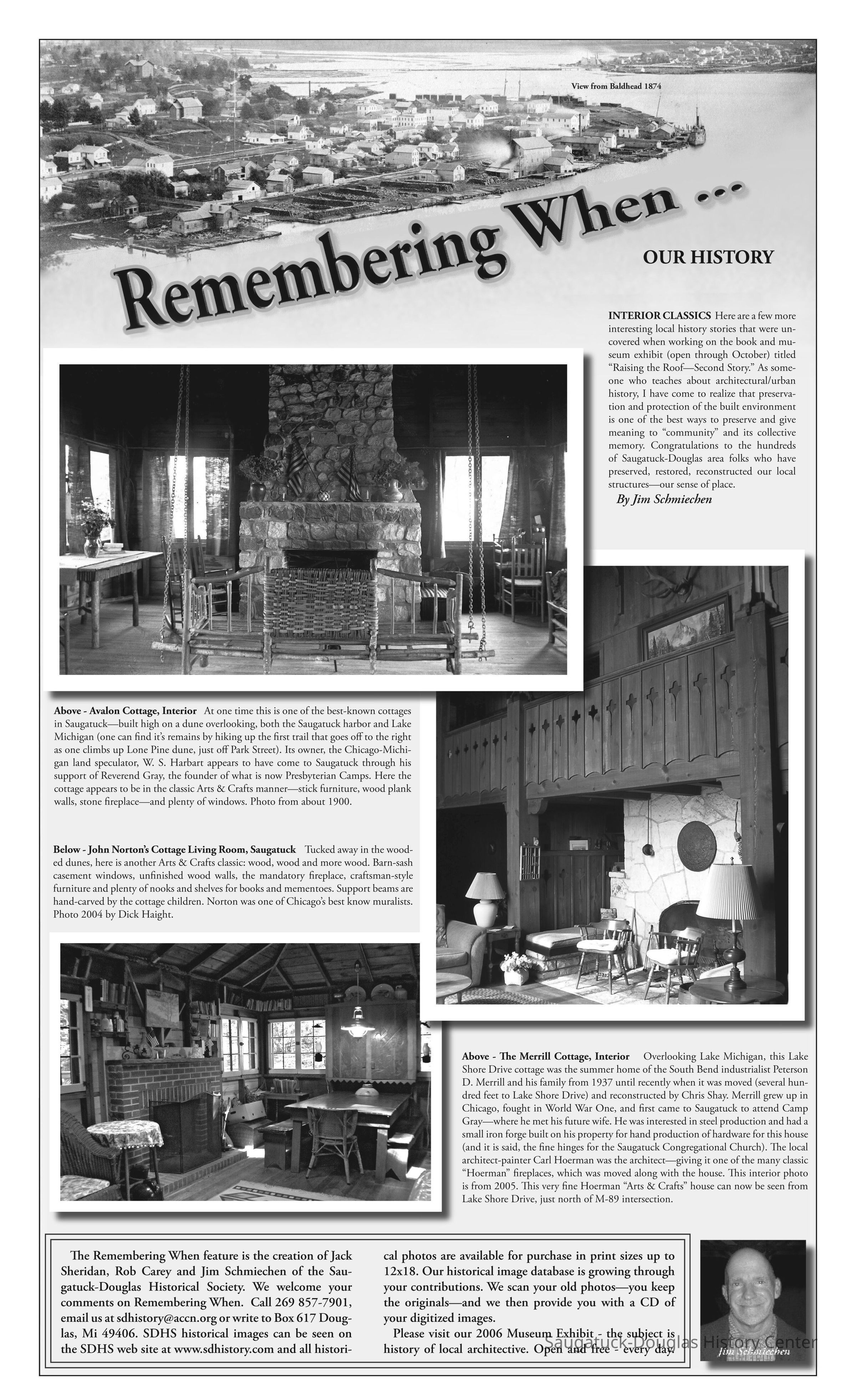 INTERIOR CLASSICS Here are a few more interesting local history stories that were uncovered when working on the book and museum exhibit (open through October) titled “Raising the Roof—Second Story.” As someone who teaches about architectural/urban history, I have come to realize that preservation and protection of the built environment is one of the best ways to preserve and give meaning to “community” and its collective memory. Congratulations to the hundreds of Saugatuck-Douglas area folks who have preserved, restored, reconstructed our local structures—our sense of place.