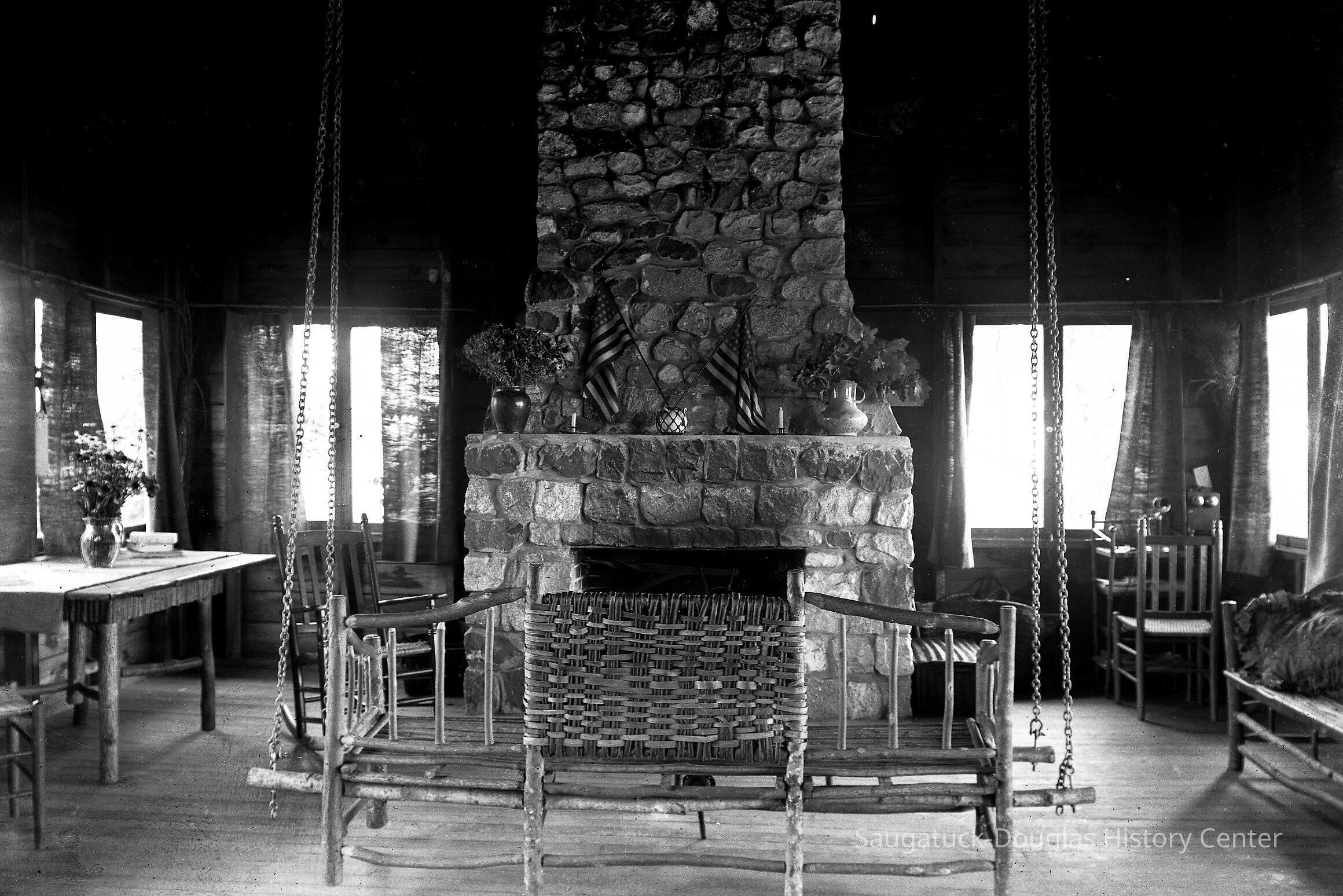 Above - Avalon Cottage, Interior At one time this is one of the best-known cottages in Saugatuck—built high on a dune overlooking, both the Saugatuck harbor and Lake Michigan (one can find it’s remains by hiking up the first trail that goes off to the right as one climbs up Lone Pine dune, just off Park Street). Its owner, the Chicago-Michigan land speculator, W. S. Harbart appears to have come to Saugatuck through his support of Reverend Gray, the founder of what is now Presbyterian Camps. Here the cottage appears to be in the classic Arts & Crafts manner—stick furniture, wood plank walls, stone fireplace—and plenty of windows. Photo from about 1900.