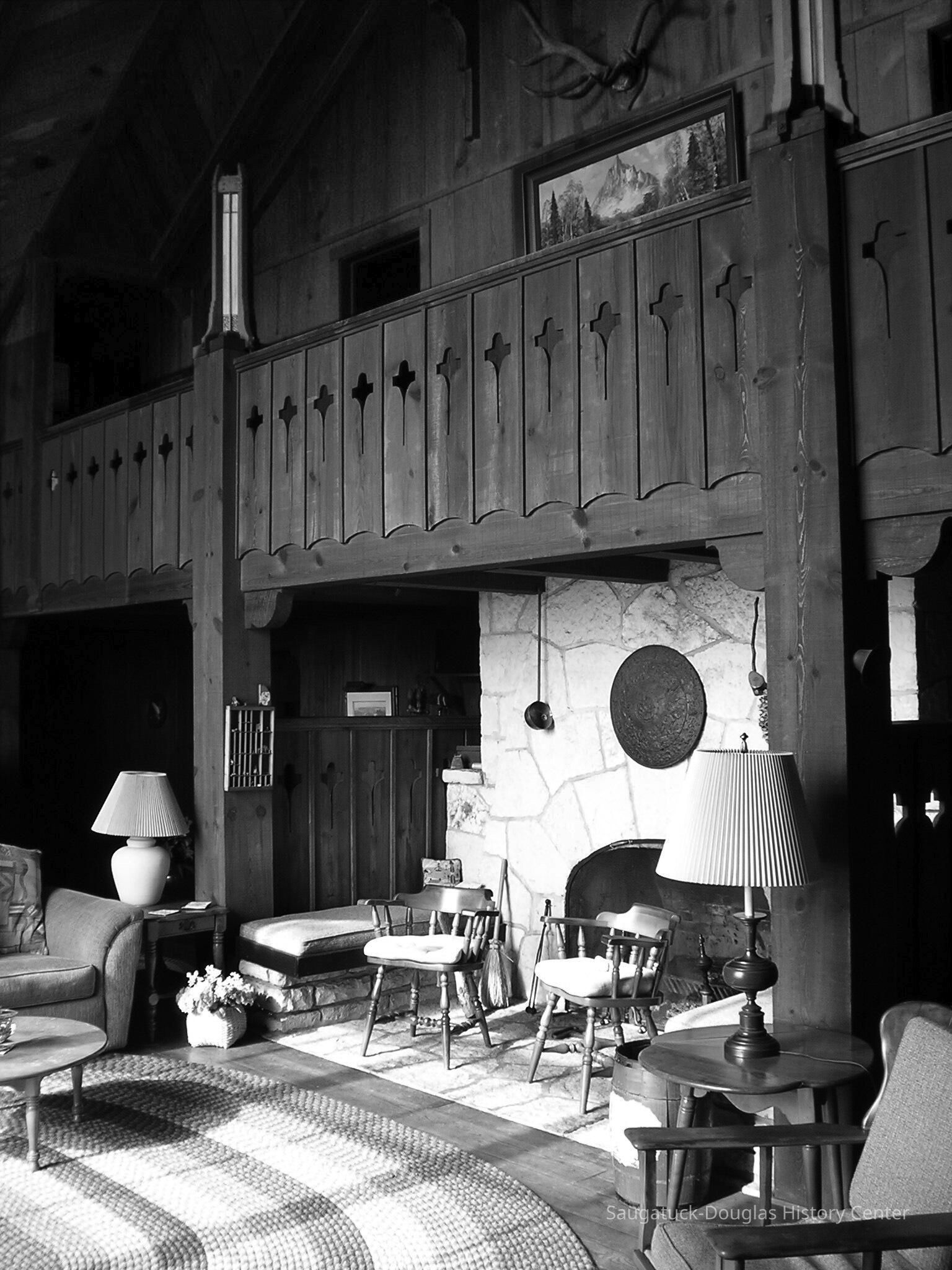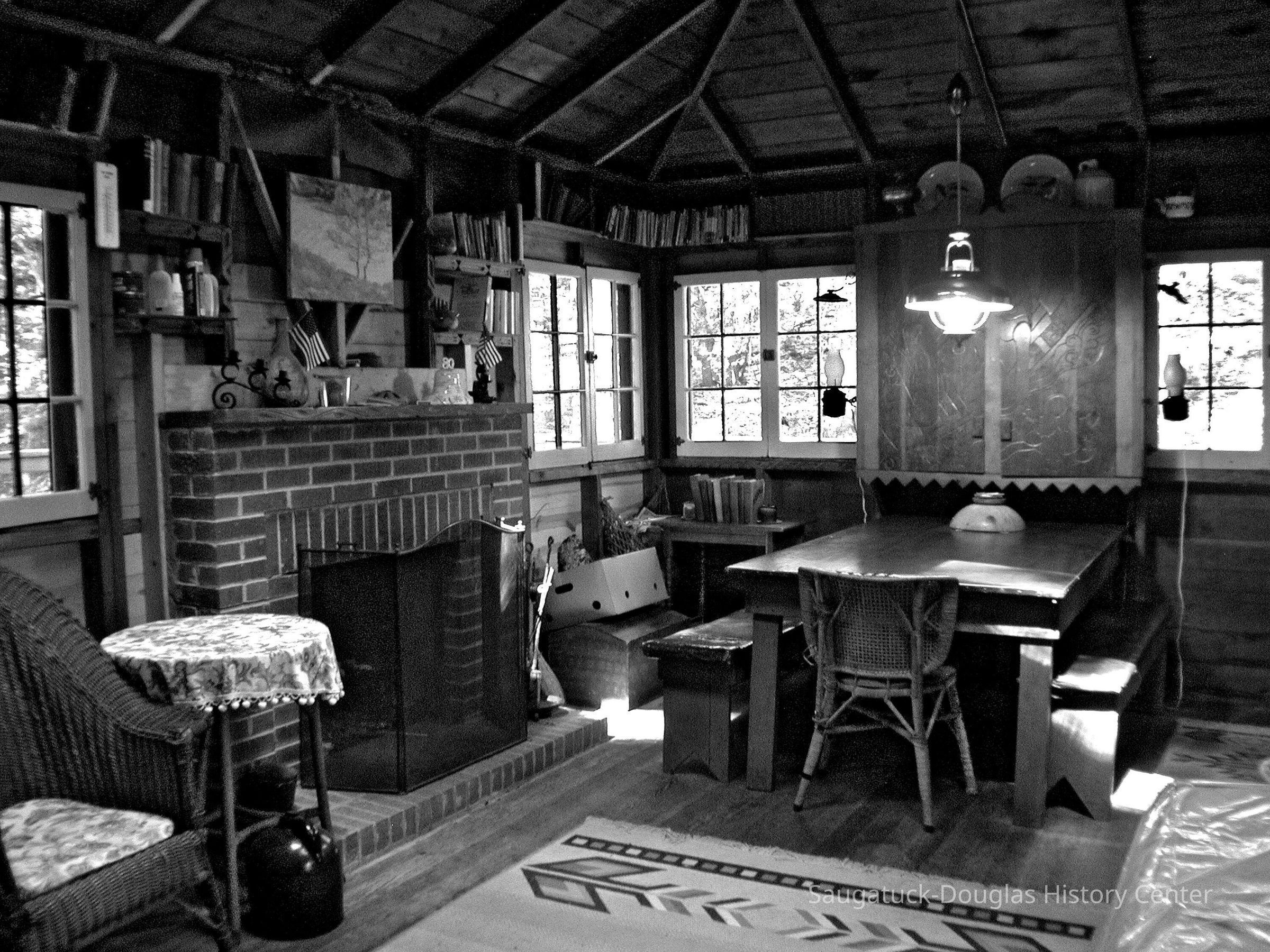 Above - The Merrill Cottage, Interior Overlooking Lake Michigan, this Lake Shore Drive cottage was the summer home of the South Bend industrialist Peterson D. Merrill and his family from 1937 until recently when it was moved (several hundred feet to Lake Shore Drive) and reconstructed by Chris Shay. Merrill grew up in Chicago, fought in World War One, and first came to Saugatuck to attend Camp Gray—where he met his future wife. He was interested in steel production and had a small iron forge built on his property for hand production of hardware for this house (and it is said, the fine hinges for the Saugatuck Congregational Church). The local architect-painter Carl Hoerman was the architect—giving it one of the many classic “Hoerman” fireplaces, which was moved along with the house. This interior photo is from 2005. This very fine Hoerman “Arts & Crafts” house can now be seen from Lake Shore Drive, just north of M-89 intersection.Collection