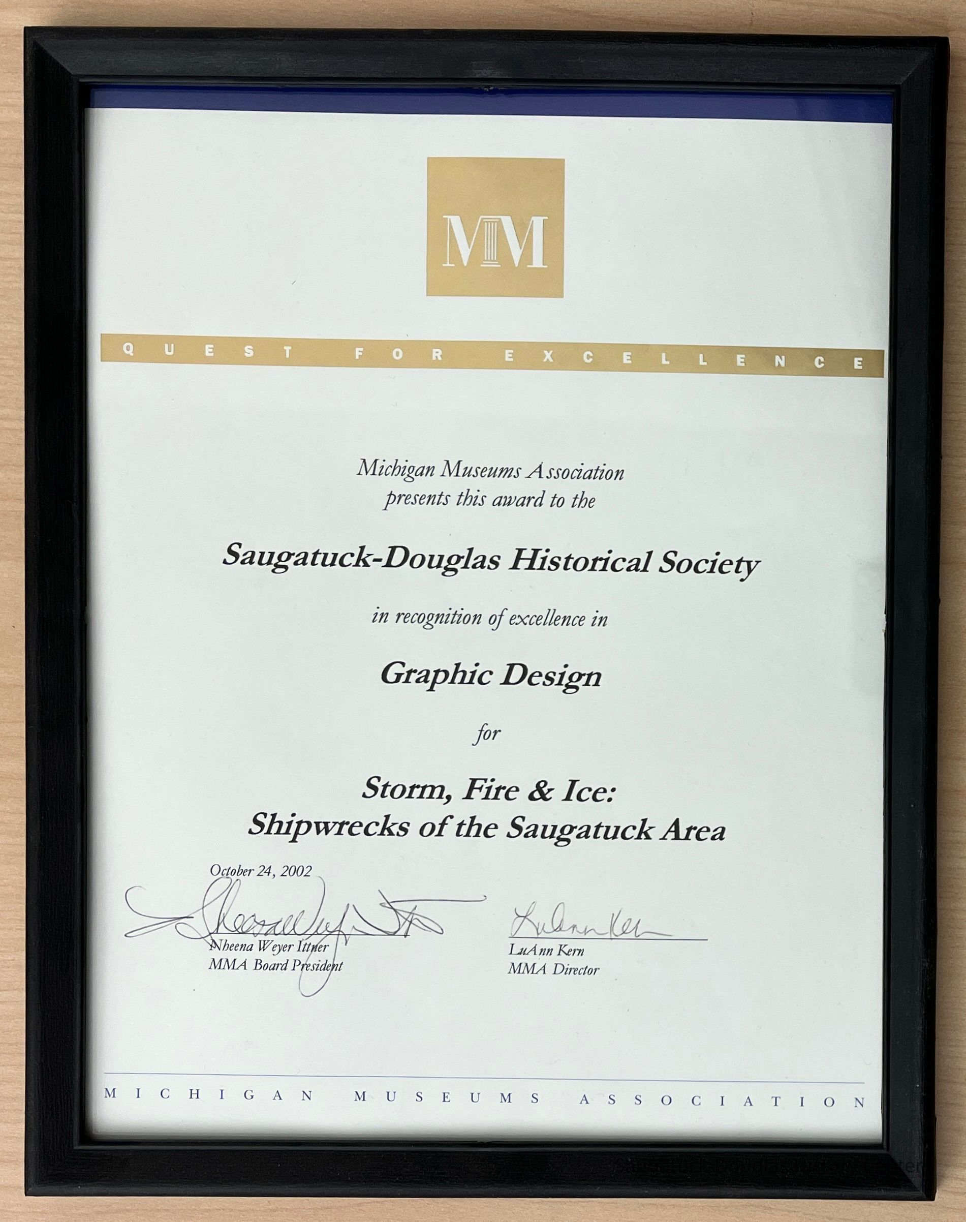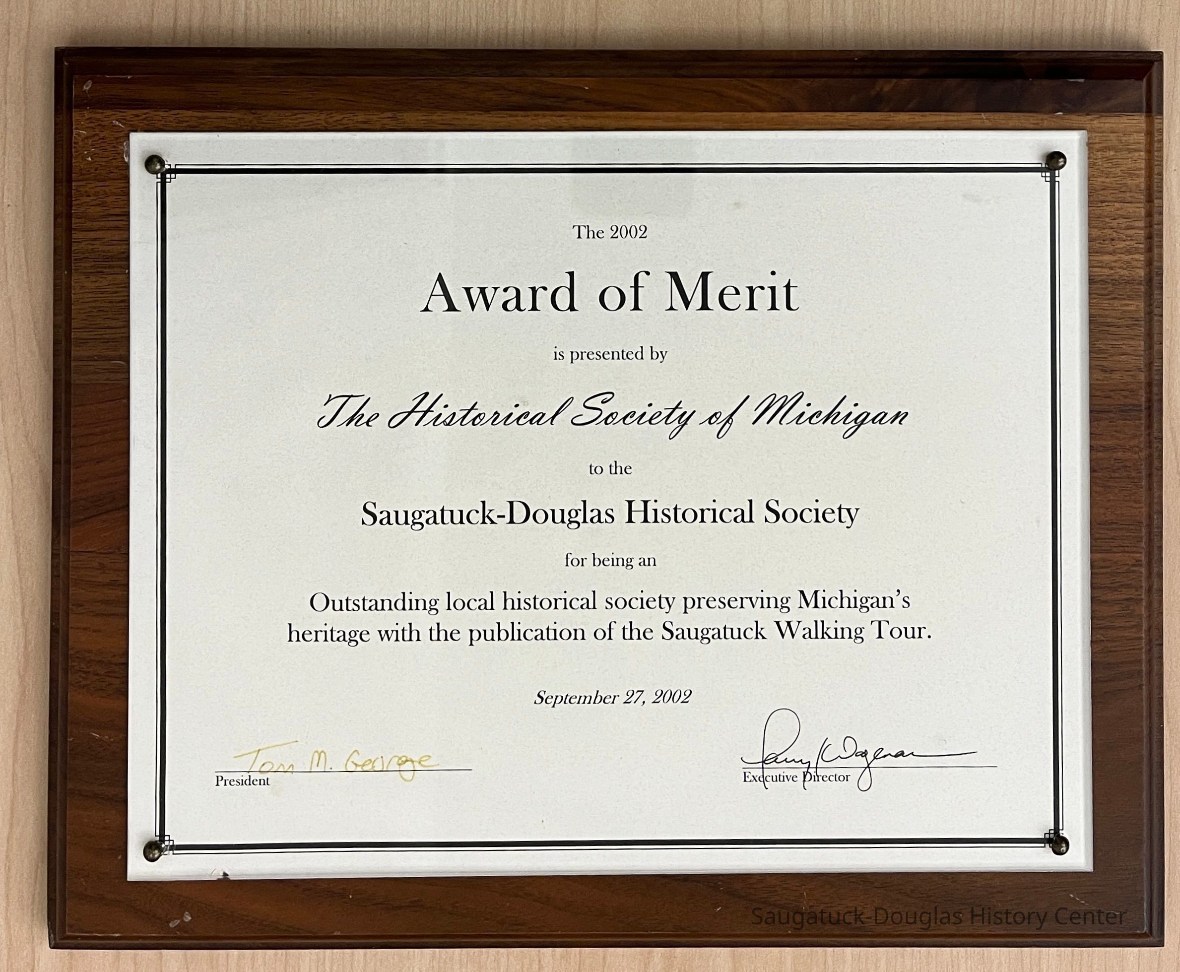 A. 2002 from Historical Society of Michigan for Saugatuck Walking Tour