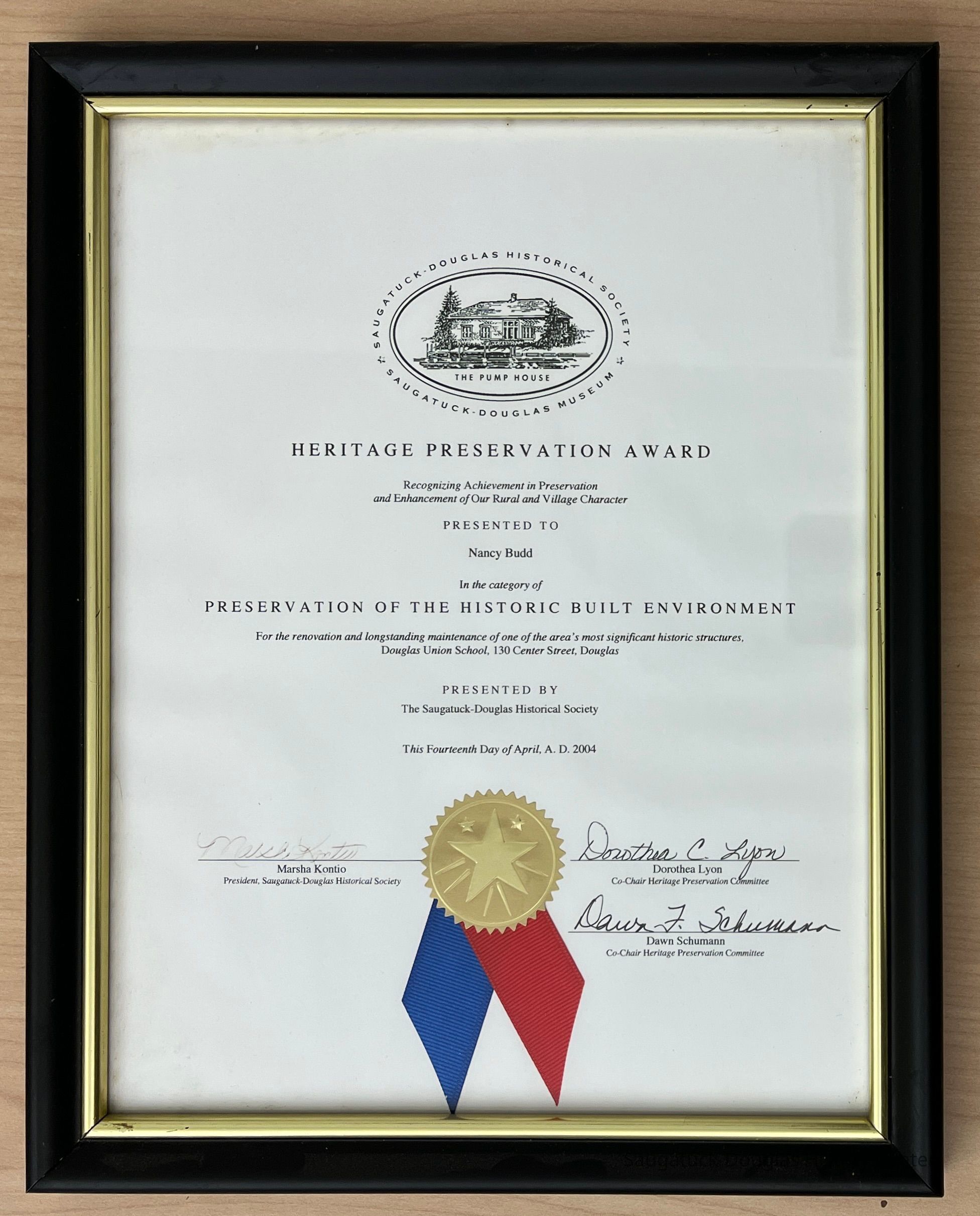 F. 2004 SDHS Heritage Preservation award to Nancy Budd for longstanding maintenance of Douglas Union School.