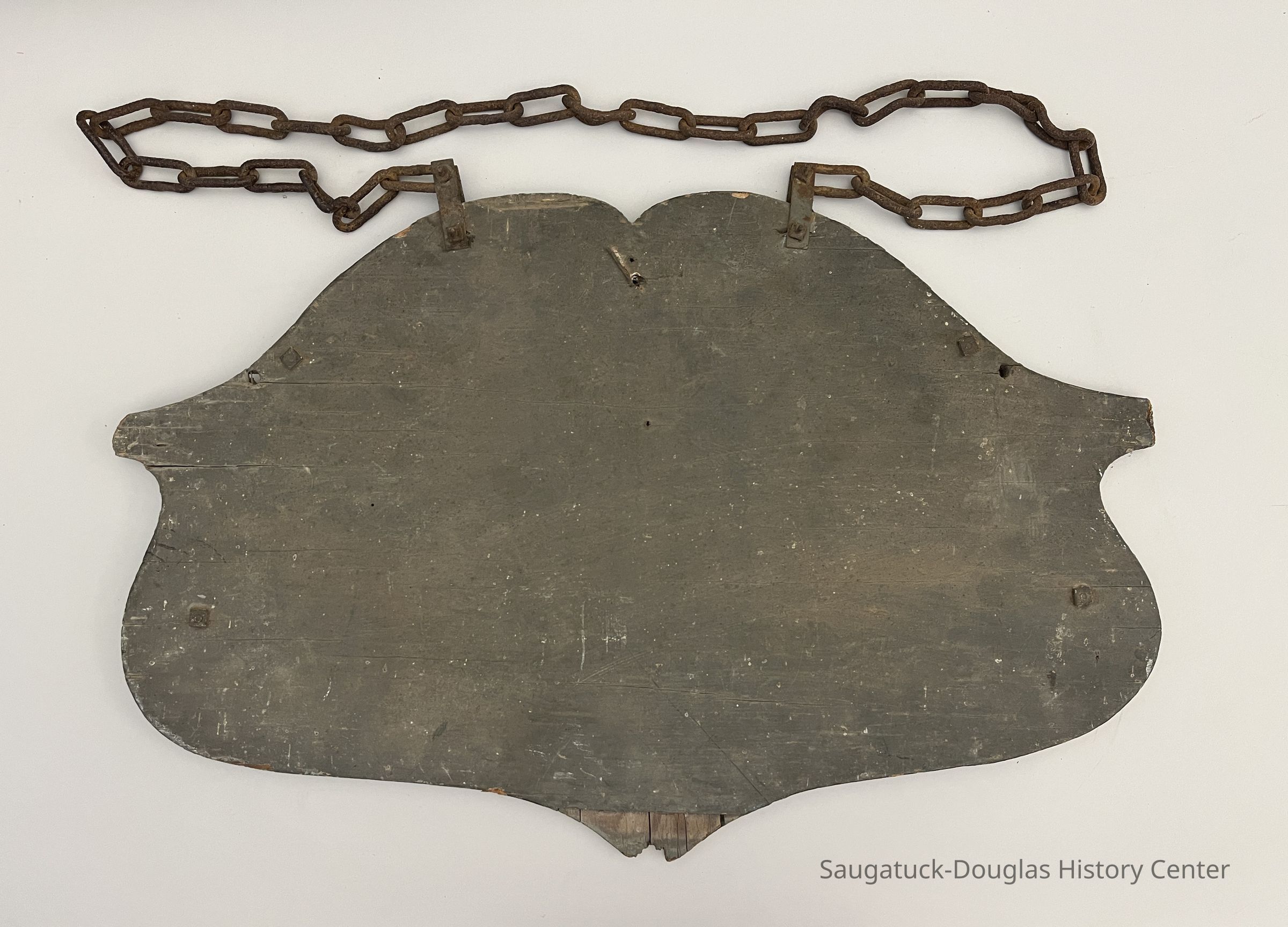 Flat, plywood painted wood sign in a crest shape with an approximately 32-inch metal chain for hanging. The sign's central medallion is painted beige with "Gallery Entrance" in a Gothic/Blackletter script with the G and E painted red.Context
