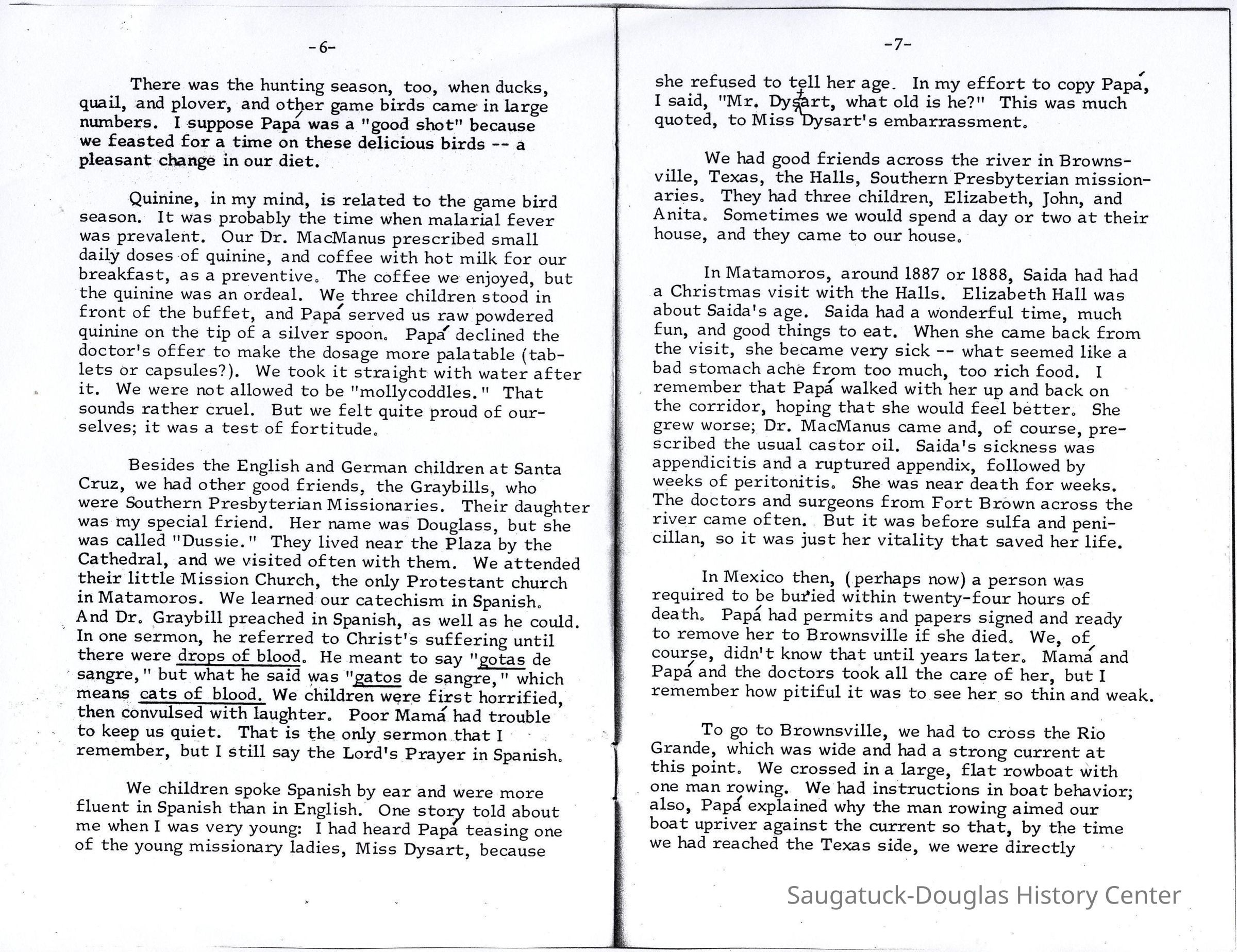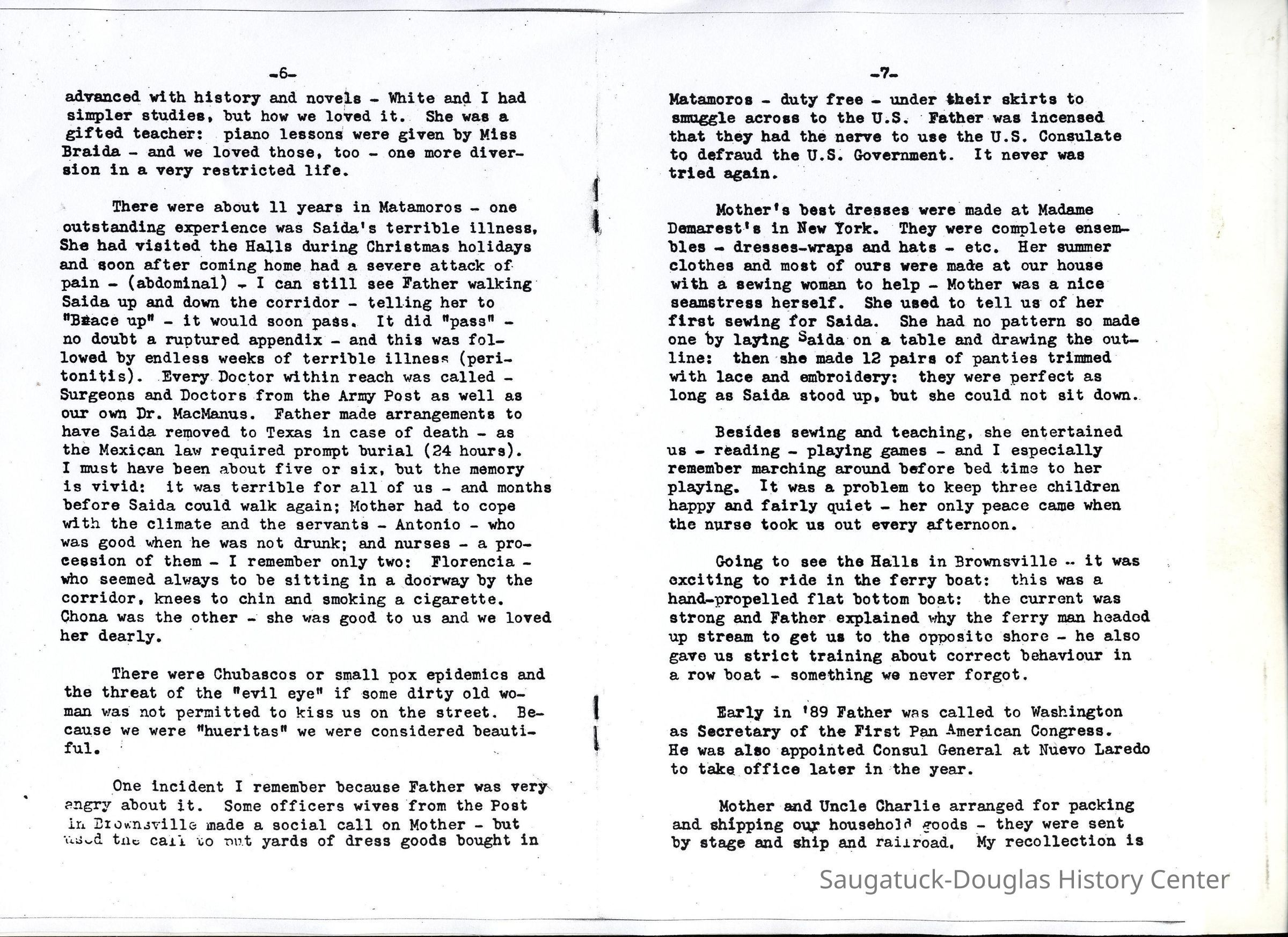 In Matamoros, around 1887 or 1888, Saida had had a Christmas visit with the Halls. Elizabeth Hall was about Saida's age. Saida had a wonderful time, much fun, and good things to eat. When she came back from the visit, she became very sick -- what seemed like a bad stomach ache from too much, too rich food. I remember that Papa walked with her up and back on the corridor, hoping that she would feel better. She grew worse; Dr. MacManus came and, of course, prescribed the usual castor oil. Saida's sickness was appendicitis and a ruptured appendix, followed by weeks of peritonitis. She was near death for weeks. The doctors and surgeons from Fort Brown across the river came often. But it was before sulfa and penicillan, so it was just her vitality that saved her life.