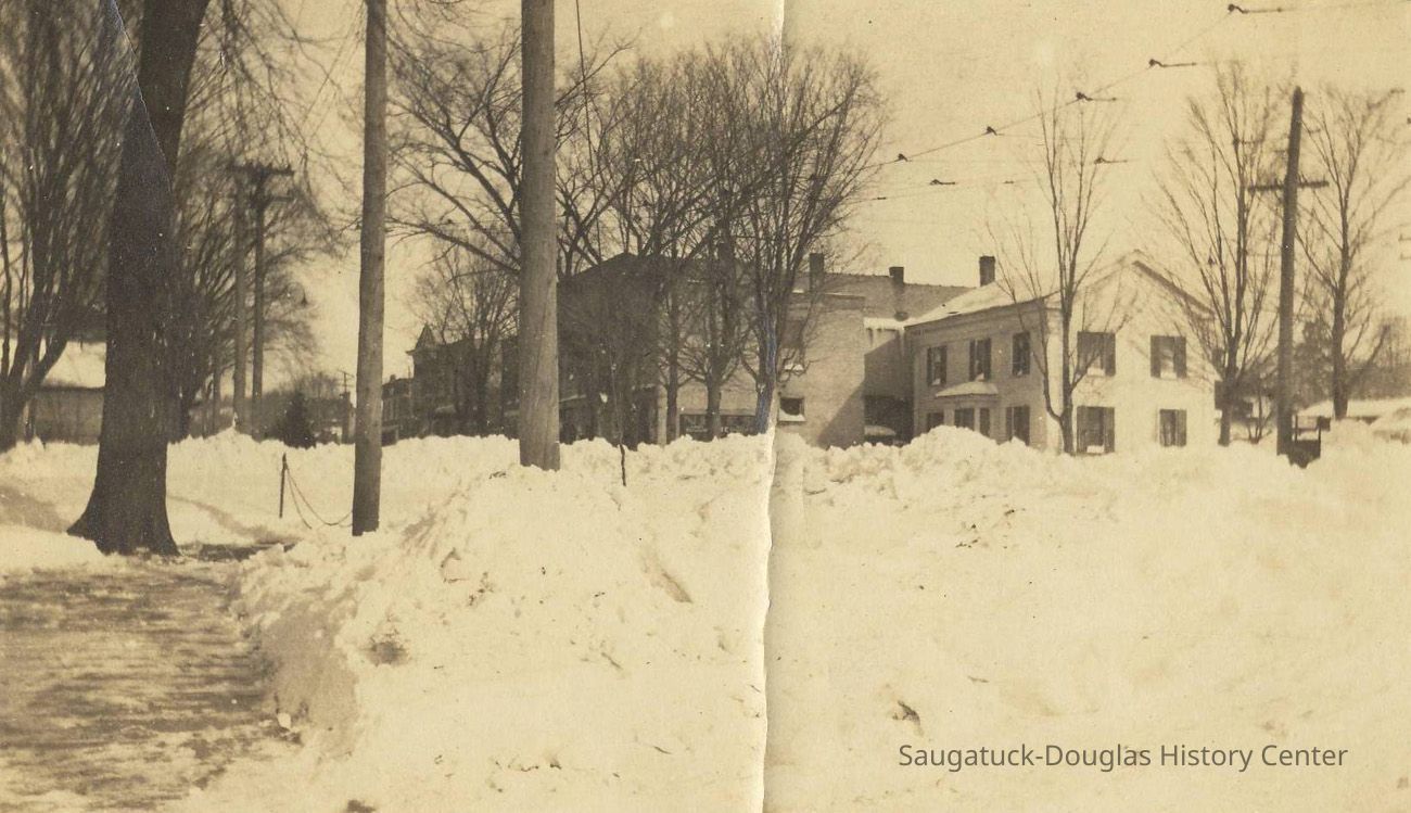 2 - Three people talking, one leaning on a snow shovel, in the Interurban track turnaround loop. Saugatuck Village Hall visible on the left. Note on back "Where Interurban used to come on corner by Village Hall etc."