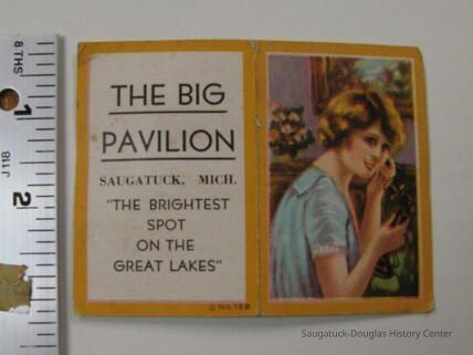 Small needlebook advertising for the Big Pavilion, Saugatuck Mich, "The Brightest Spot on the Great Lakes." Image of young girl with brown bobbed hair wearing a blue short sleeve blouse or dress. She is holding a candlestick telephone. There is a flower arrangement behind her and a landscape painting on the wall.