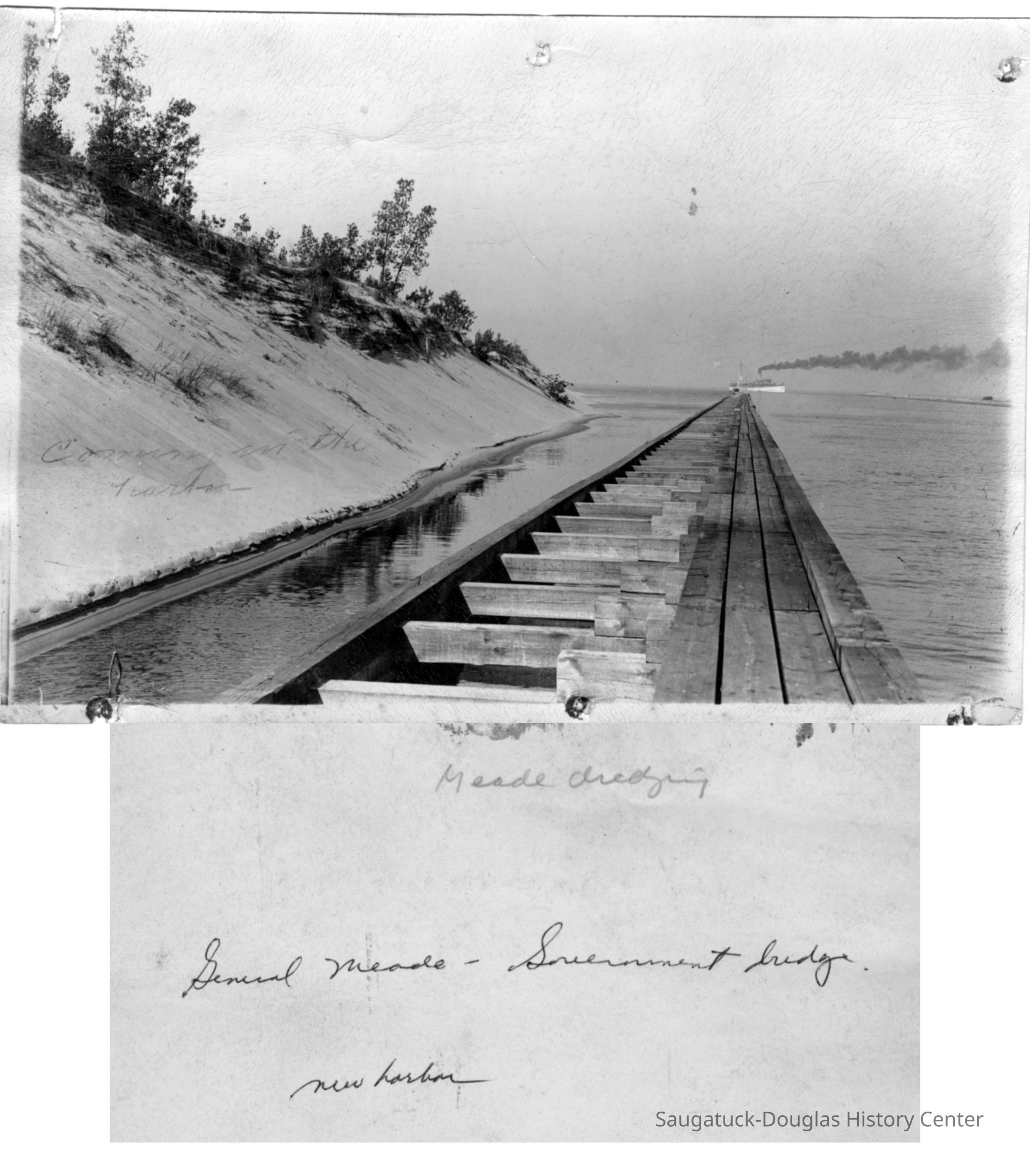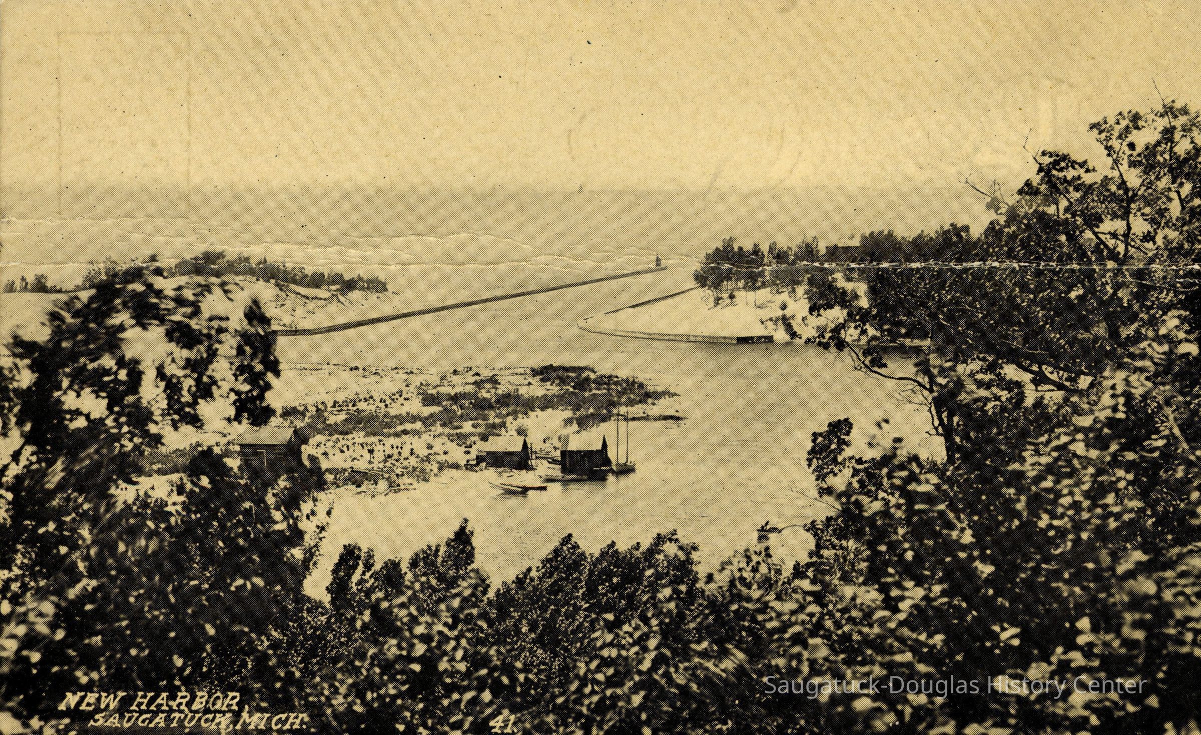 Images of the new Kalamazoo River outlet channel and protective breakwater/piers that were completed in 1904 after much lobbing by Saugatuck townspeople.Photograph Details