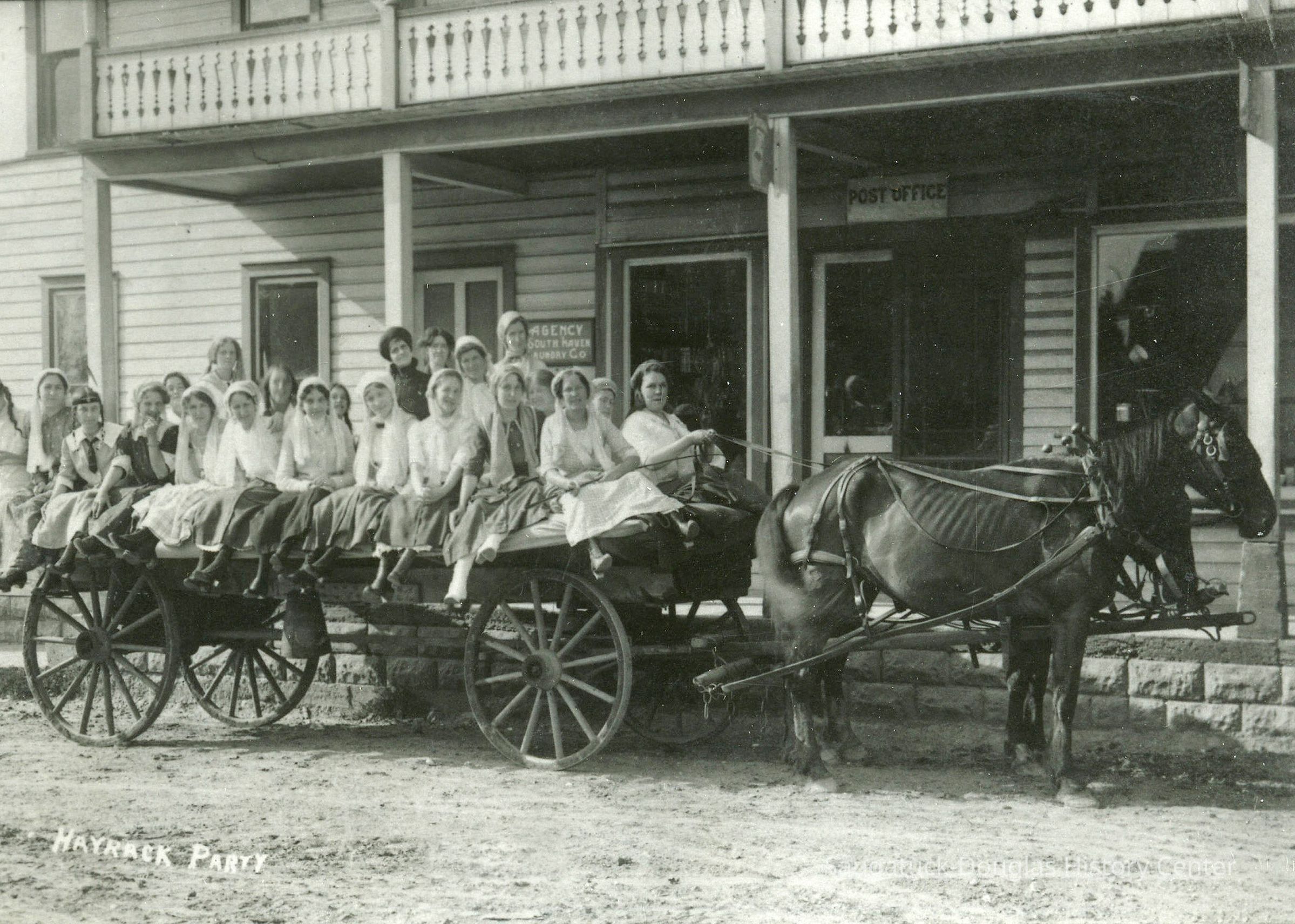 This image was featured as History Mystery #87 with the question "Hayrack party in front of the post office ca 1912. Where was the Post Office?" and the solution "Hayrack party in front of the post office in downtown Glenn ca 1912."Photograph Details