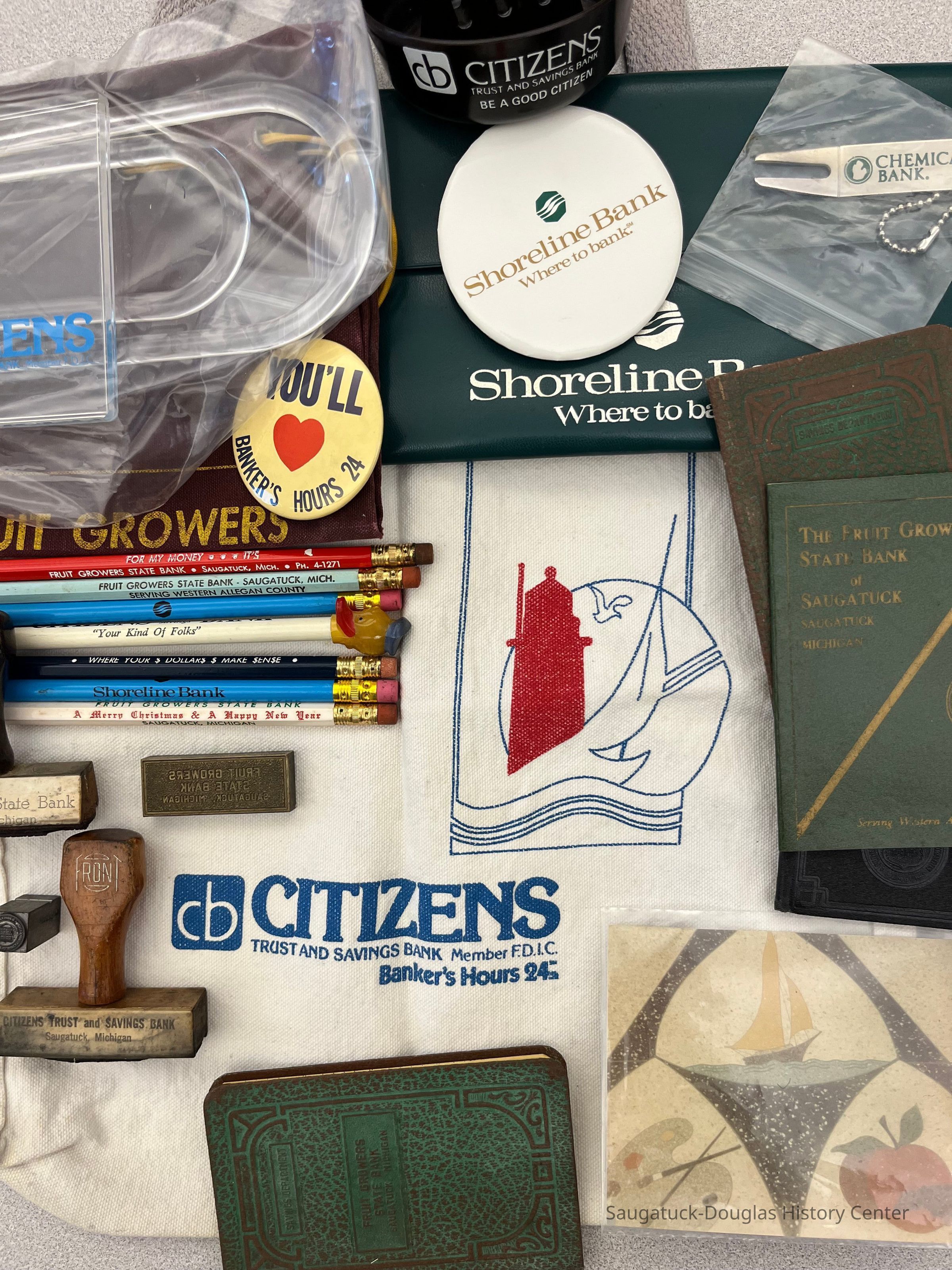 Miscellaneous bank promotional objects from and other items from Saugatuck banks including the Fruit Growers State Bank, Citizens Trust and Savings Bank, Shoreline Bank and Chemical Bank.